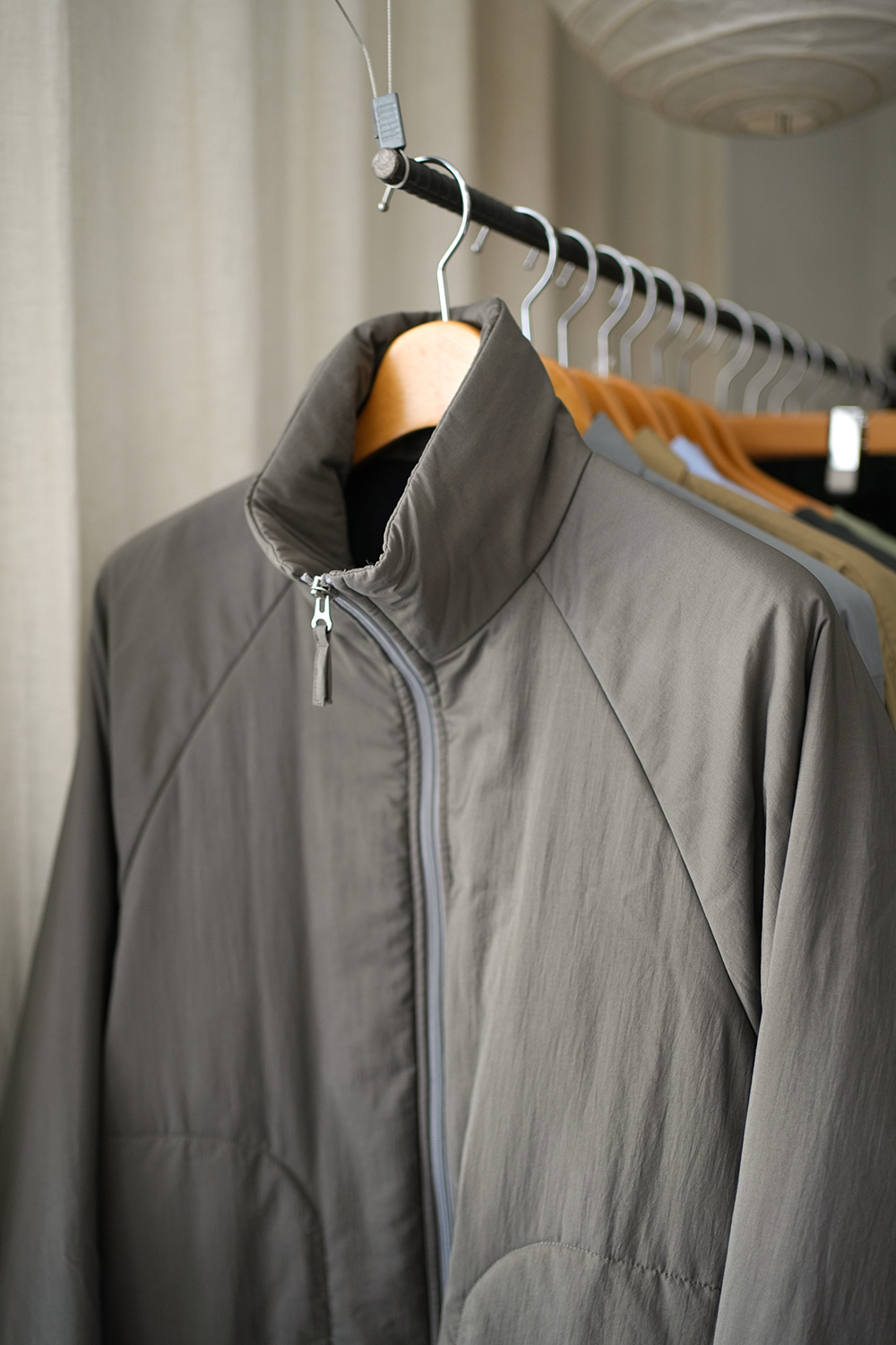 スポーティーなディテールと雰囲気が特徴のジャケット。古着のフリースジャケットをベースにししています。裏地には高密度のナイロンタフタを使用し、軽い着心地と迫力あるシルエットを実現しています。中綿にはウールポリエステルを使用しています。タテ糸に強撚のナイロンウーリー糸、ヨコ糸に無撚のタスラン糸を用いて、やや粗めに織り上げたタフタ素材です。糸の配列から打ち込み密度まで1から設計し、仕上げに特殊なシワ加工を施すことで、まるで天然繊維のような鈍い光沢と膨らみ、合繊素材ならではの軽さと機能性、軽い撥水性も併せ持ったオリジナル素材です。