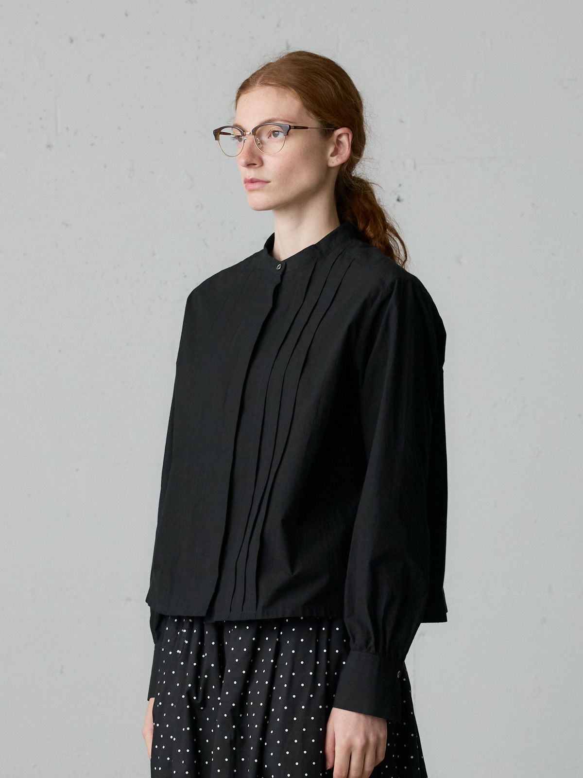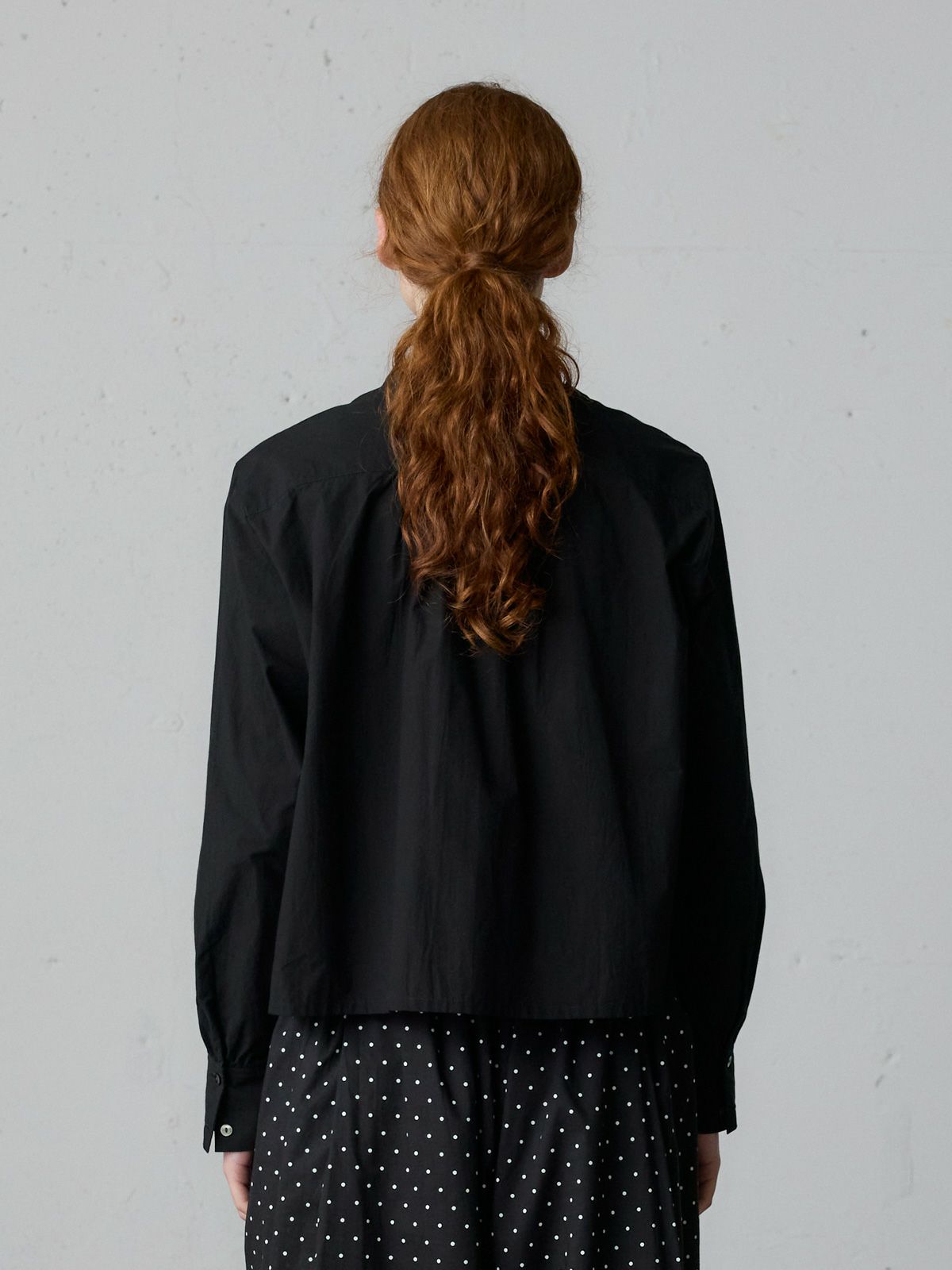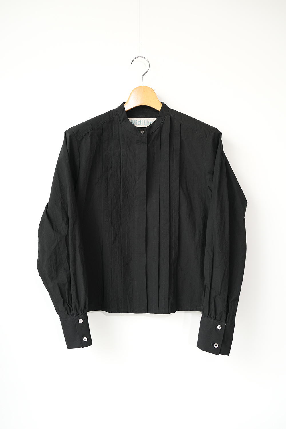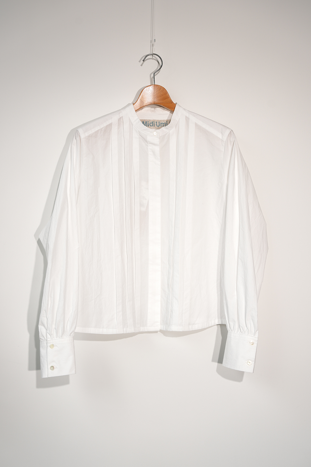 アンティークのワークシャツから着想を得たタックショートシャツ。MidiUmiのNEWアイテムとして季節の変わり目にお勧めの1枚です。ボックスシルエットにし、甘すぎない雰囲気に仕上げました。長めのカフスにすることで、袖をまくった時のシルエットが素敵なシャツです。洗いのかかったヴィンテージ感のあるタイプライターを使用。ヒップに掛かるくらいの丈感なのですっきりと着こなせます。フロントタックのシャープな印象と軽くふんわり感のあるバックシルエットが魅力のシャツです。