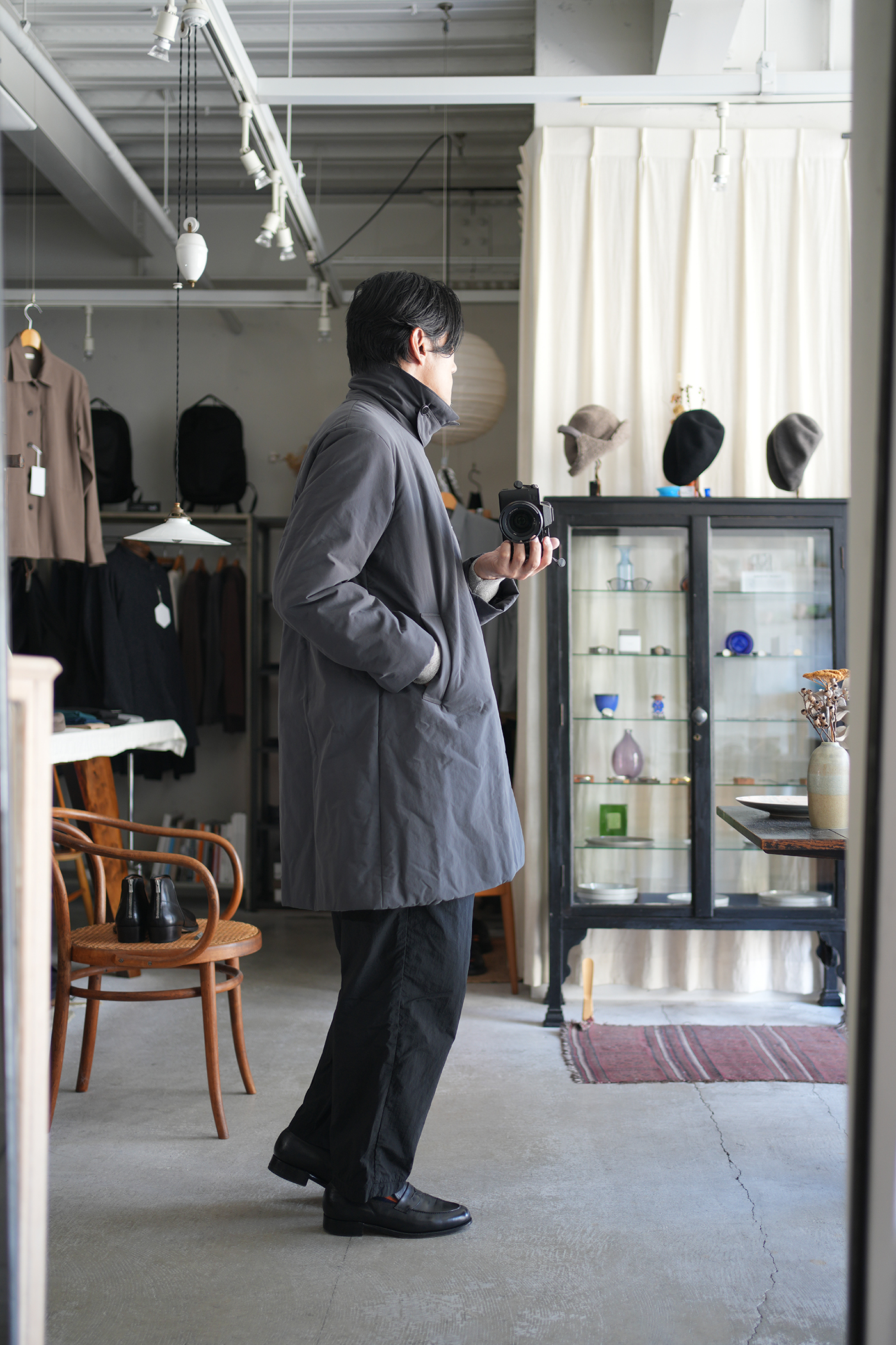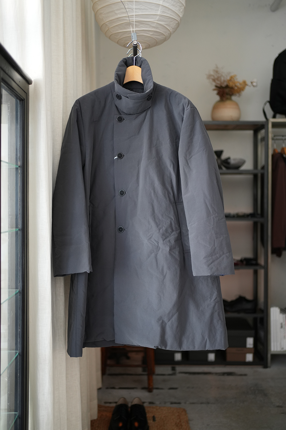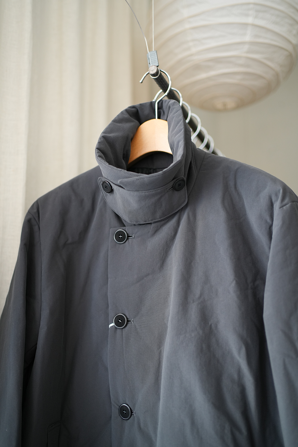 ナイロンに高機能中綿を配した保温性の高いステンカラーコート。軽やかでストレスの無い着心地。
