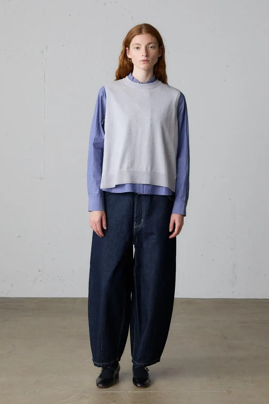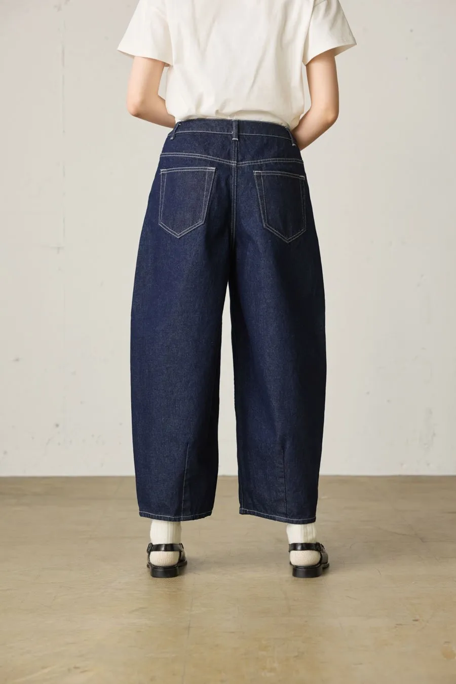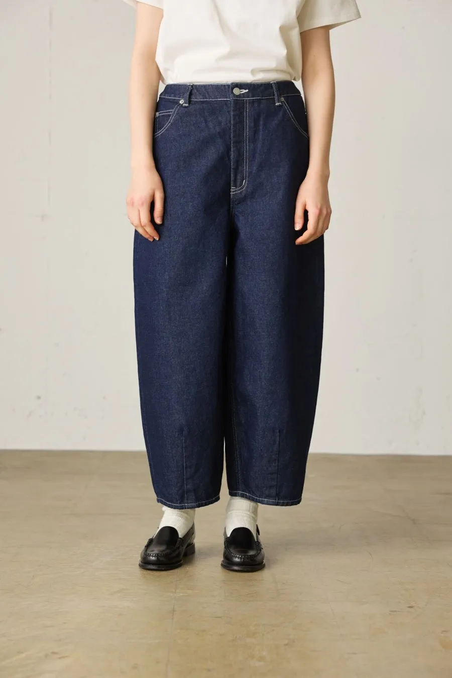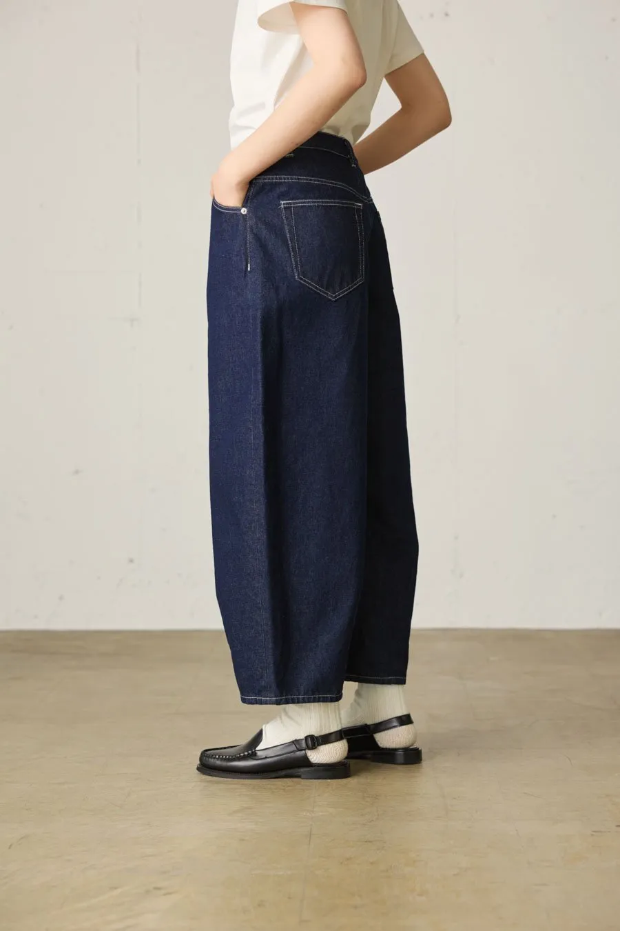 ハイウエストで丸みのあるシルエットが特徴のカーブデニム。ハイウエストでも腰穿きでもコーディネートを楽しんでいただけます。前後に裾ステッチを入れたデザインで裾をロールアップしていただいても素敵です。