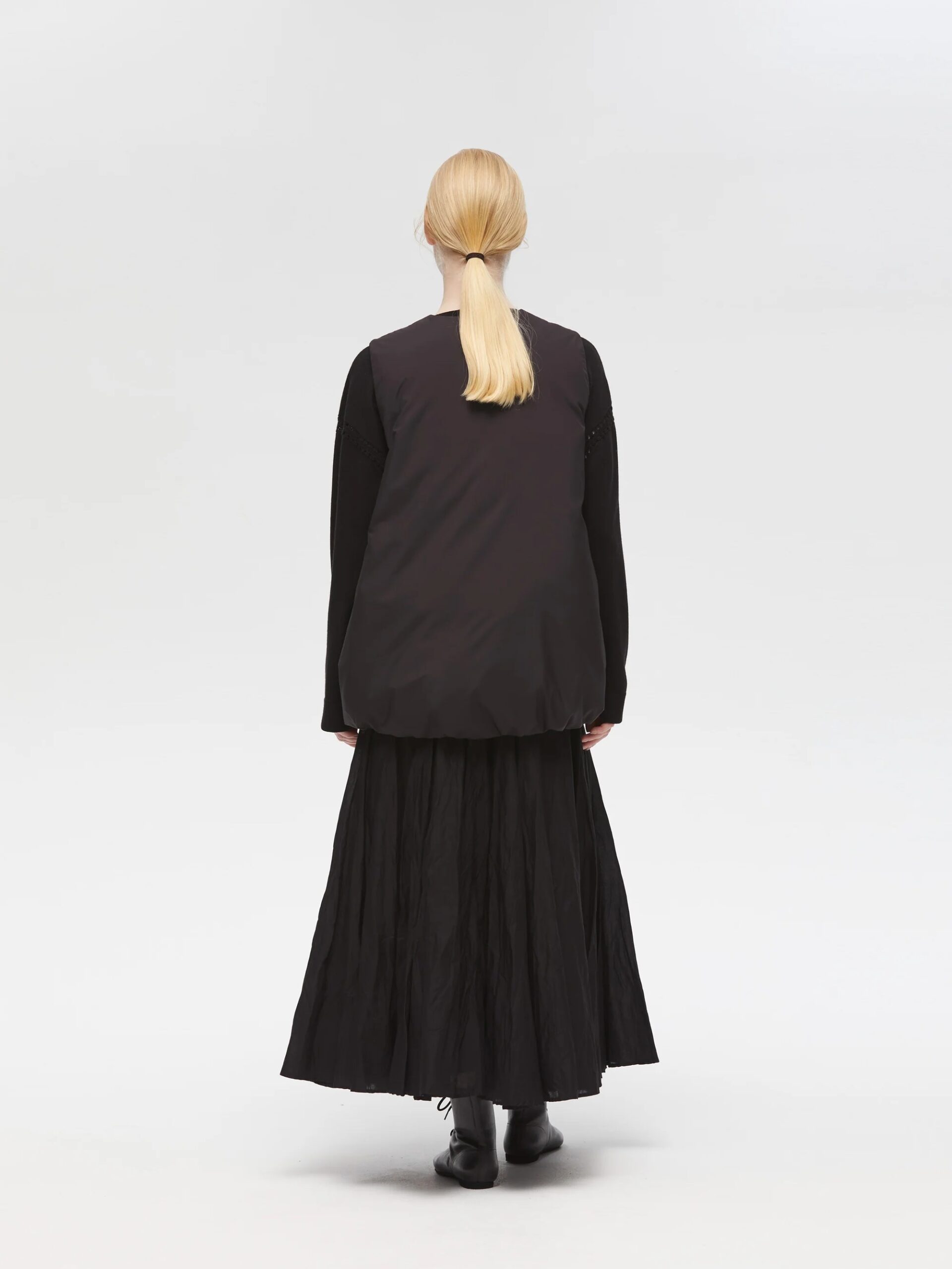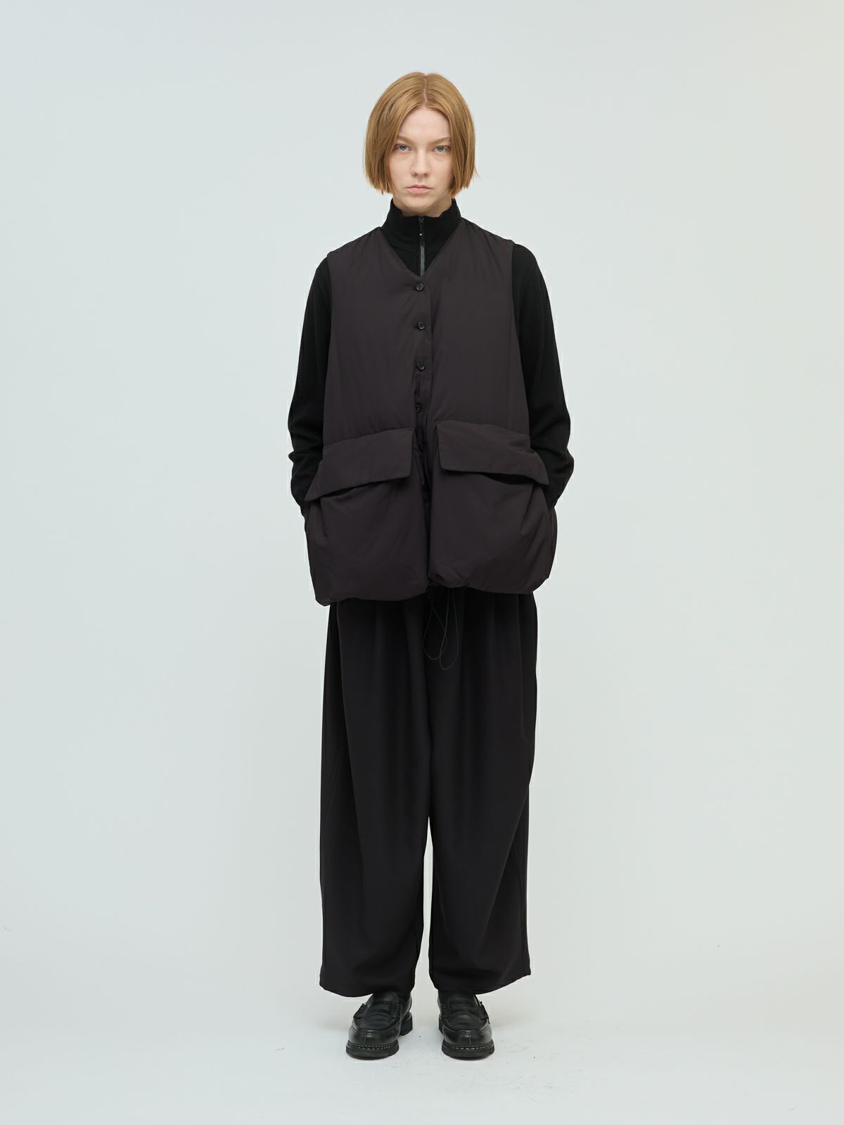 ボリューム感のある立体的なシルエットが魅力のダウンベスト。フロントの大きなポケットはデザイン性と実用性を兼ね備え、サイドからも手を差し込める仕様です。裾のドロストコードでシルエットを調整でき、丸みを持たせたりラフに着こなしたりと自在にアレンジ可能。さりげないボタンディテールがメンズライクなアクセントとなり、トラッドかつモードなスタイルを演出します。軽やかなダウン×フェザー混素材で、防寒性も抜群。羽織るだけでコーディネートに奥行きを加える一着です。