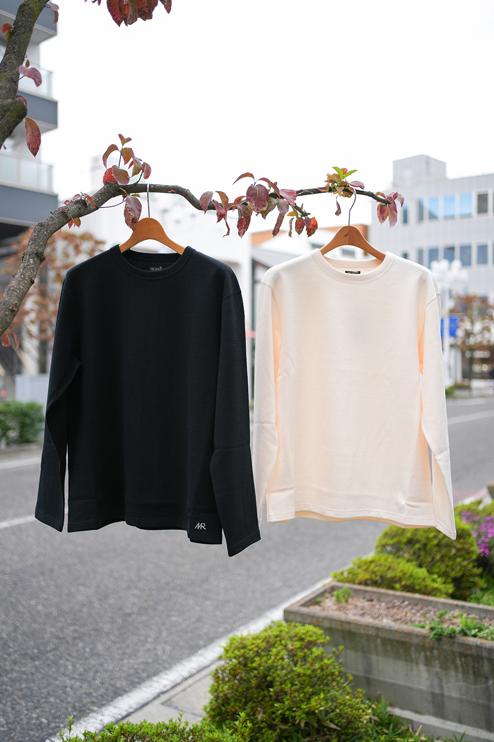 ヘビーデューティーな渾身の素材。引き揃え糸(糸2本を撚らずに並べ、一本の糸とし使用する事)でヘビーウェイトに編み立てた天竺織り。表面の凹凸感、しっかりした肉感を持たせながら着やすい柔らかさにコントロールしています。洗っても洗ってもへたらないタフな素材に仕上がりました。ビンテージを彷彿させるフラットシーマー機で縫製、フラットシーマーは1962年頃にアメリカのユニオンスペシャル社が開発した平面縫製ができるミシンのこと。フラットシーマーを使うことで縫い目の凹凸が無くフラットに縫製できるため、特に生地の厚いもののゴロツキが無くなり、着用時の違和感が無くなります。現代の日本ではフラットシーマーを保有している工場も少なく希少な縫製技術になります。シンプル なのに存在感ある1着、素材の重厚感とフラットシーマーのジグザグステッチ、裾口のMRチェーン刺繍がアクセントになっているアイテム。シンプルなデザインでタフに着れるカットソー。