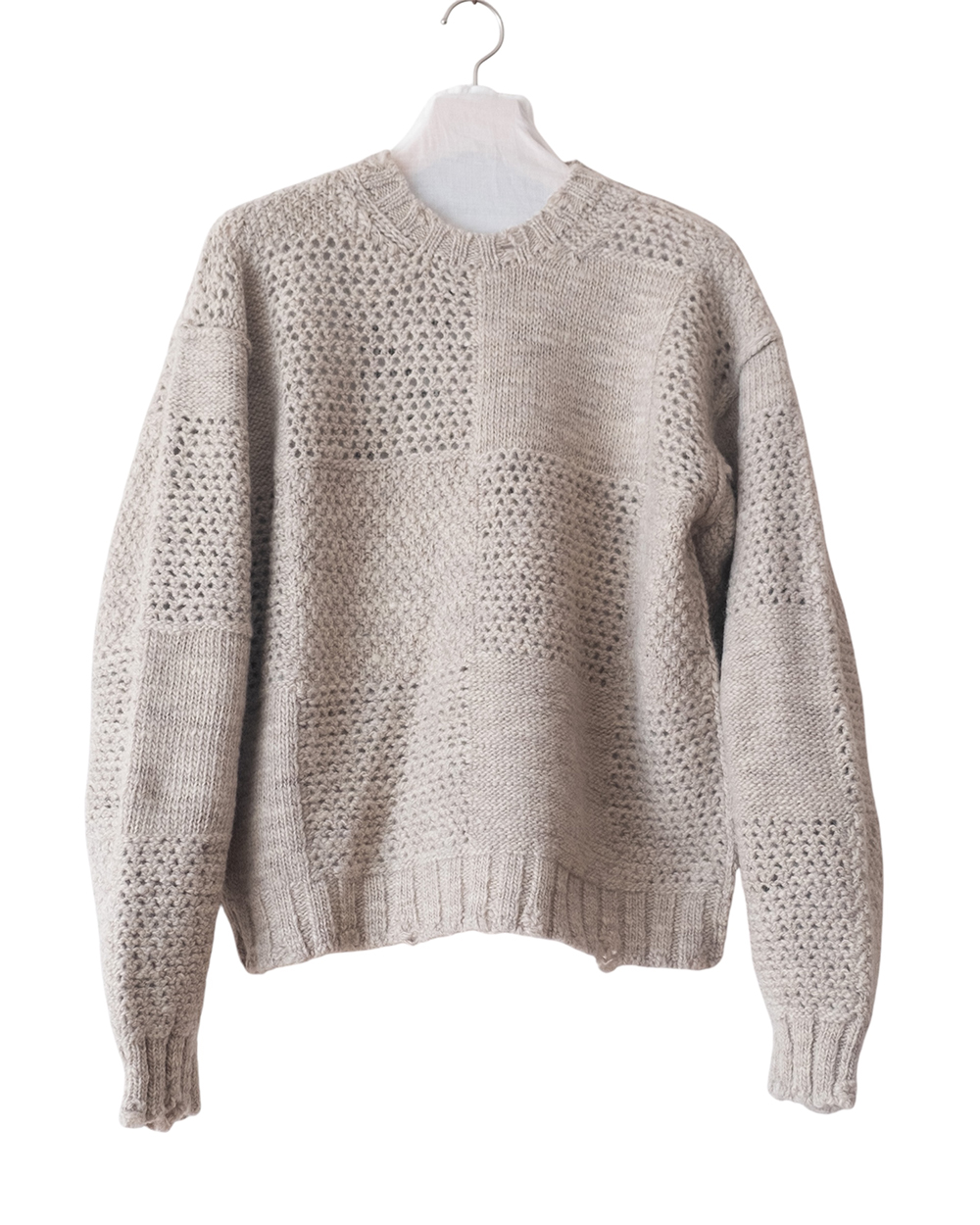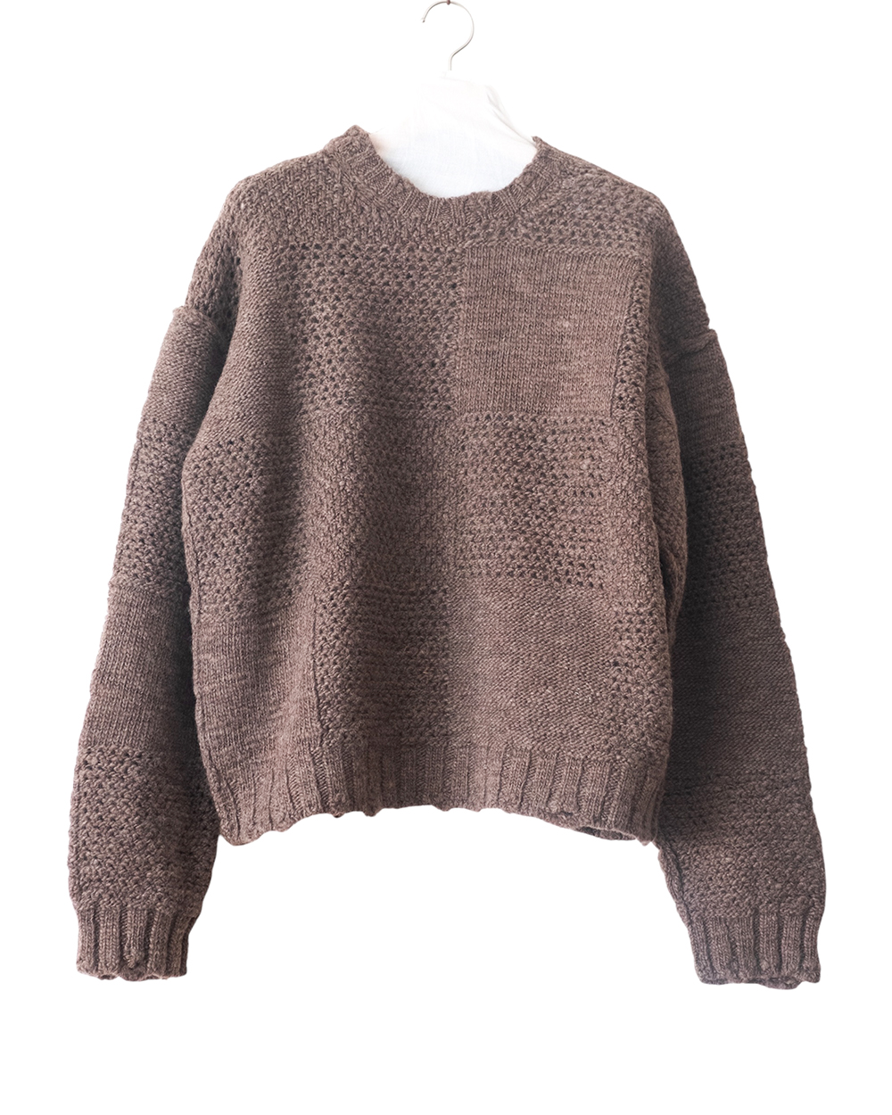 表編み、裏編み、透かし編みをパッチワーク切り替えをしたプルオーバーセーター。各編み地が織りなす独特のテクスチャーと、肩接ぎや袖接ぎ、脇接ぎといった接ぎ⽬部分をあえて表側に出しリンキングしているため、表裏ひっくり返したようなデザインになっています。袖⼝や裾にダメージ加⼯を加えることで、着古した表情のあるアイテムに仕上げています。素材には、ウルグアイ産の天然⾊の⽺⽑スラブヤーンを採⽤。染料や助剤を⼀切使⽤せず、⽺⽑そのもののナチュラルな⾊合いや⾵合いなど魅⼒を最⼤限に活かした素材です。