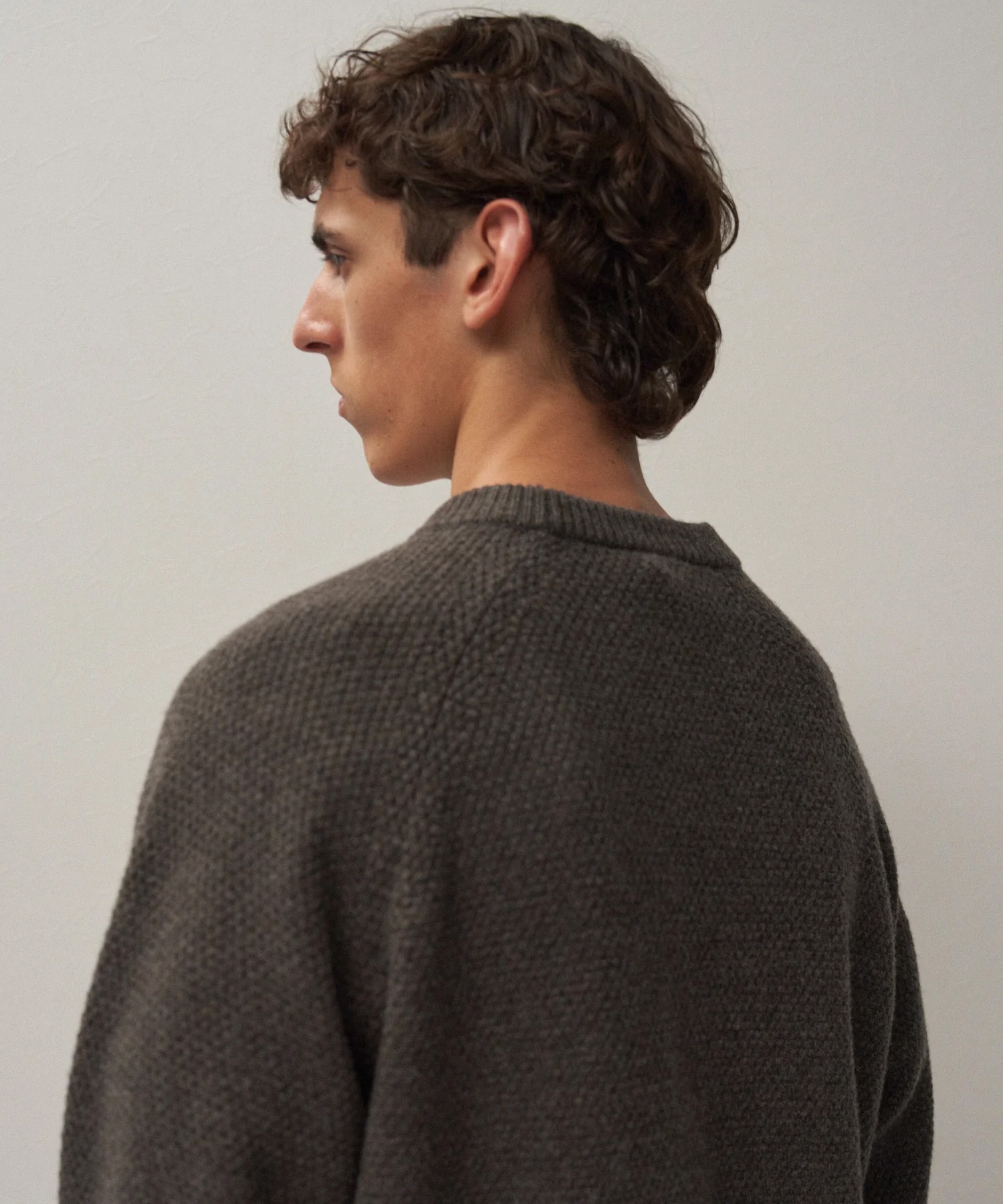 程良いリラックス感が特徴のラグランスリーブのクルーネックセーター。7ゲージを採用し、適正度目で膨らみある着心地に仕上げました。表情ある鹿の子組織が特徴です。衿は、リブダブル付けを採用しています。裾のリブが締まりすぎておらず、カットソーのようなシルエットを採用しています。オーストラリア産の、光沢がありソフトで軽く、嵩高性に富んでいるラムウールを原料とした糸を強撚にしたニット素材です。原料の特性と編地の表情感がマッチした、非常に軽く、ソフトでスポンジッシュな素材です。
