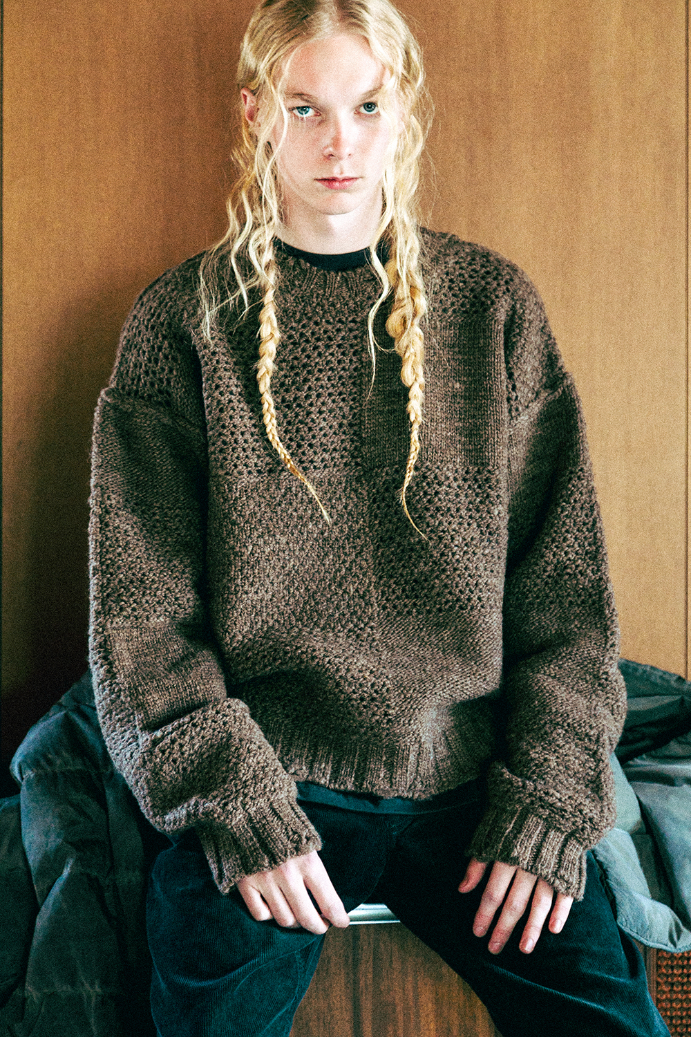 表編み、裏編み、透かし編みをパッチワーク切り替えをしたプルオーバーセーター。各編み地が織りなす独特のテクスチャーと、肩接ぎや袖接ぎ、脇接ぎといった接ぎ⽬部分をあえて表側に出しリンキングしているため、表裏ひっくり返したようなデザインになっています。袖⼝や裾にダメージ加⼯を加えることで、着古した表情のあるアイテムに仕上げています。素材には、ウルグアイ産の天然⾊の⽺⽑スラブヤーンを採⽤。染料や助剤を⼀切使⽤せず、⽺⽑そのもののナチュラルな⾊合いや⾵合いなど魅⼒を最⼤限に活かした素材です。
