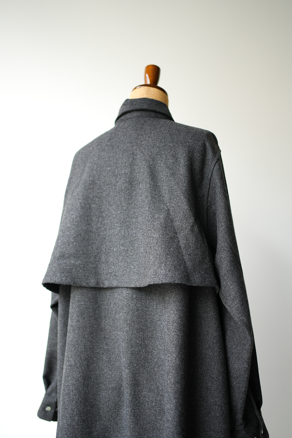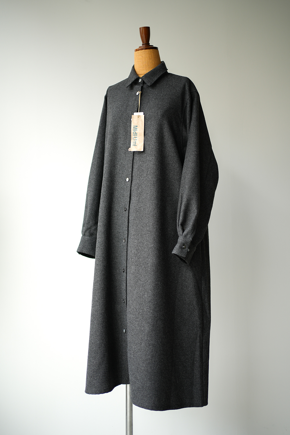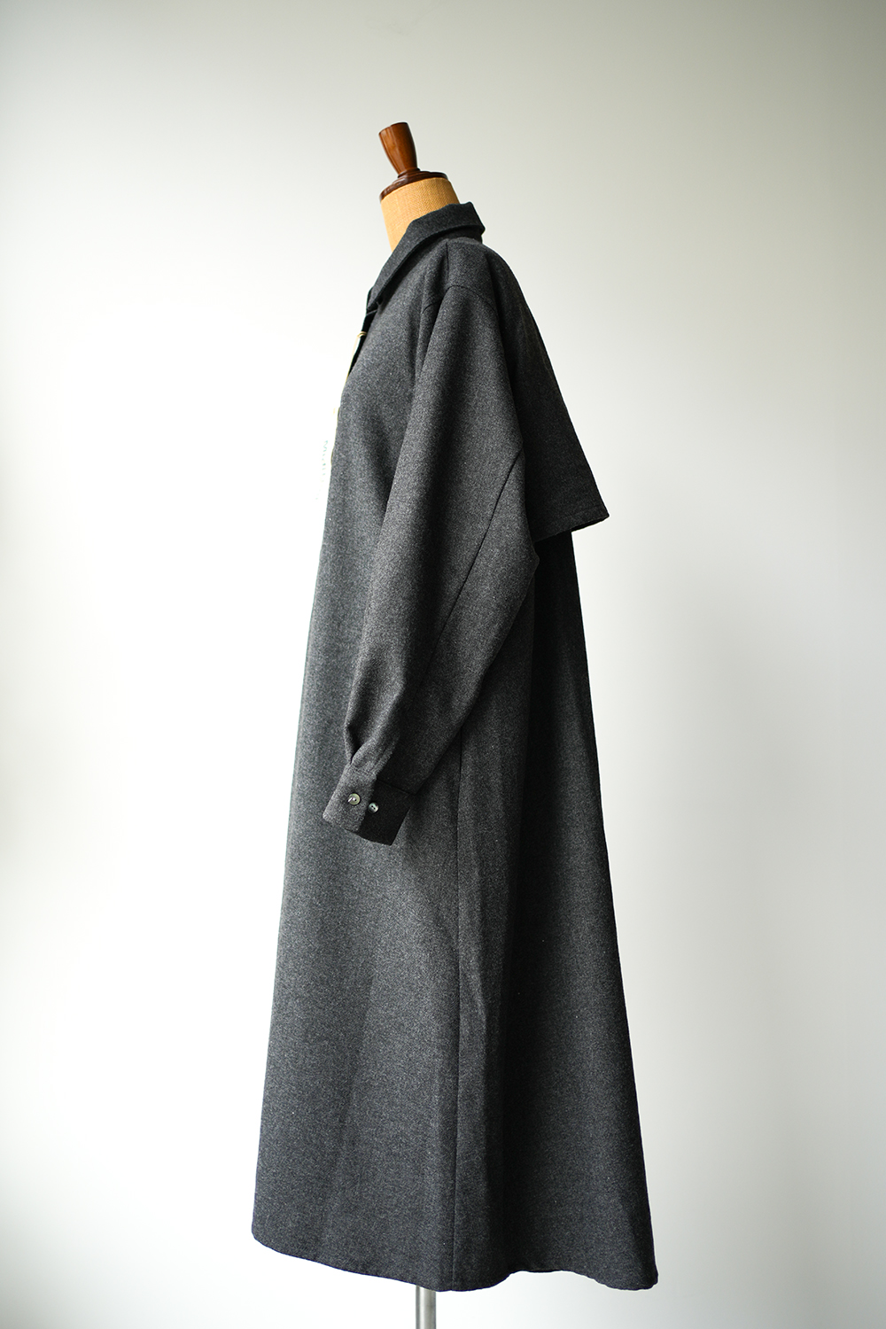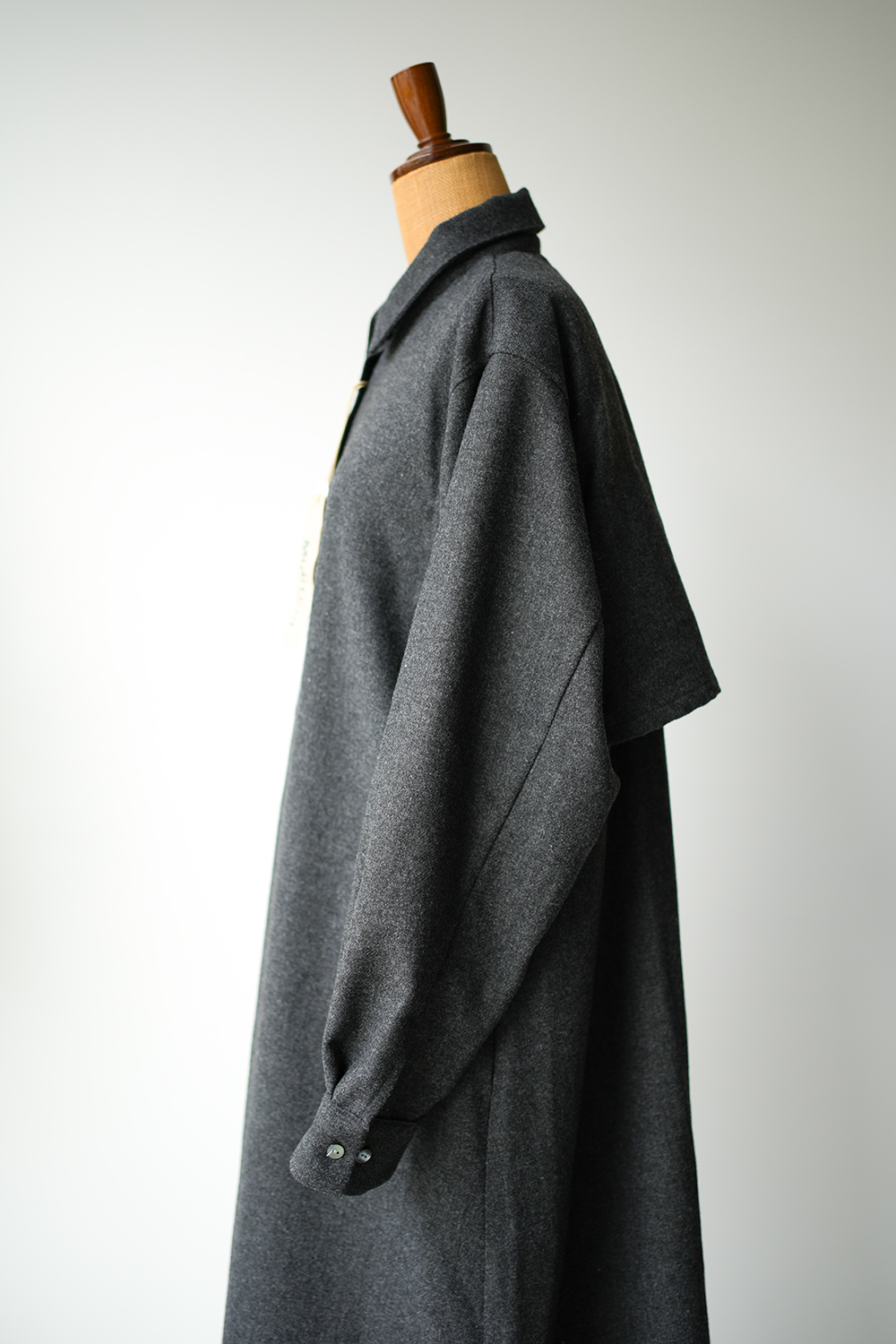 人気のコートワンピースをより“コートらしさ”のある仕上がりにアップデート。ウール混の薄手フラノ素材を使用し、軽やかさとあたたかみを兼ね備えた一枚です。程よくゆとりのあるシルエットで、前を開けて羽織としても、ボタンを留めてワンピースとしても着用可能。着こなし次第で季節の変わり目から冬のはじまりまで、ロングシーズン活躍します。