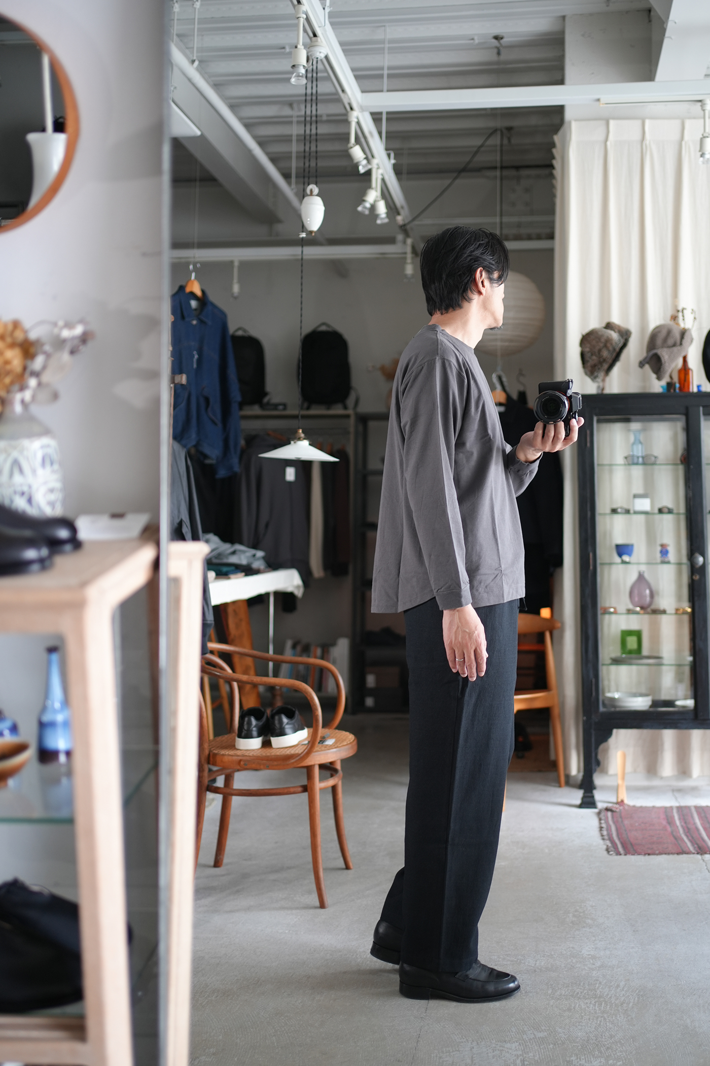 ソフトな風合いと、表面の毛羽感や細かな凹凸が特徴ウールサージ。生地の仕上げにかけたワッシャータンブラー加工で程よいカジュアル感を表現しました。シャンブレーブラックは経糸が黒、緯糸がトップダークチャコールを使用し、白い横筋が見える特徴的な色味。コクーンシルエットのワイドパンツ、ウェストゴムと紐仕様。