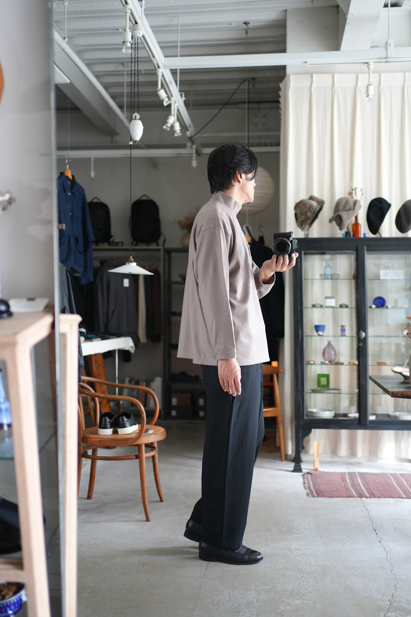 ソフトな風合いと、表面の毛羽感や細かな凹凸が特徴ウールサージ。生地の仕上げにかけたワッシャータンブラー加工で程よいカジュアル感を表現しました。シャンブレーブラックは経糸が黒、緯糸がトップダークチャコールを使用し、白い横筋が見える特徴的な色味。コクーンシルエットのワイドパンツ、ウェストゴムと紐仕様。