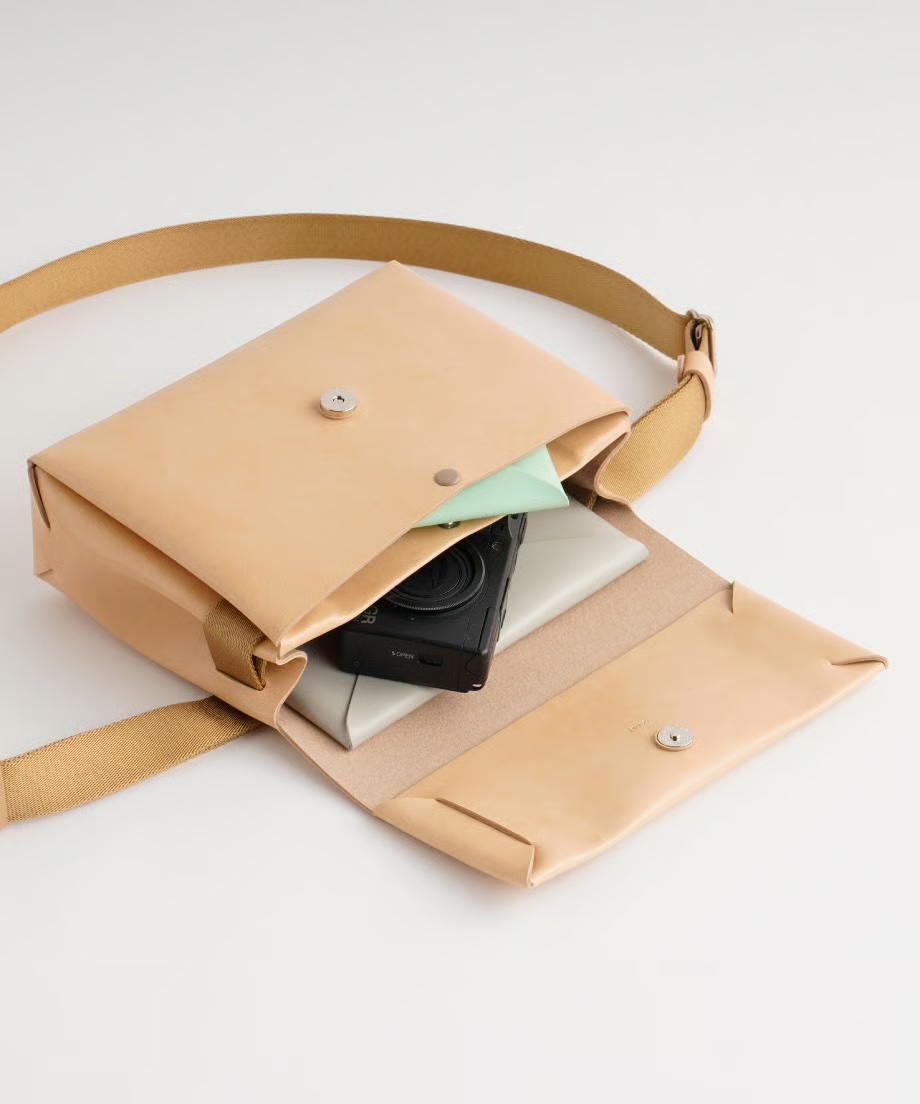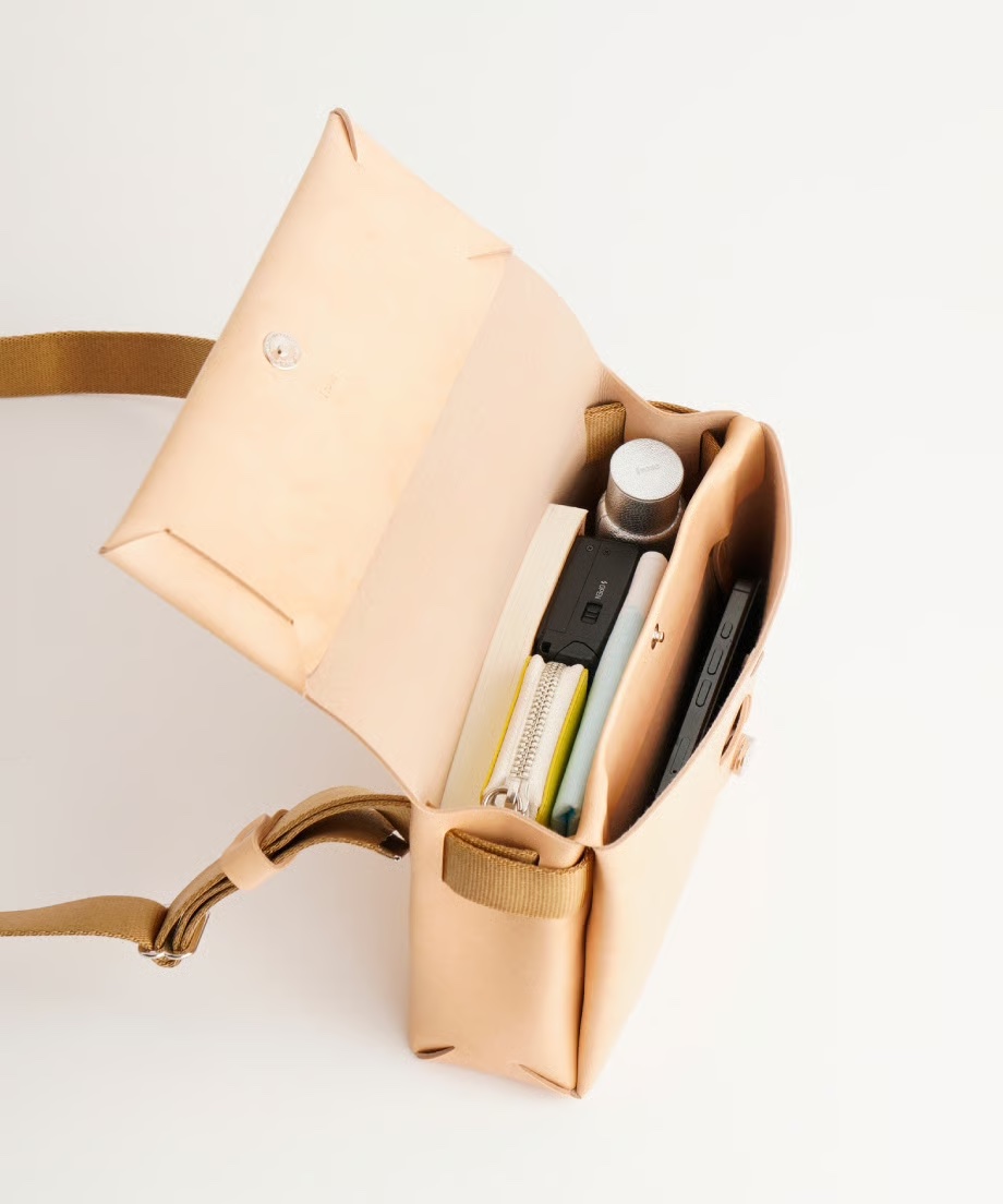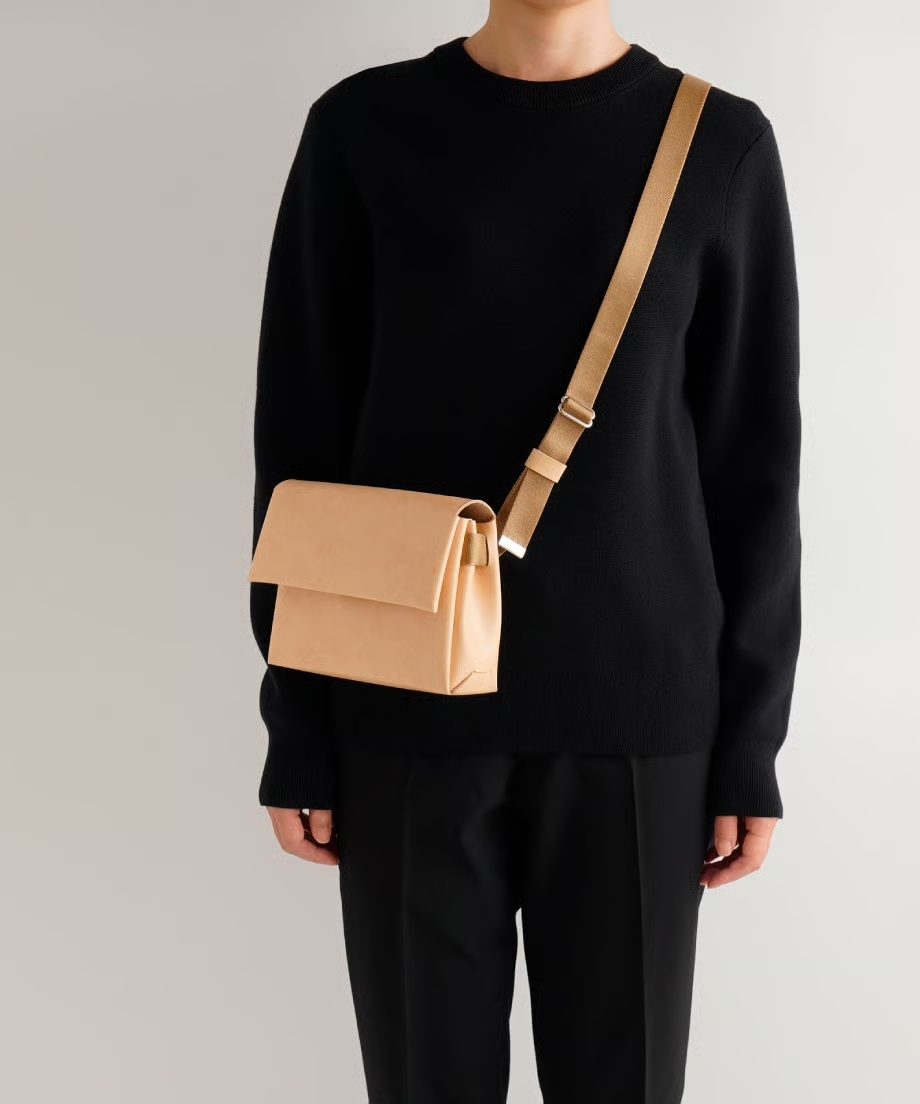 カットしたパーツを縫製せずに折り込んで組み立てたシームレスシリーズ、新型ミニショルダーバッグ。スマートフォン、財布、ポーチ、など普段使いの荷物が入る実用的で普段使いに最適なサイズ感です。前側のポケットには小物、スマートフォンなどを収納できます。高品質な人工皮革(PU素材)を使用しています。軽量で耐久性に優れており、汚れや雨にも強く、普段使いしやすい実用的な素材です。