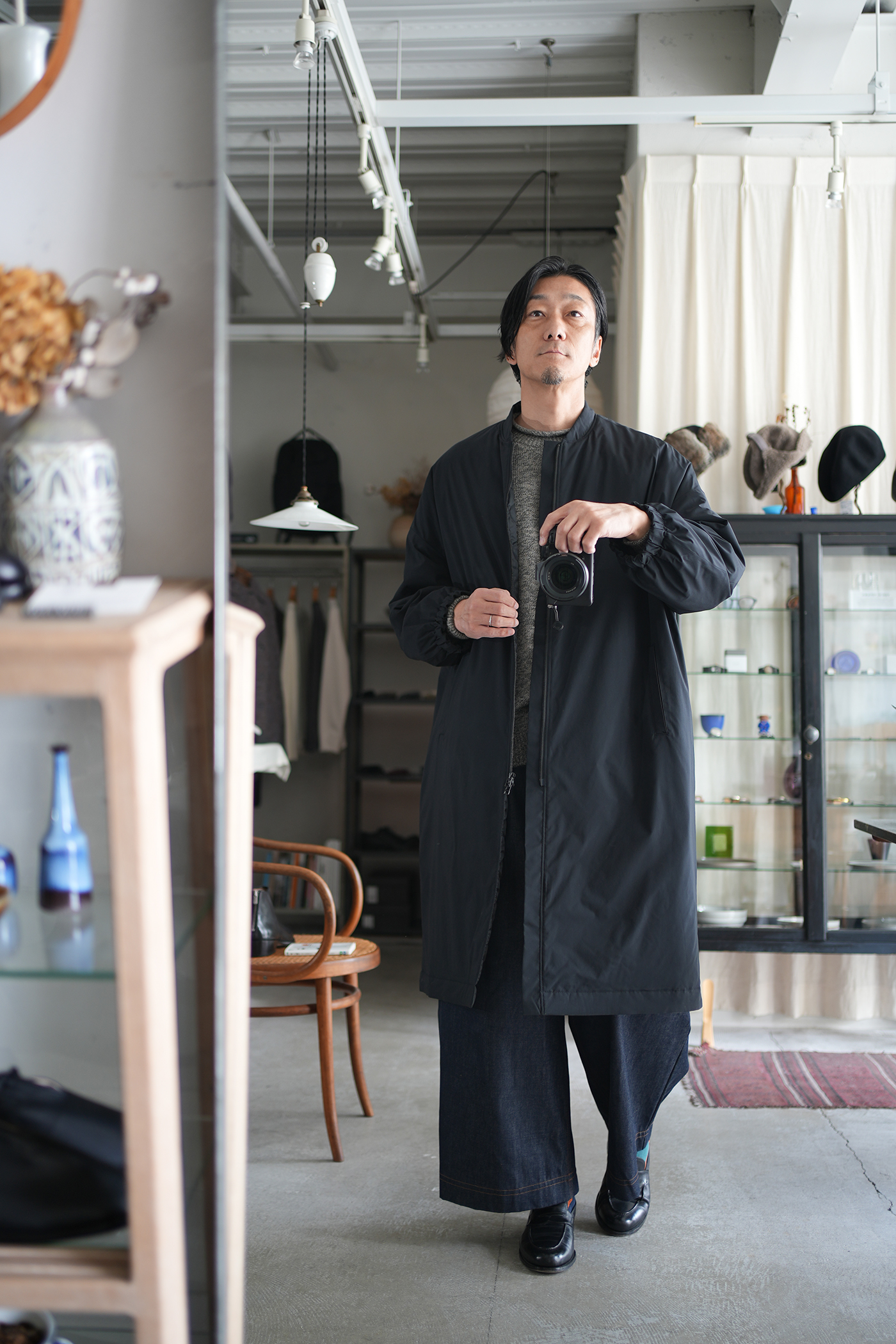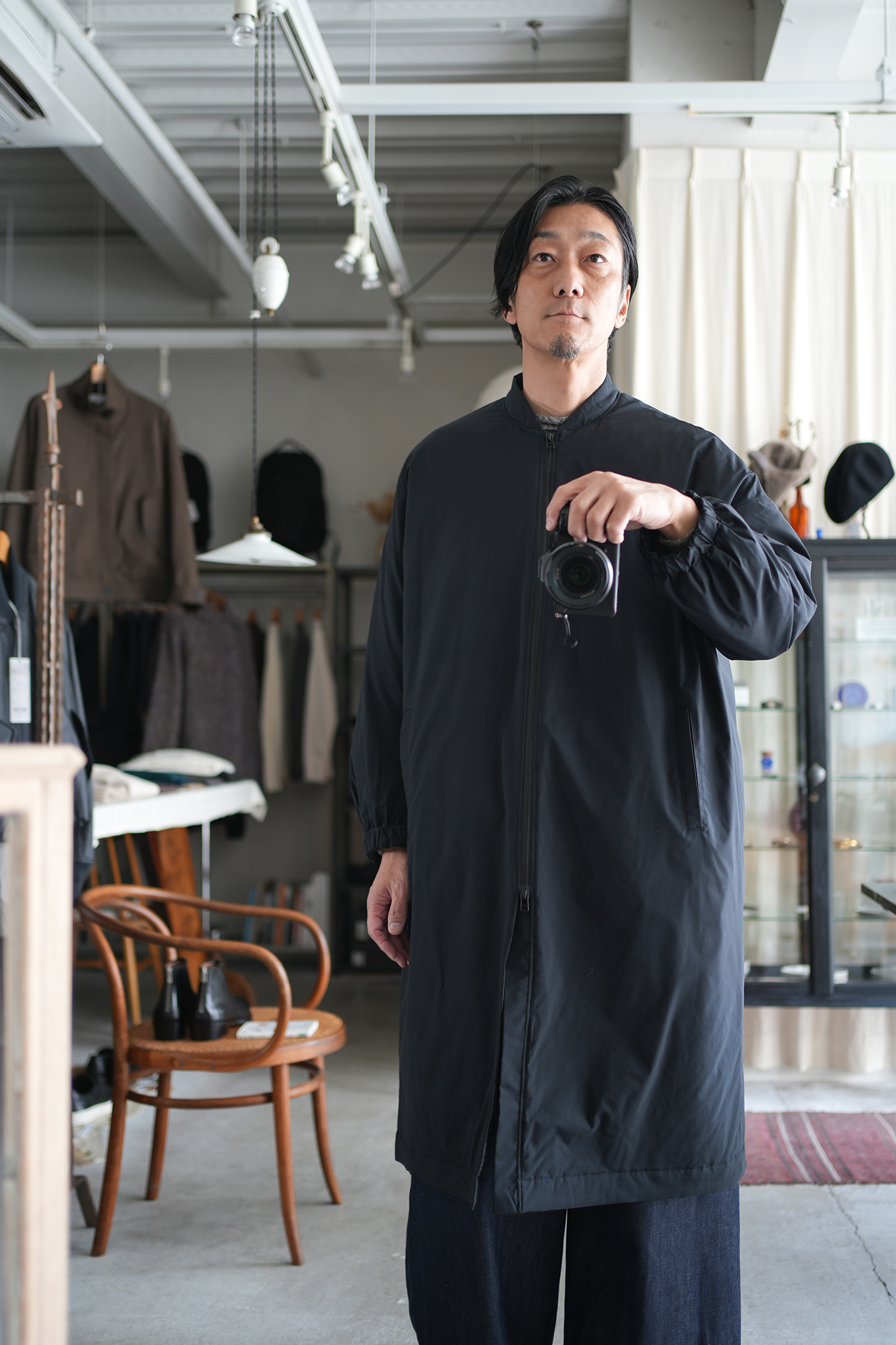 強い撥水性を持ったポリエステル糸を使用したウェザー生地、ストレッチ性があり軽量でとても扱いやすい生地です。中綿は三菱ケミカルのコアブリット。襟を共地にてブルゾンデザインであるリブカラーで仕上げたロングコート、軽くて丈夫、皺になりにくく撥水性があり、暖かい、生地と中綿の特性を活かした気軽にスタリングいただけるロングコートに仕上がっております。