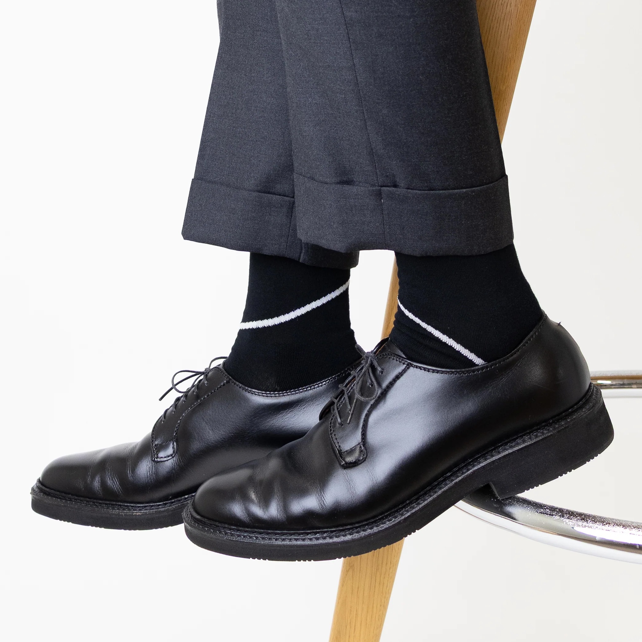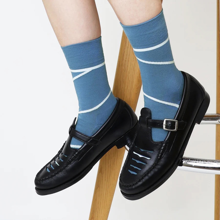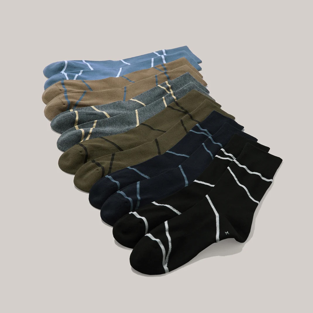皆川明さんとのコラボレーションデザイン、定番シリーズ「LINE」と通じるデザインをテーマに「WIND」というフレーズを皆川さんから提案していただきました。そして皆川さんのスケッチや言葉から「WIND」のイメージを更に広げていきました。着用した時に螺旋が美しく見えるバランスを模索し、始まりから終わりの位置、間隔や角度にいたるまで皆川さんと何度もディスカッションを重ね完成しました。靴下の左右でデザインを反転させており、履き方や角度によって異なる表情を見せます。「LINEから派生したWINDは軽やかに足を舞う風のようなイメージ」と皆川さん。