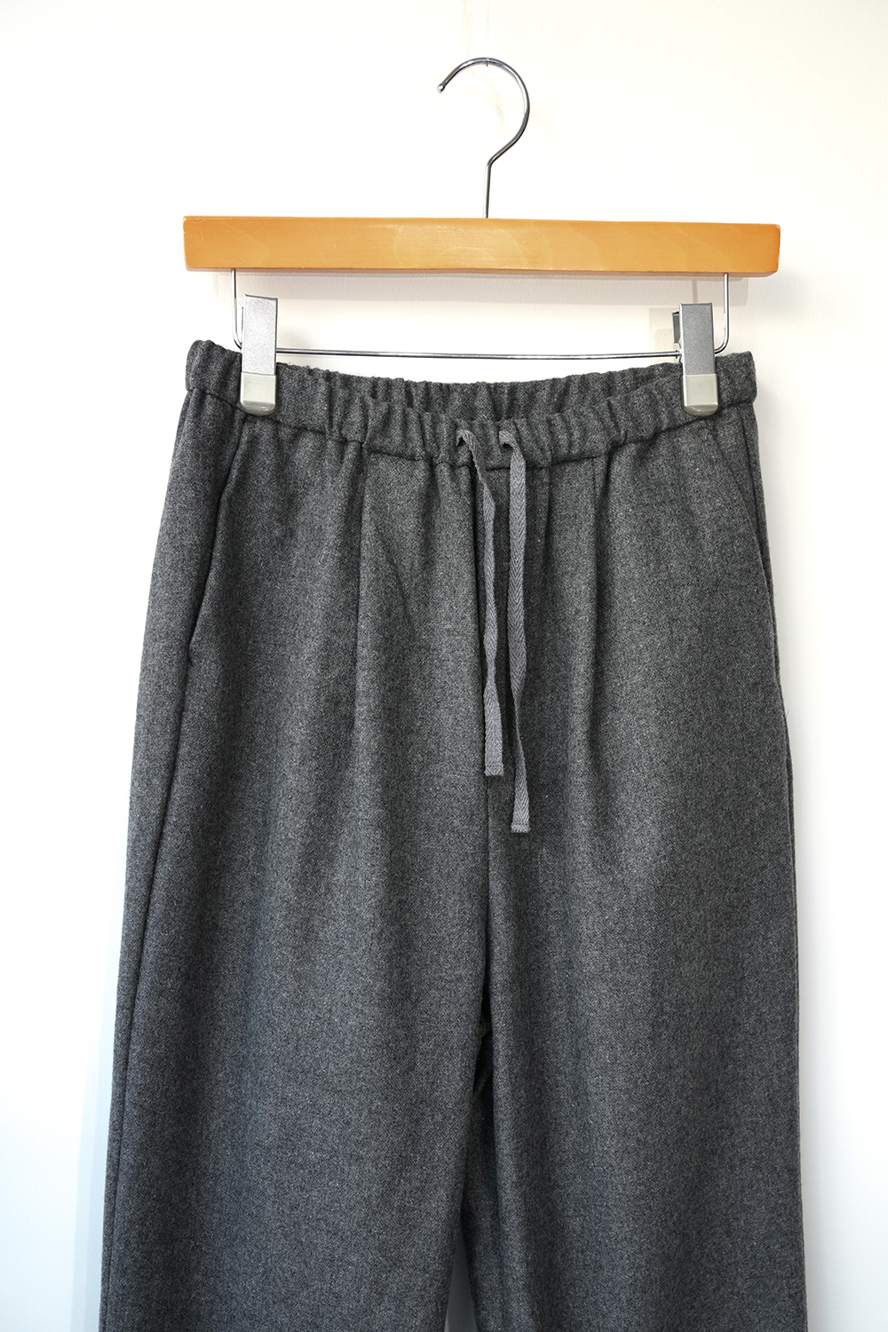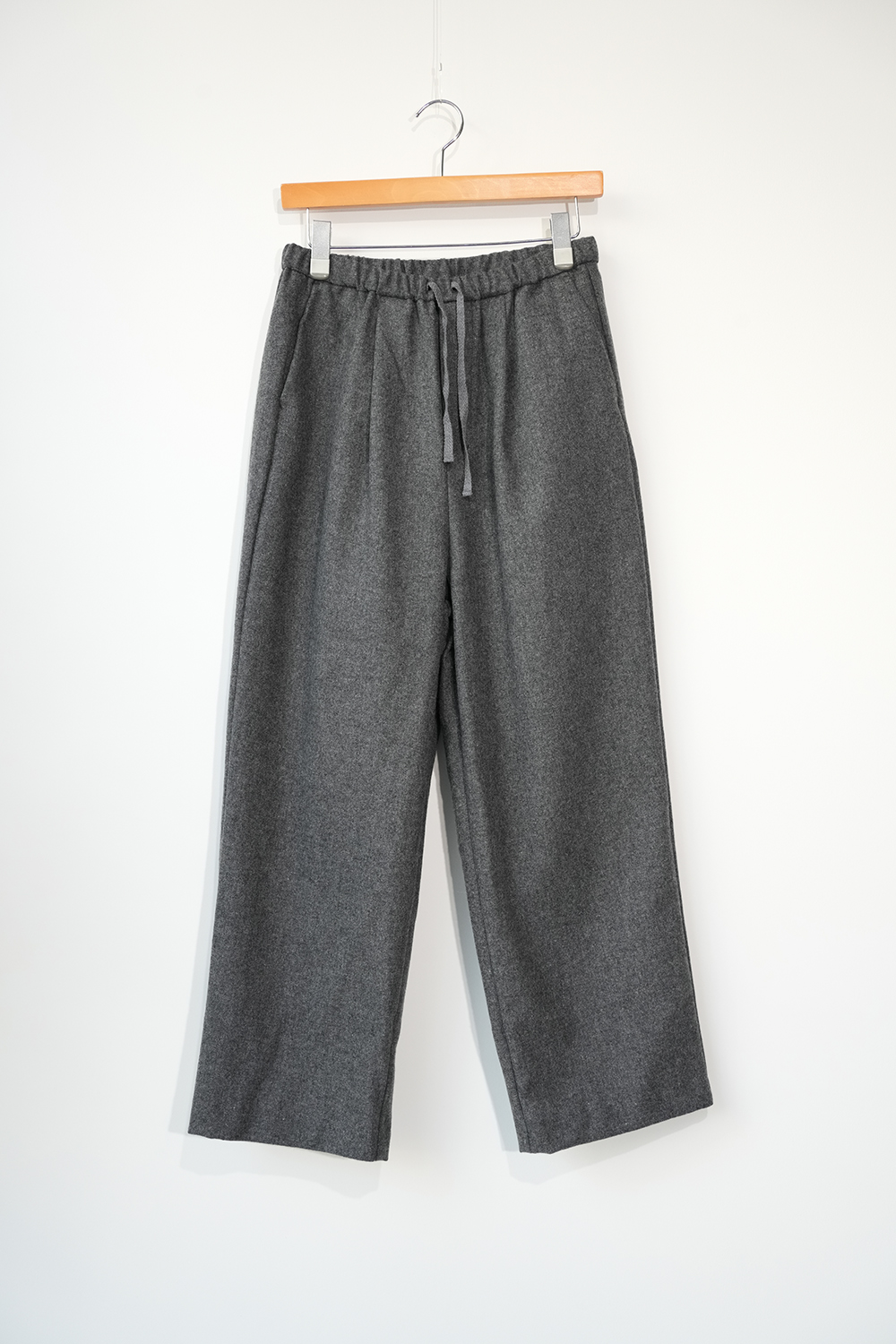 尾州地域で織り上げたウールツイード素材。軽く、程よく柔らかく暖かい素材です。ツイード特有のキレイさとカジュアルな雰囲気を生かしたデザインに仕上げました。太めストレートパンツ。あえて表からウエスト紐を出してカジュアルな雰囲気に。
