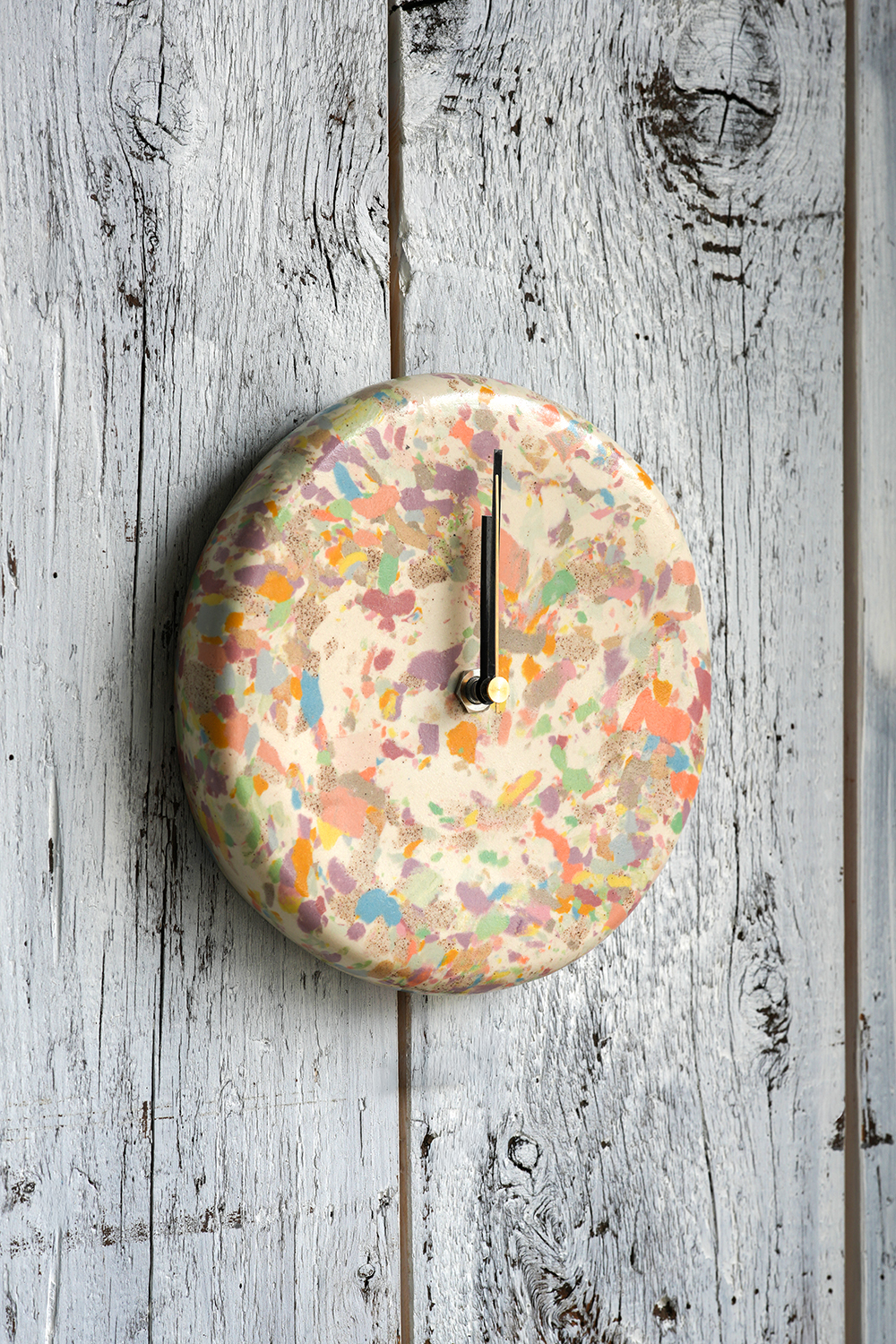 丸みのあるもっちりしたフォルムの掛け時計。色彩美しいカラーチップ釉薬の文字盤は壁に掛けるアートの様。