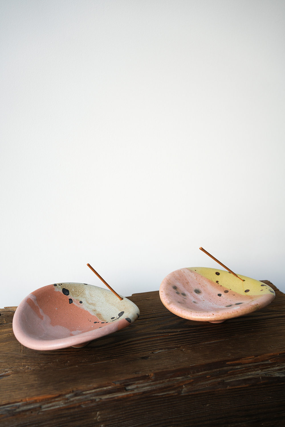 陶芸家 竹村 良訓さん、お香立て 2025.10.24 <HOUSEHOLD> 陶芸家 竹村 良訓さん作、お香立て入荷。 高台から滑らかに立ち上がり穏やかにたわむ、お香を指す穴が1箇所、灰が溜まりやすい様適度な窪みもつフォルム。2トーンの釉薬に飛ばしの釉薬と薄雲の様な白い釉薬が漂う色合い。フォルムと彩りからお香を楽しむ時間がよりゆったり休まる時間となる作品です。 「竹村 良訓」 お香立て ¥8,800- サイズ/幅長辺16cm(短辺15cm)×高さ5.5cm 素材/磁器