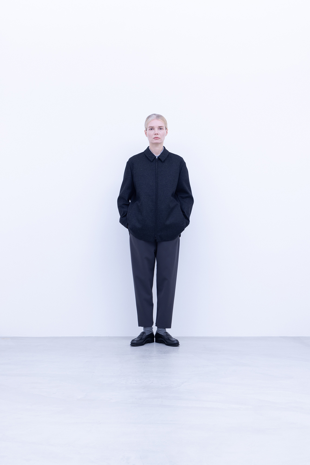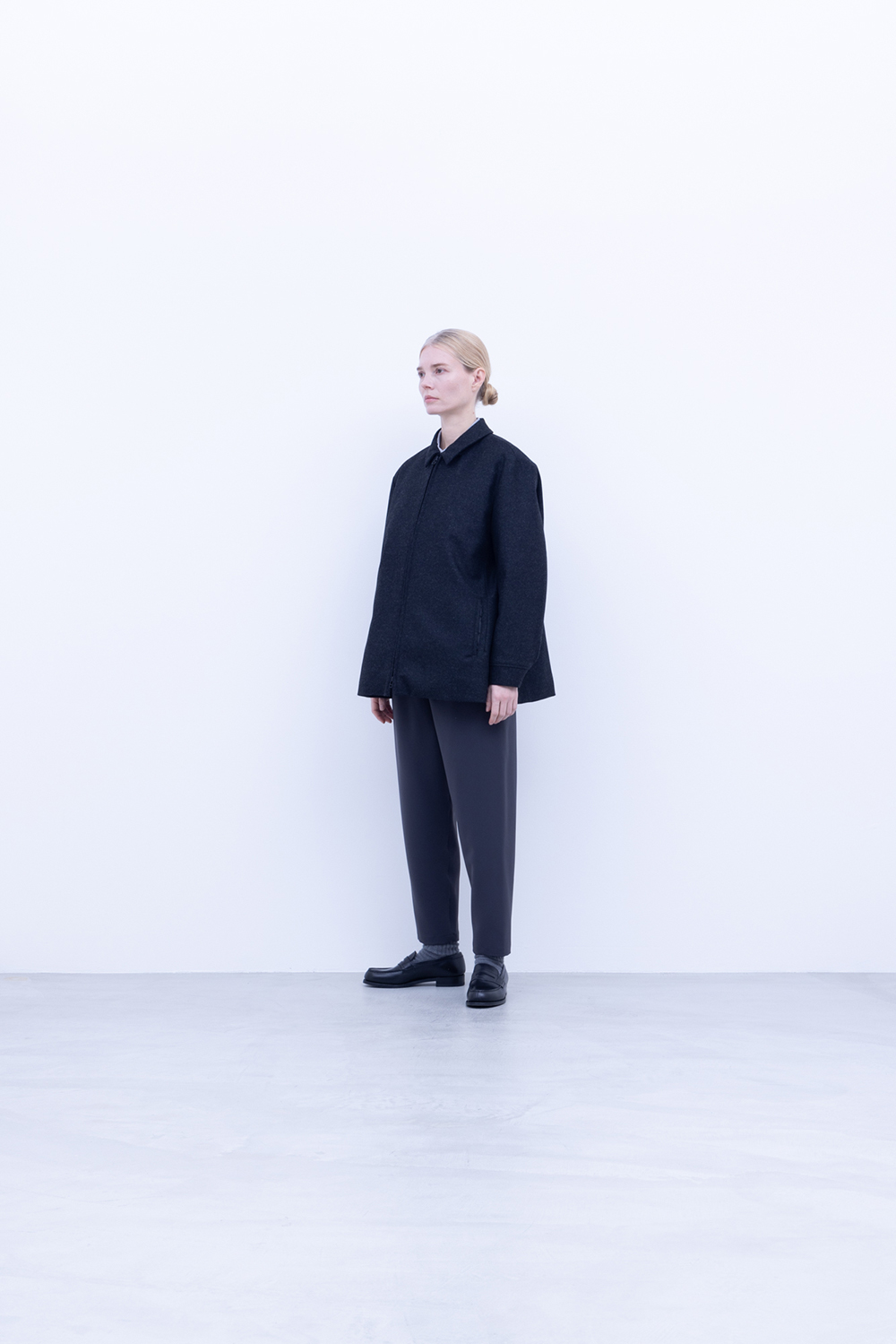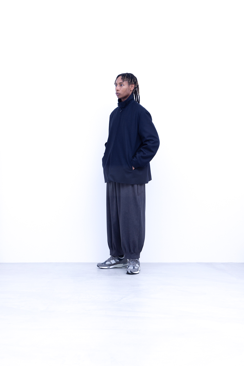 スタンダード高密フラノ生地、メルトンよりも軽量でアウター類には芯地をボンディングししっかりとしたハリと防風機能を高めています。ドリズラージャケット、ステンカラー、立ち襟仕様、総裏仕立て、中生地に高機能暖房素材コマサーモをキルティングで配す。