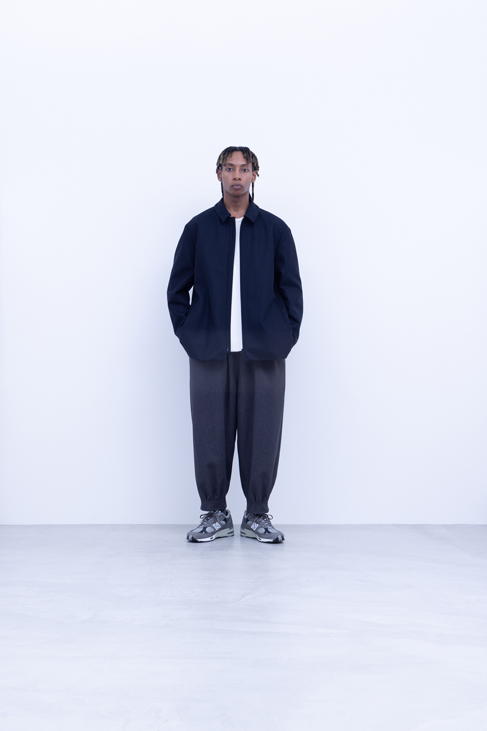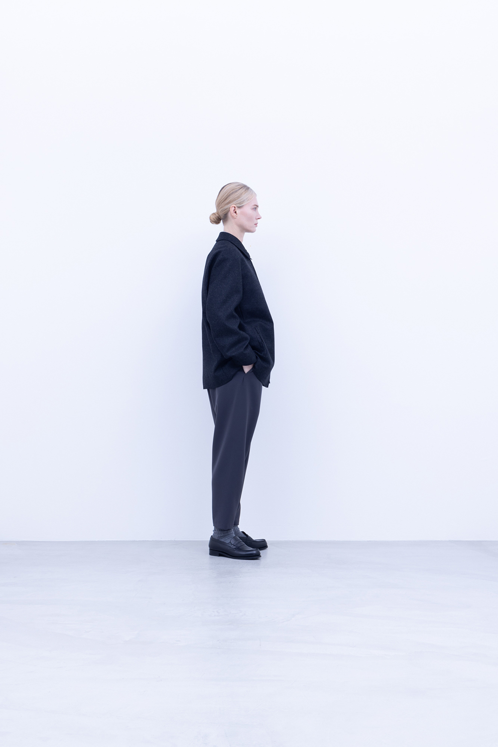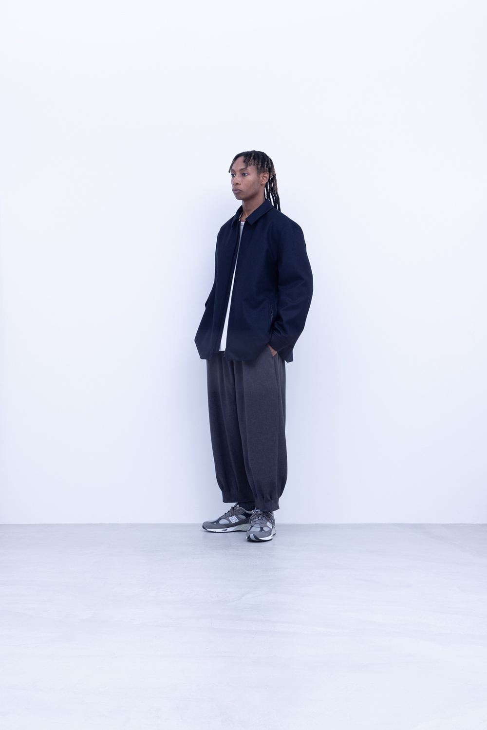 スタンダード高密フラノ生地、メルトンよりも軽量でアウター類には芯地をボンディングししっかりとしたハリと防風機能を高めています。ドリズラージャケット、ステンカラー、立ち襟仕様、総裏仕立て、中生地に高機能暖房素材コマサーモをキルティングで配す。