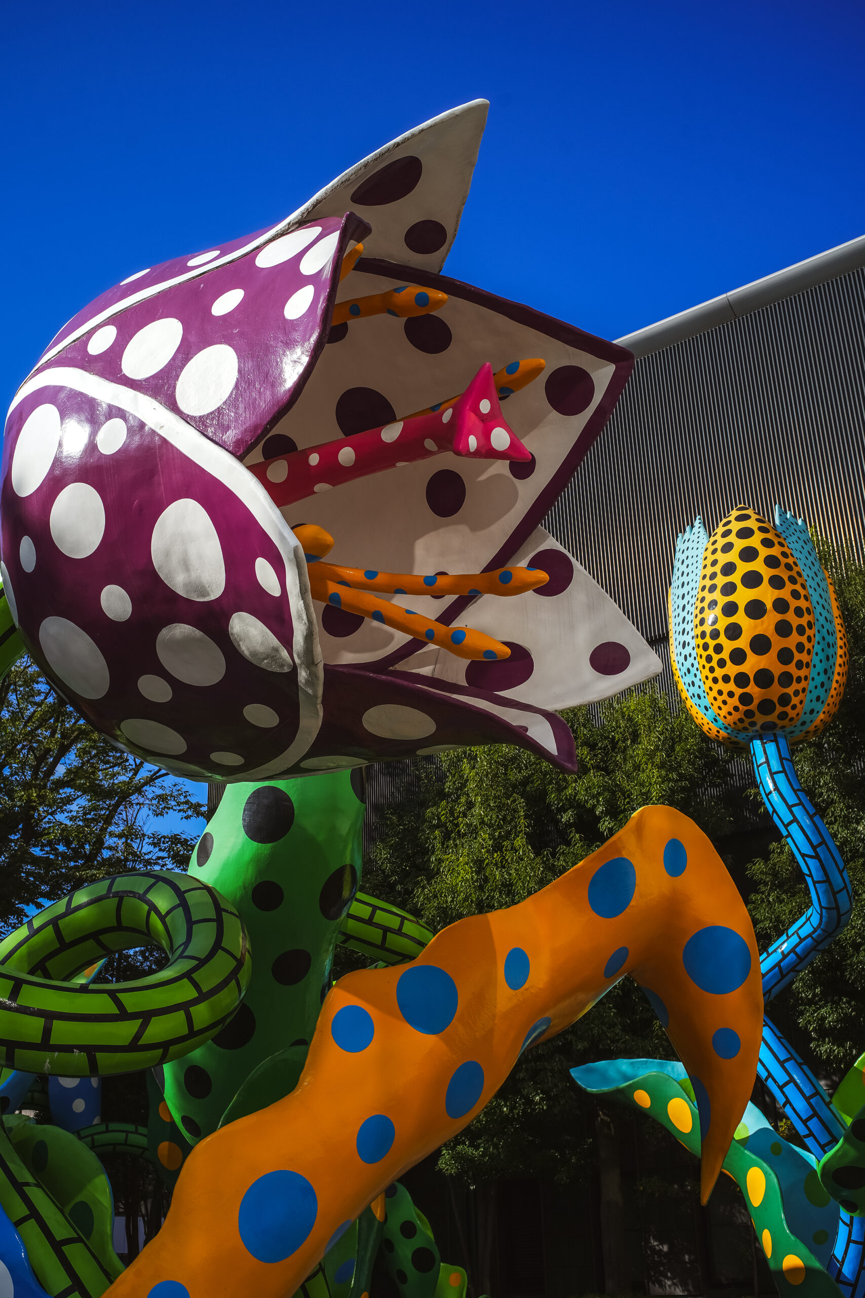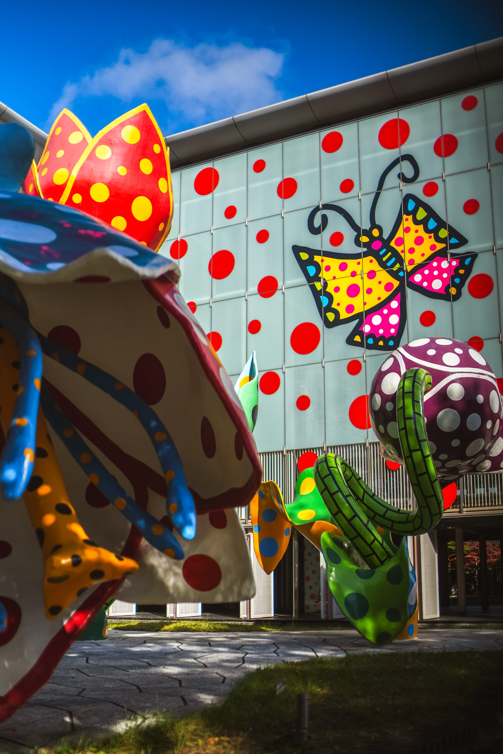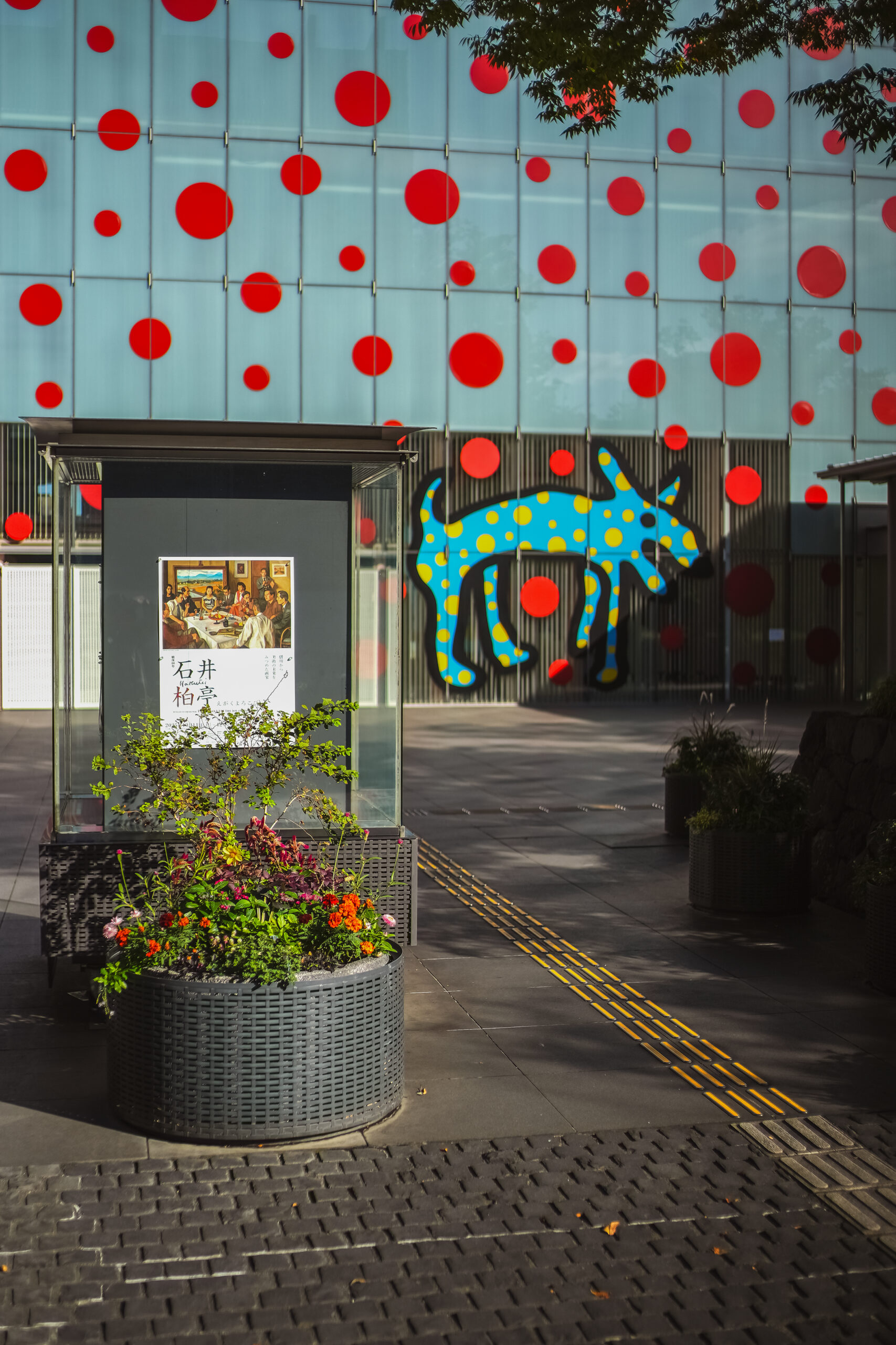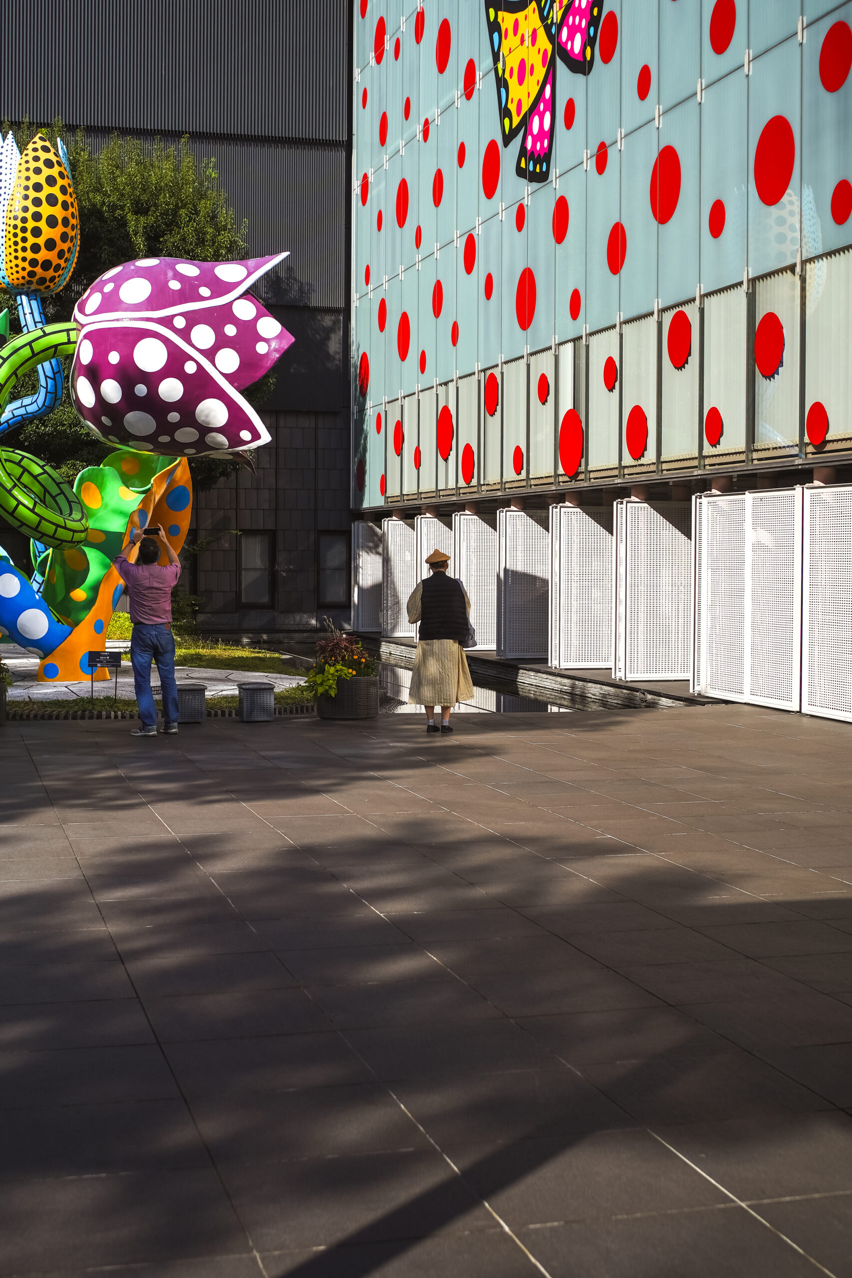 水玉チューリップの巨大オブジェに、ファサードガラス一面の水玉装飾、開館を待つ間、館全景を写真に収めたのですが、映えますね!