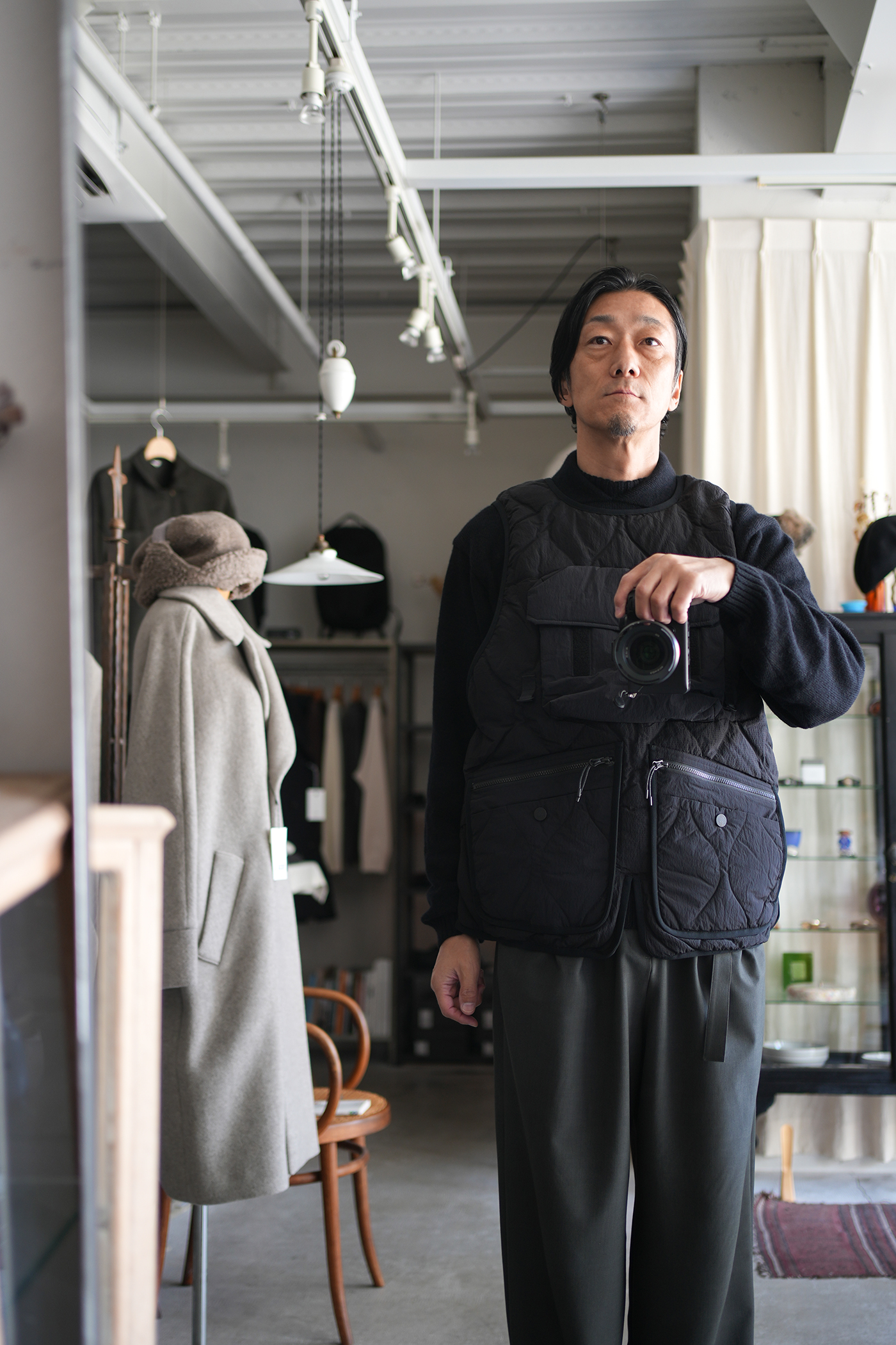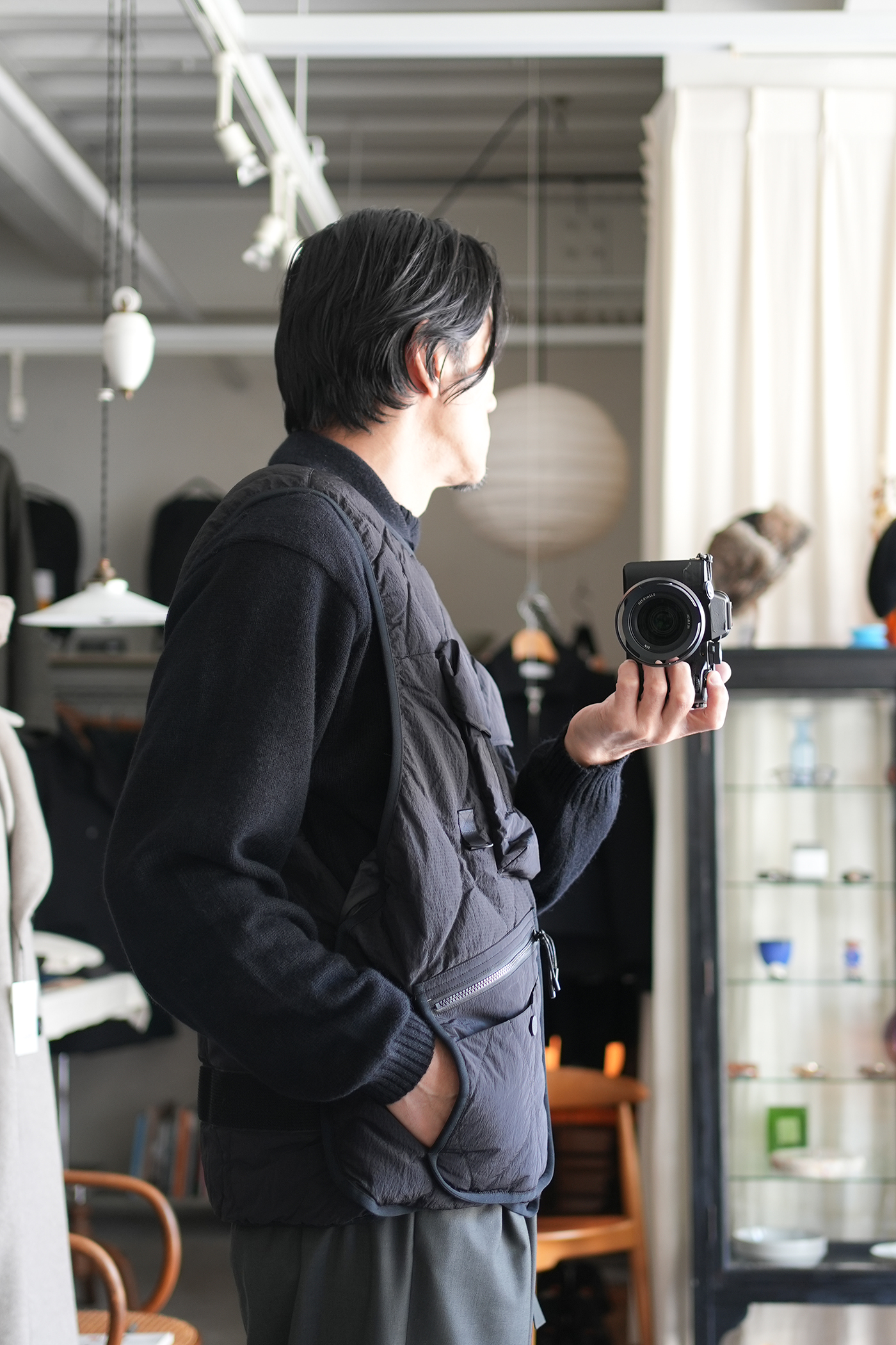 脇のみ全開になるプルオーバータイプのダウンベスト。前後にポケットを配置することでアウターとしても着まわせる。40Dナイロンの薄手ながらハリ感を出し、ワッシャー仕上げをすることでナチュラルなシワ感が特徴。撥水加工もしているリップストップタフタを使用。ナイロン生地の柔らかな着心地と軽やかで暖かなTAION社ダウンの喜び。