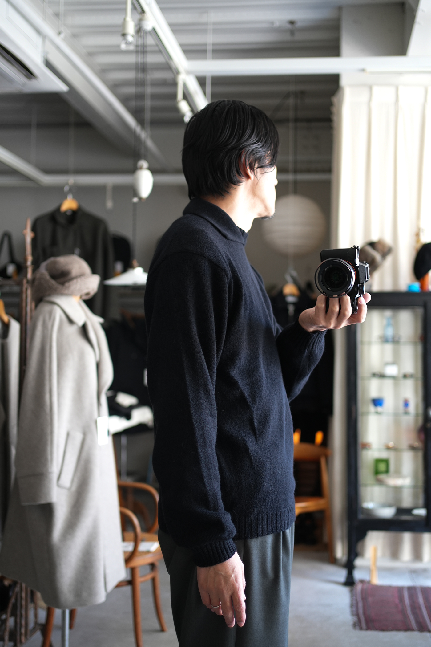 オーストラリア産ウールとアンデス産ベビーアルパカ糸を用いたニット。防縮加工を施しアルパカの持つ柔らかな風合いとヌメリ感ある仕上げに。7G天竺編みやや緩めに編み立て縮絨することで柔らかな表情となります。肩を落とした緩やかなシルエット、クルーネックの上に襟を付けポロニットをレイヤードした様な首元デザイン。素材の良さとデザインの良さをお楽しみください。