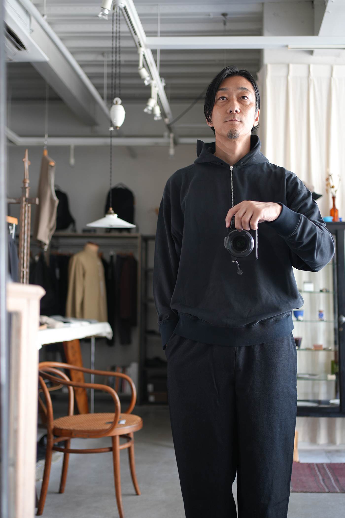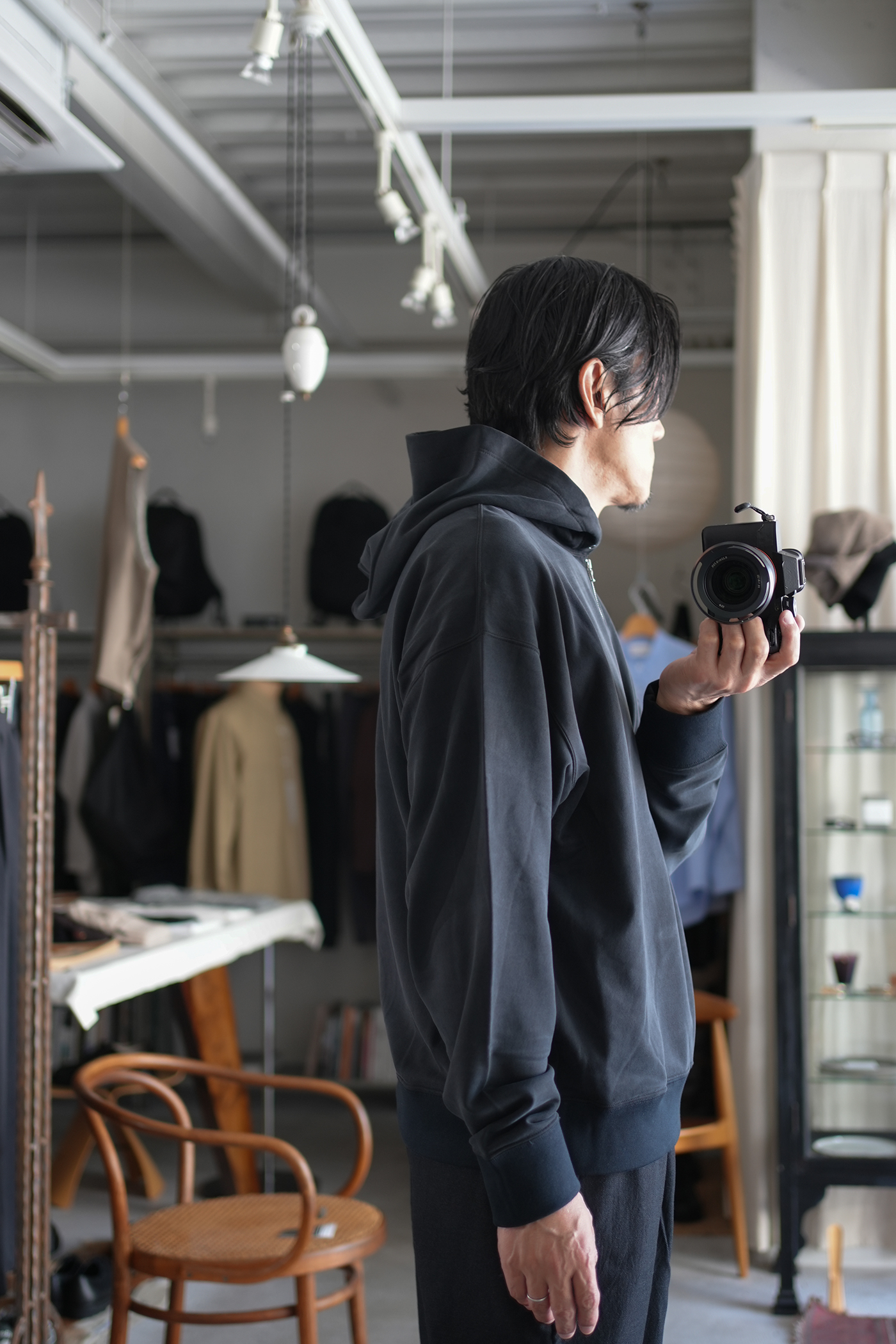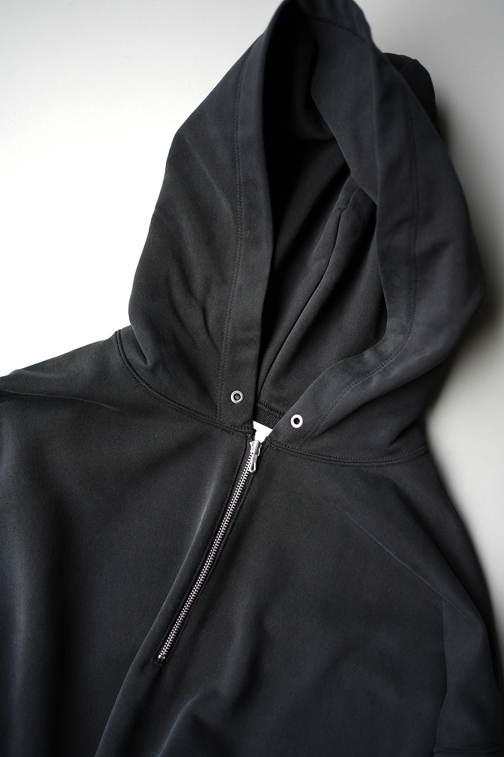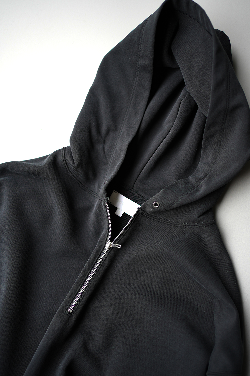 新しい価値観のある裏毛素材キュプラ裏毛、独自の光沢感を持つ生地でハーフジップパーカー。古着の匂いもする独特な形が特徴、某アウトドアブランドイメージ。28G高密度裏毛機で度詰めに編立てた新裏毛素材。表糸に105D高収縮キュプラ糸を使用。生地加工で、フィブリル加工(繊維の中の小さな繊維、を摩擦させ、表面を毛羽立たせる加工)することで 独特な光沢感と、ヌメリ感がございます。肌面には、スビンコットン双糸を使用してさらっとした着心地がございます。触ったことのないとろみが特徴です。スウェットと天竺の間の肉感にて、オールシーズン着用頂けます。日本屈指のカットソー工場で縫製しており、縫製が難しいと言われる高密度生地を綺麗に仕上げております。リブ周りは全てブラウジング縫製により、たるみのあるデザインに。 光沢感のある生地と相反する、リラックスなディティールを付けております。程よいルーズ感のあるモダンフィット。アームホール、身幅から、フードまで全てのパーツを計算し、パターンを引くことで、生地のポテンシャルを最大限に生かしております。丸みのあるボックスシルエット、大ぶりなフードにてレイヤードにも向いております。