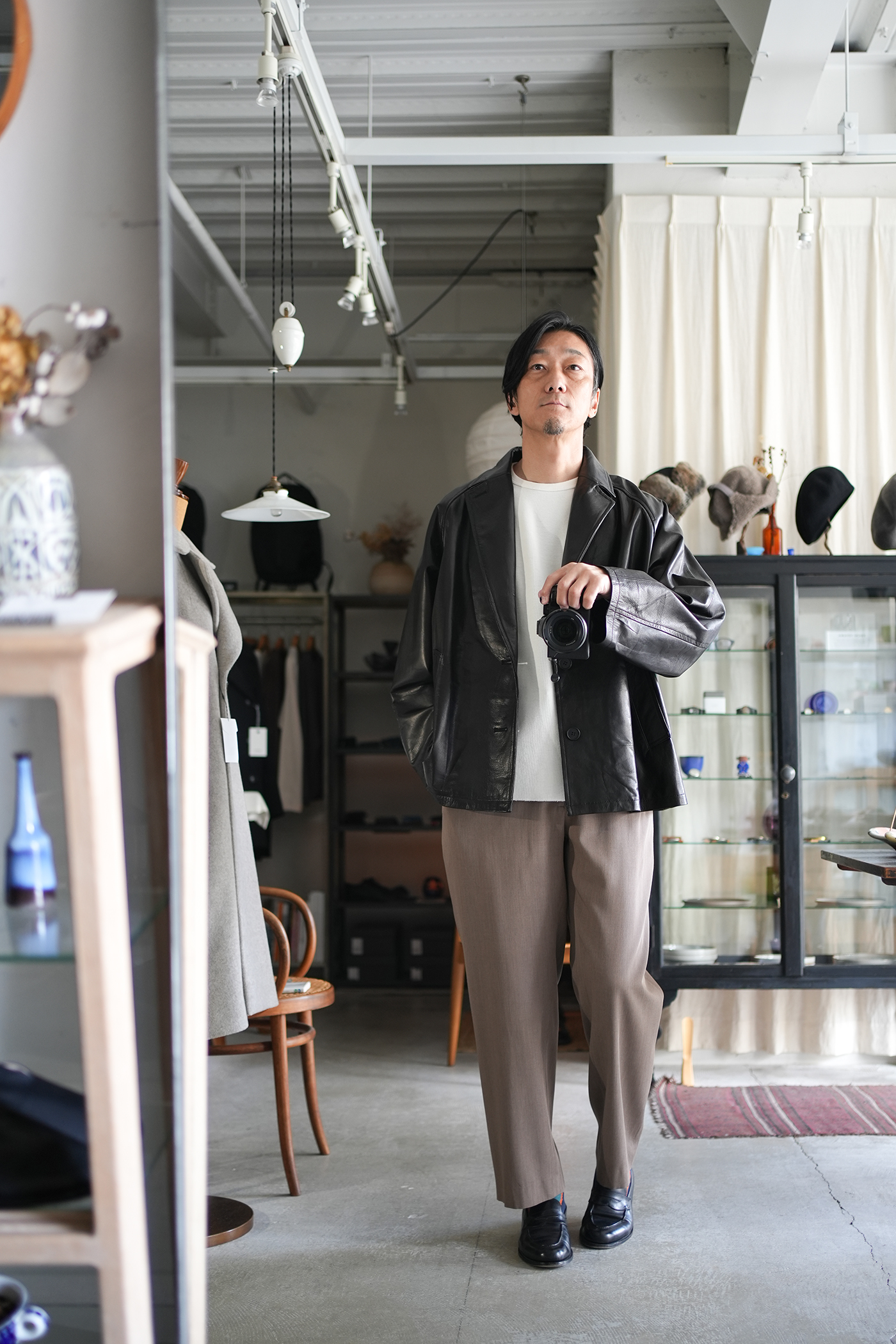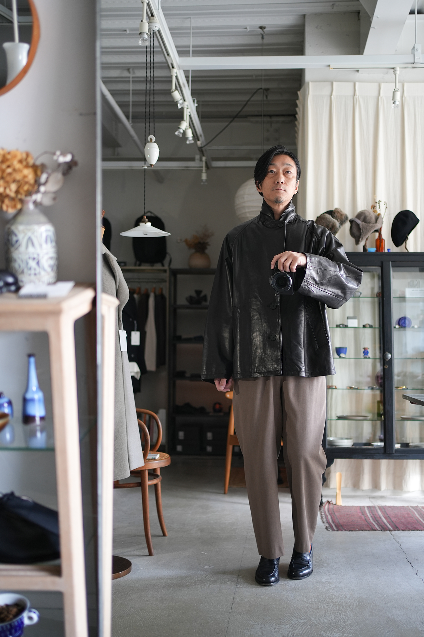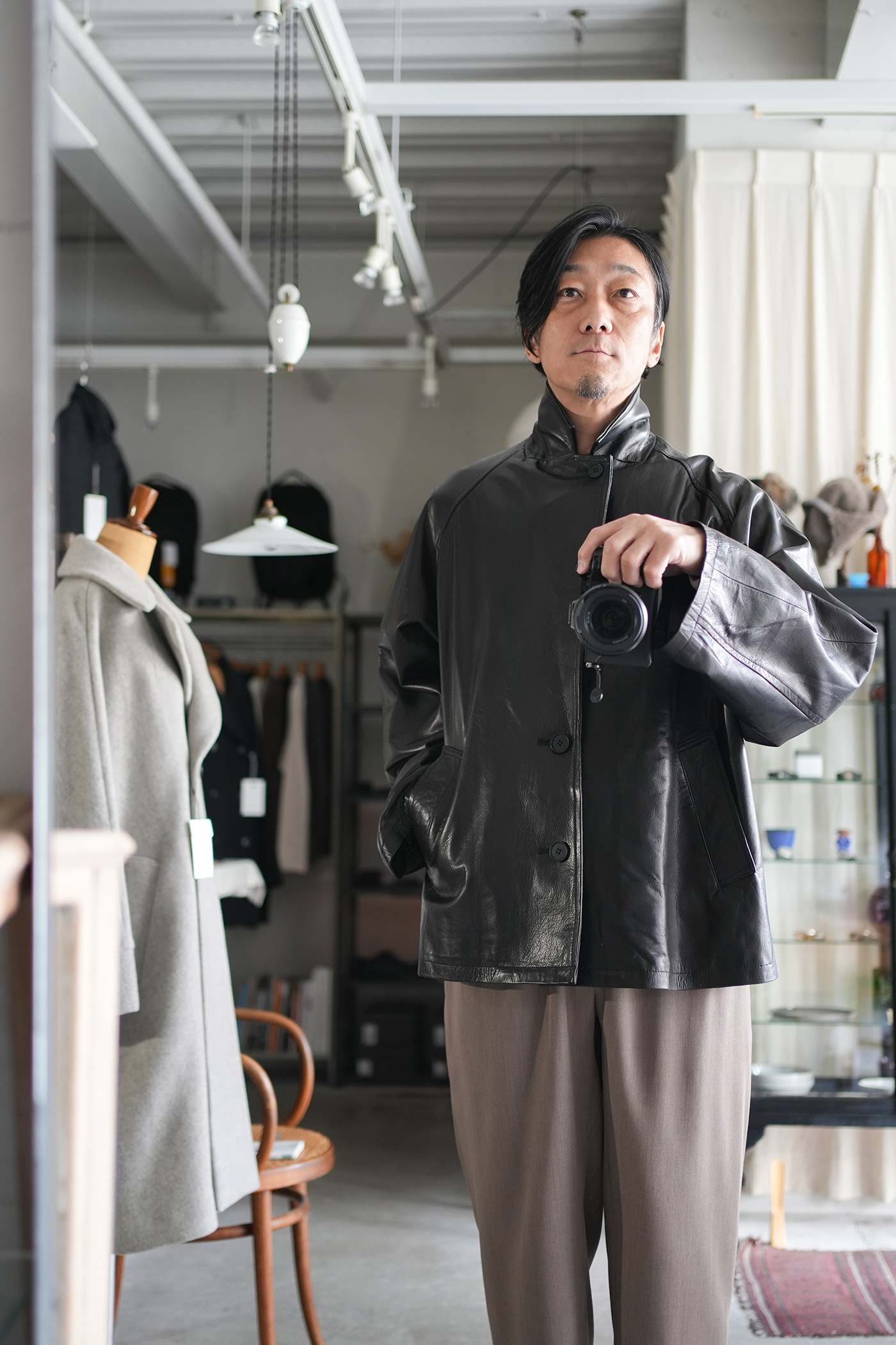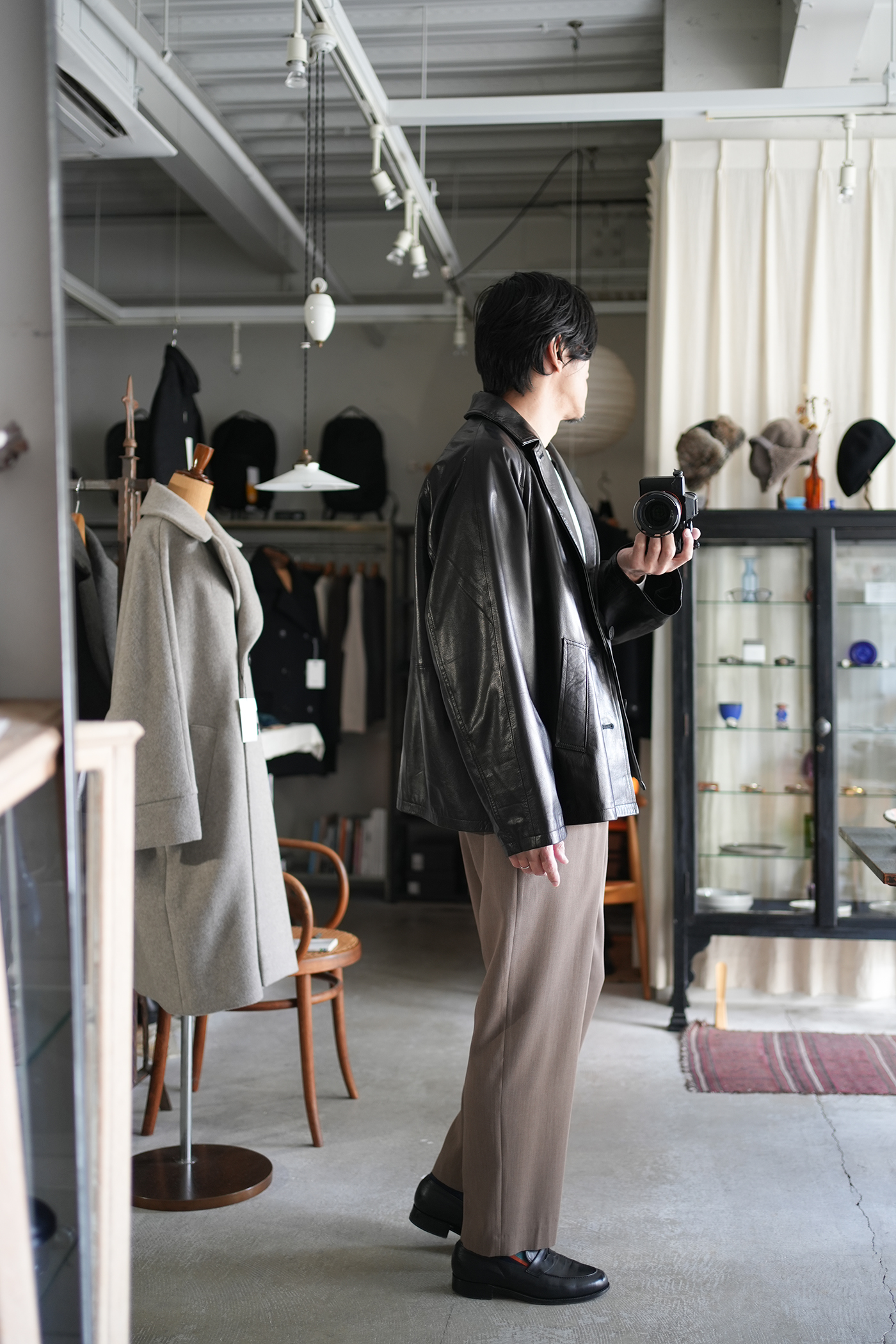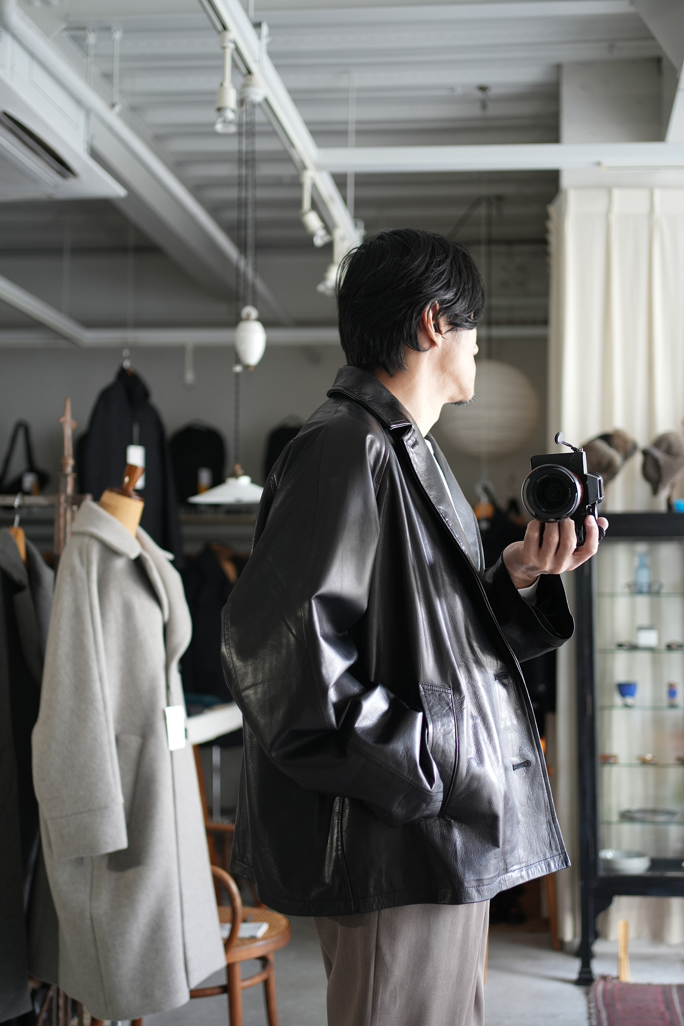 オーバーサイジングで仕上げたシングル2Bレザージャケット。ボックス型シルエット、箱ポケット、ラグランスリーブの形状なそブルゾンの様な着用感。襟先をボタンで留められる事によりコートの様なスタイリングの変化を楽しめる。前見頃はレザーを剥がず1枚もので仕上げている美しく贅沢な仕上げ。驚くほど軽量でしなやかなレザージャケットで軽快にスタイリングいただけます。レザーは日本の老舗タンナーにて製作された極薄のカウレザーを使用、なめしの工程で石灰液につけ革をソフトにし、薄いながらも強度のあるレザー、まるで布帛のようなドレープ感があり、レザーアウターながらストレスのない着心地が素晴らしい一着です。