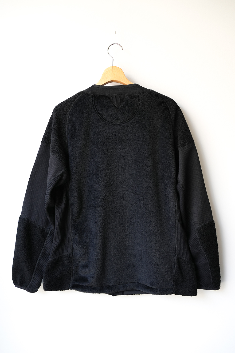 フリース素材のノーカラーブルゾン、身頃、アームホールにゆとりあるリラックスシルエット、毛足と質感異なる2種のフリースをパッチワークデザインで切り替え。アウターとしても中間着としても活躍するアイテムです。