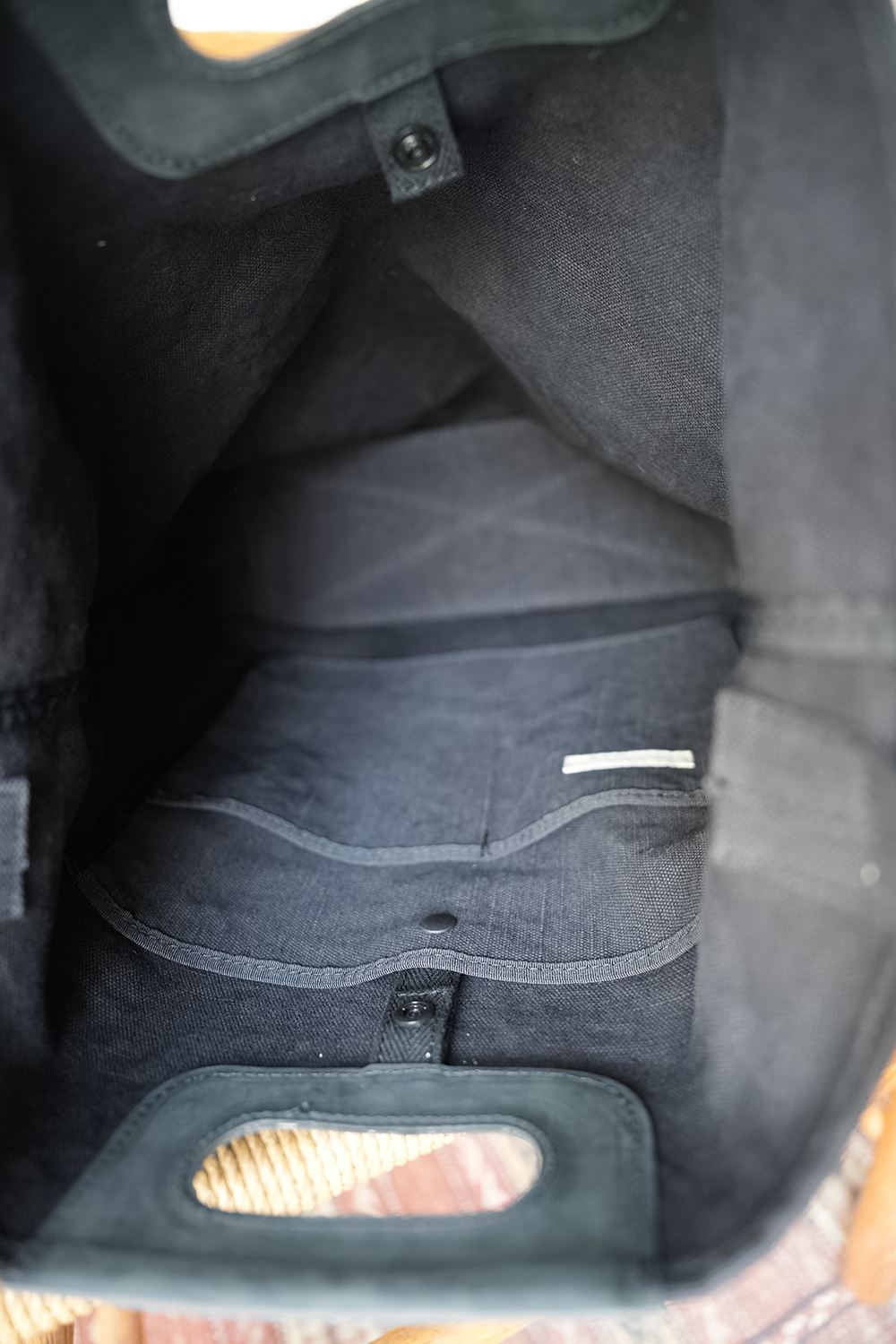 岡山県倉敷市の伝統的な整織工場にて、今では希少なシャトル織機を使用して時間をかけながらしっかりと織り上げた生地。綿と麻を織り込んだ生地は、極厚でボリュームのある素材です。またその生地をさらにバイオウォッシュ加工することで生地の持つ自然な表情と風合いを引き出し、長年にわたって大切に使用されてきたかのようなヴィンテージ感をもたらしています。レザーのハンドルが特徴的な2WAYハンドバッグ、B4サイズの書類や書籍、13・14inchのPCなど収納できる大きさ。お仕事に、休日のお出かけに活躍する大きさ。