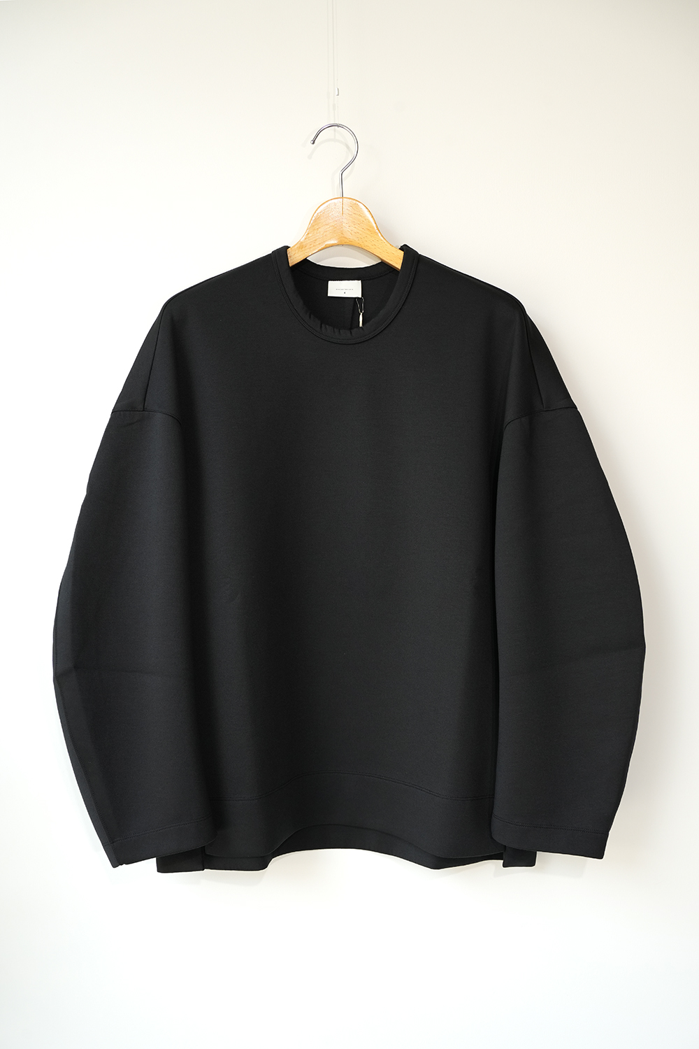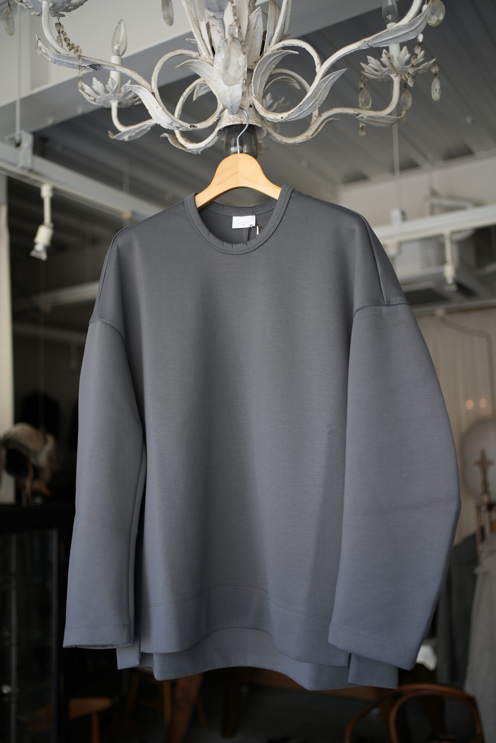 ポリエステル糸でしっかりと編んだ厚みがあり軽量・伸縮性抜群のダンボールニット。スウェットに近しい着方ができます。ポリウレタン糸を引き揃えている為適度な立体感を生むしっかりとした生地感です。オーバーサイズシルエットのクルーネック。製品洗い・タンブラー乾燥済み、ご家庭洗いできます。