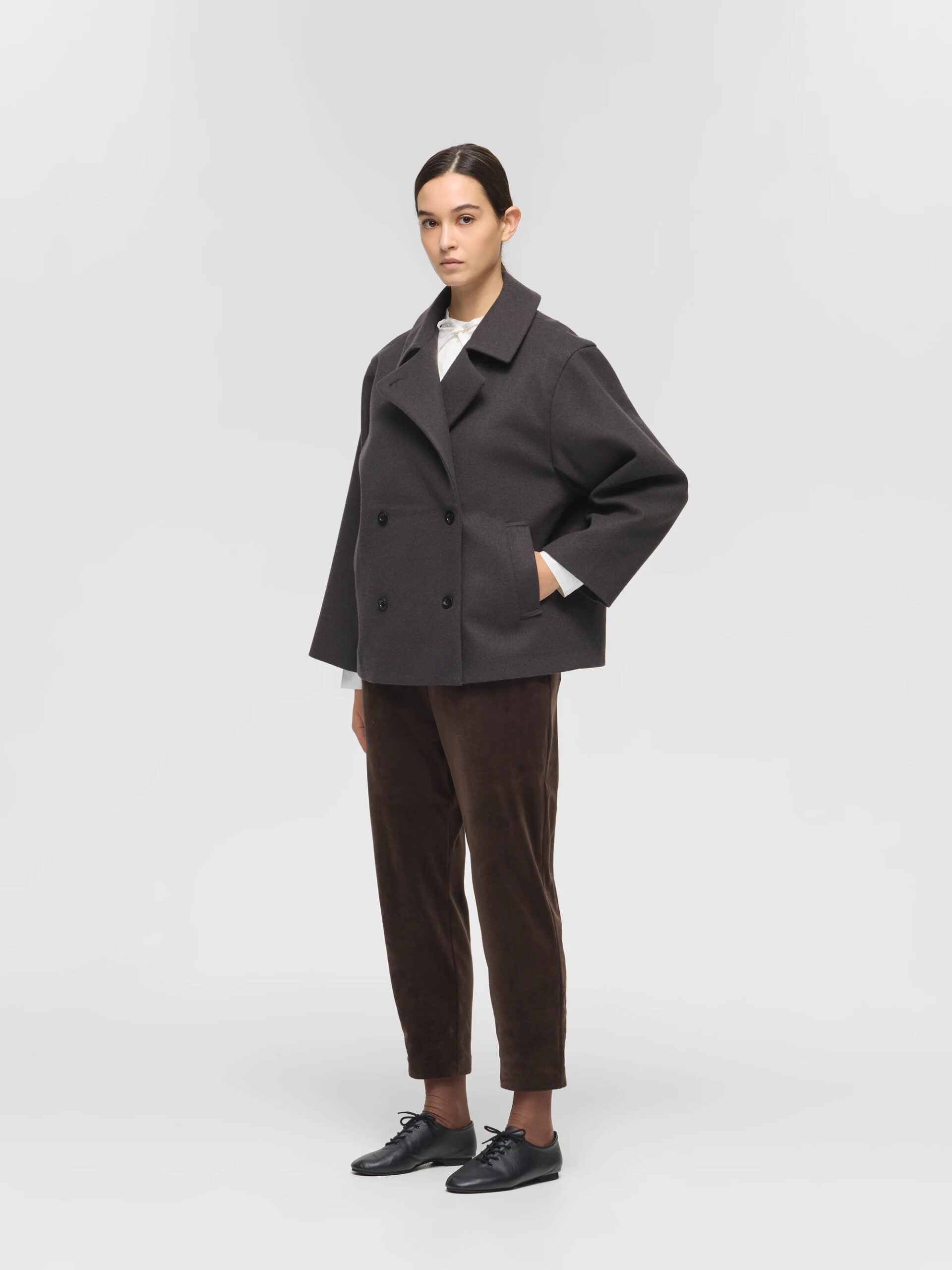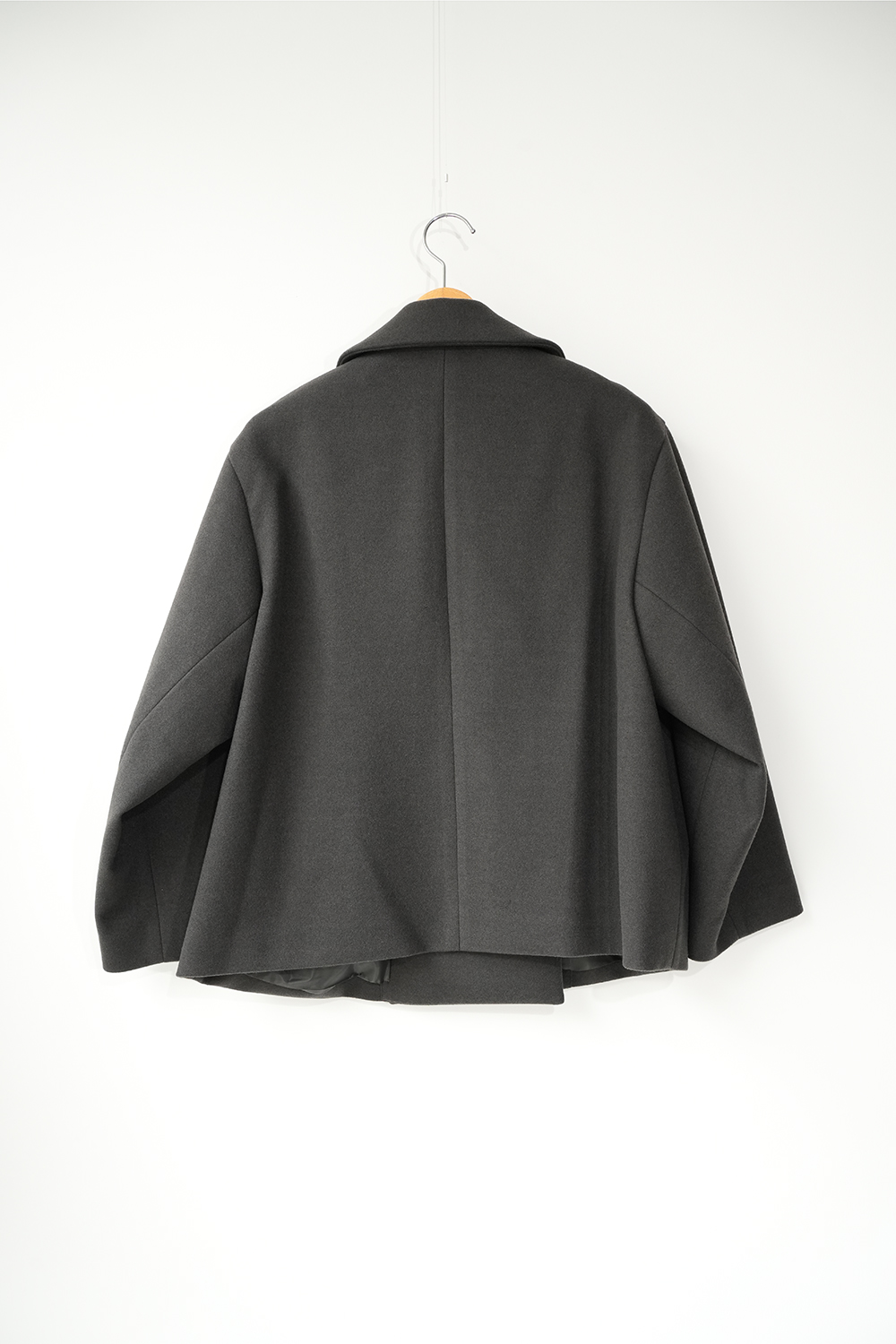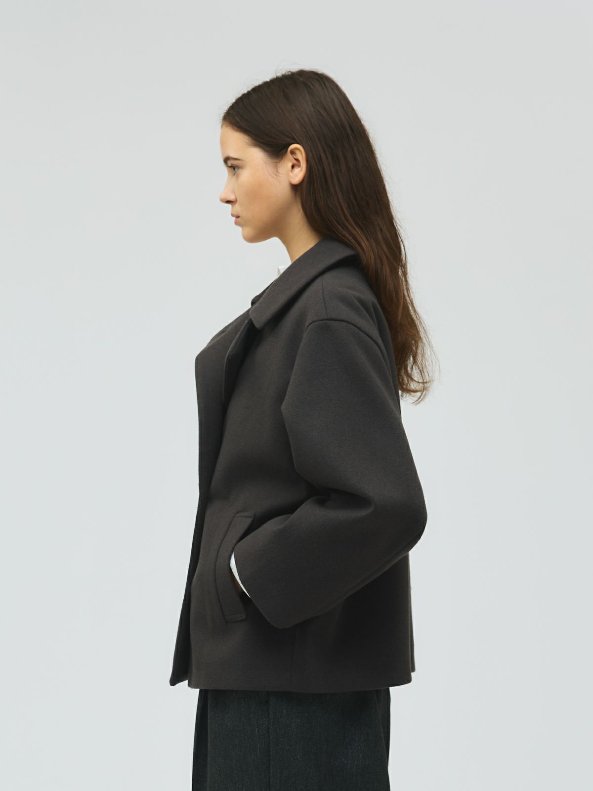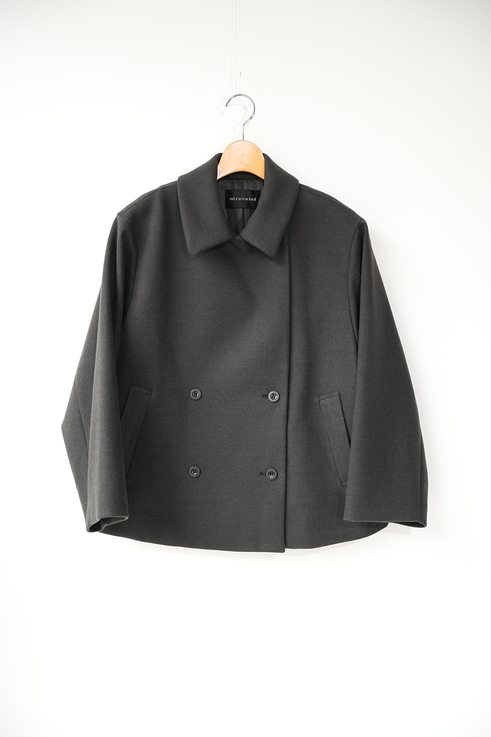 重さを感じさせずウォーム感のあるウール生地で仕上げた身幅ゆったりのピーコート。