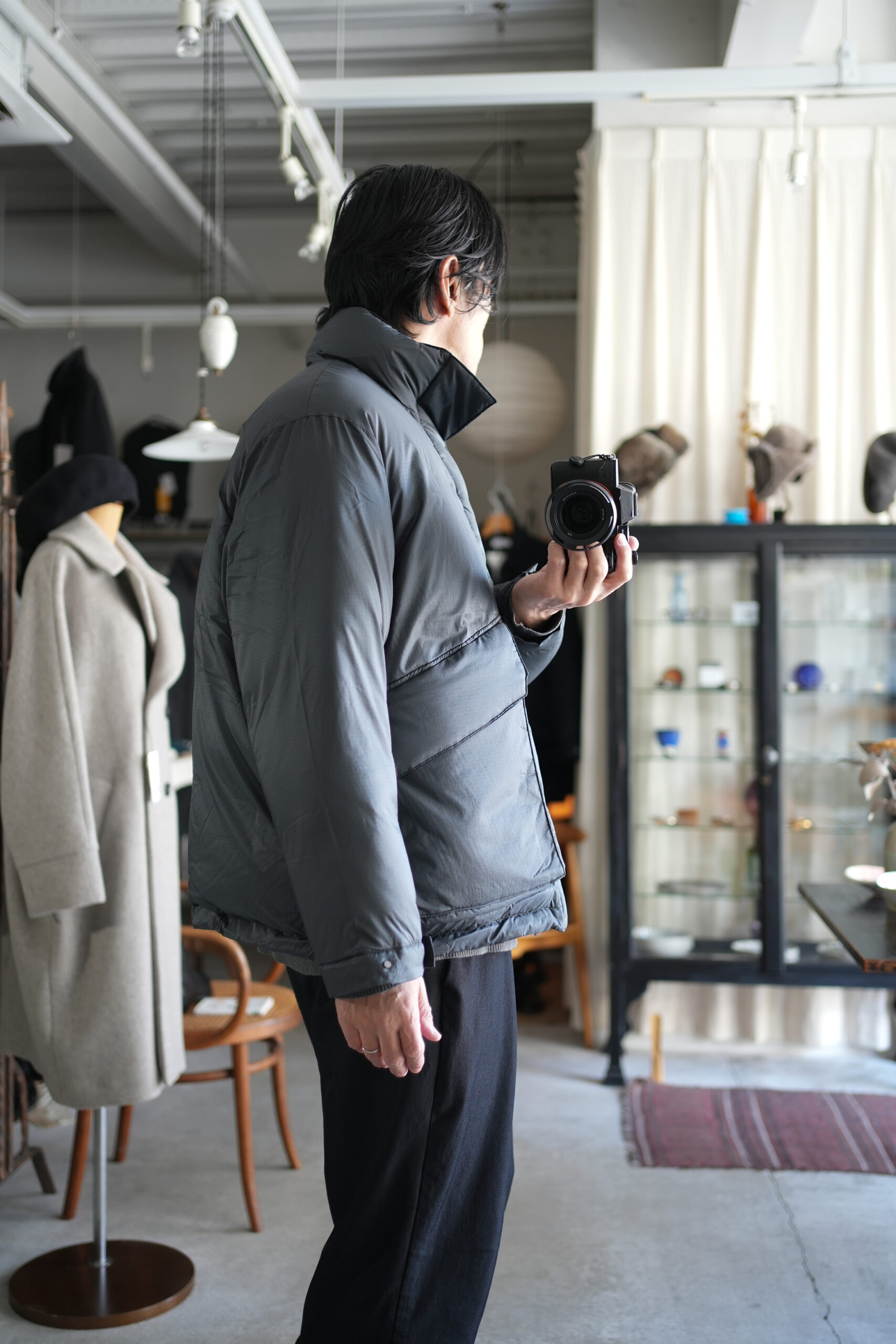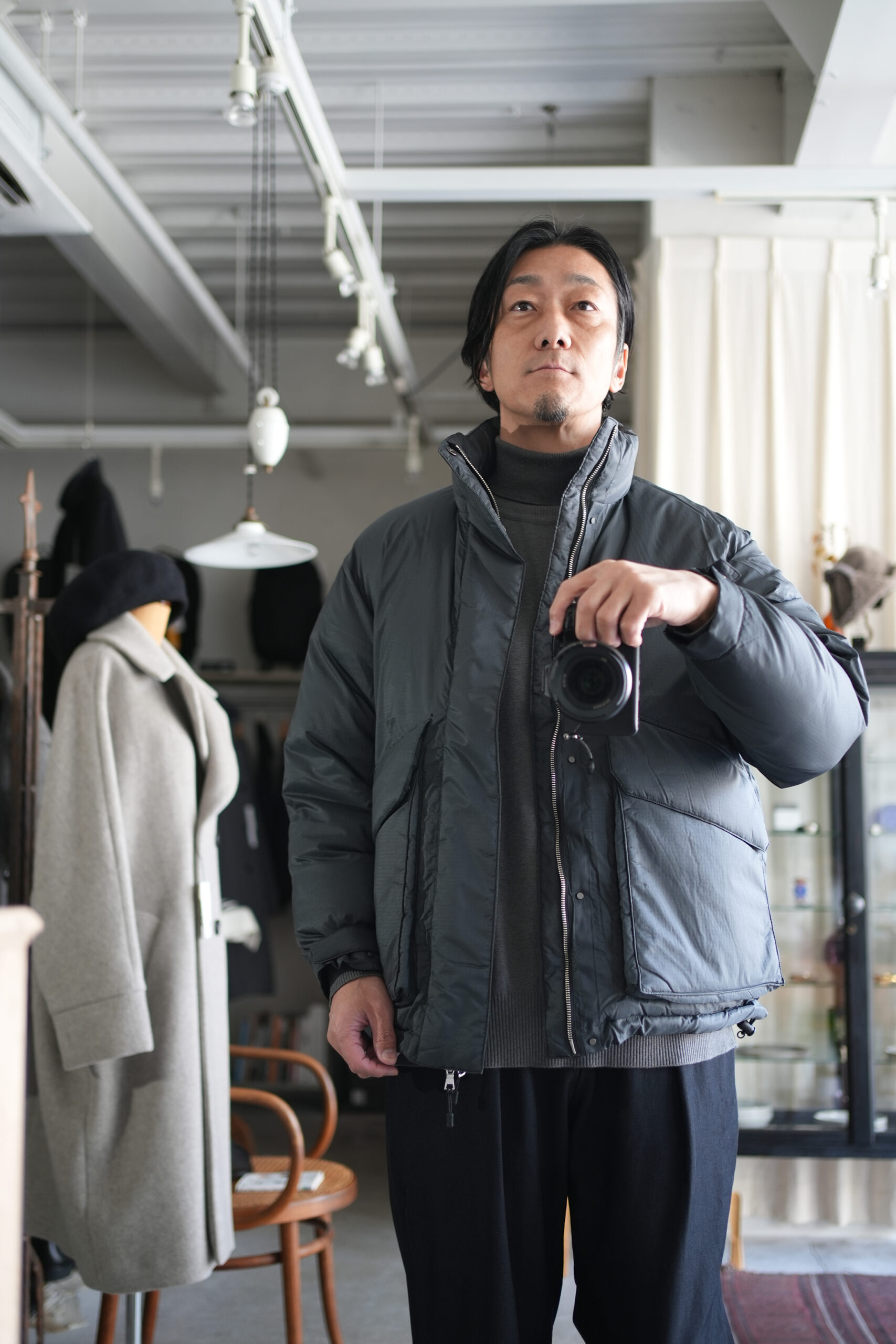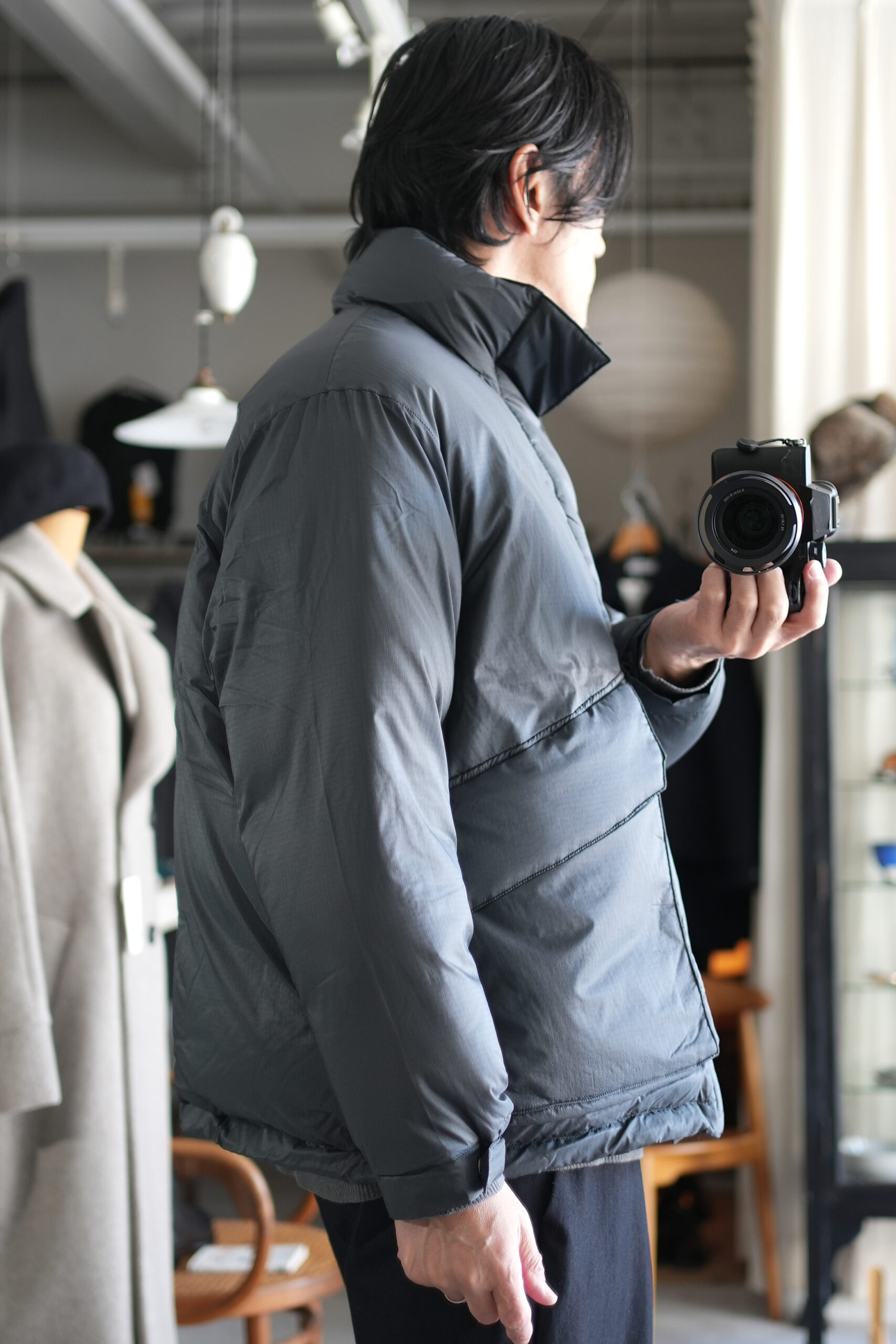 毎シーズン素材やデザインを変えながらリリースされているダウンジャケット。確かな保温性と軽量でストレスなく着用することができる快適さを考慮。今期モデルはシンプルなデザインながら随所に細かな拘りを感じさせる丁寧な作りが魅力。メインファブリックにはやや繊細なタッチのナイロン素材を使用し、着心地はもちろん見た目の印象も軽快に調整。ダウンの多くに見られる横に走るダウン止ステッチは姿を消し、スッキリと洗練された雰囲気に仕上げたのもこのジャケットの特徴の一つ。こうした少しのアレンジでグッと都会のシーンでも自然と馴染むよう見え方を意識しています。また、本来ダウンジャケットではあまり見ることのない後ろアームホールに入れたダーツにより、背中に丸みを作るパターン操作はURUならではのディテール。やや大きめに設定したフラップ付きのフロントポケットは、収納力とデザインのアクセントに。さらに保温性に優れた特殊素材を内側に貼ったハンドウォーマーポケットも完備しているので手元も暖かく迎え入れてくれます。そして今回は世界的に有名な老舗ダウンメーカーとしてブランドを展開しているファクトリーに生産を依頼。絶妙に計算されたダウンの分量やステッチワークの技術など、やはり本家にしか出せないクオリティの高さも是非注目していただきたいポイントです。
