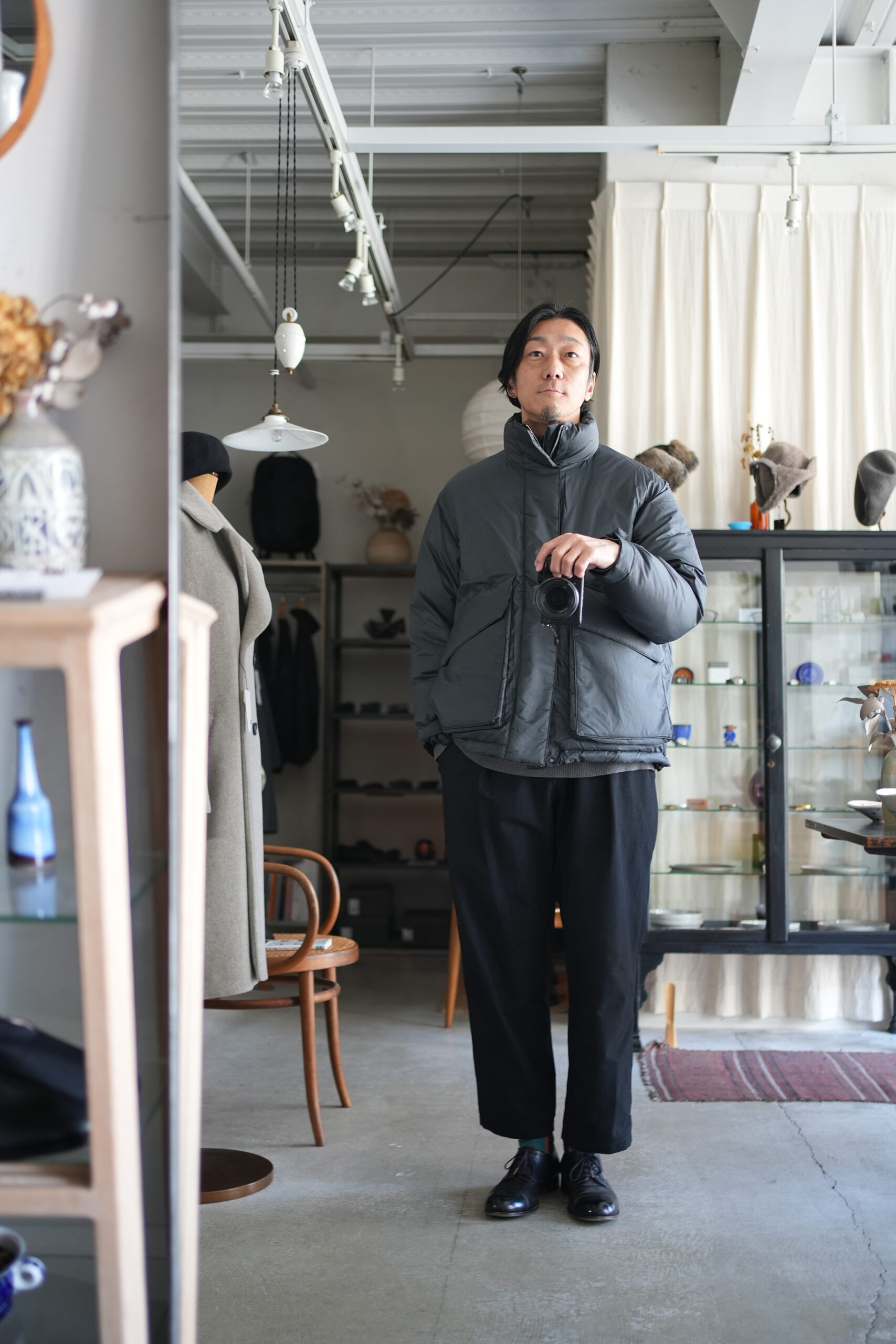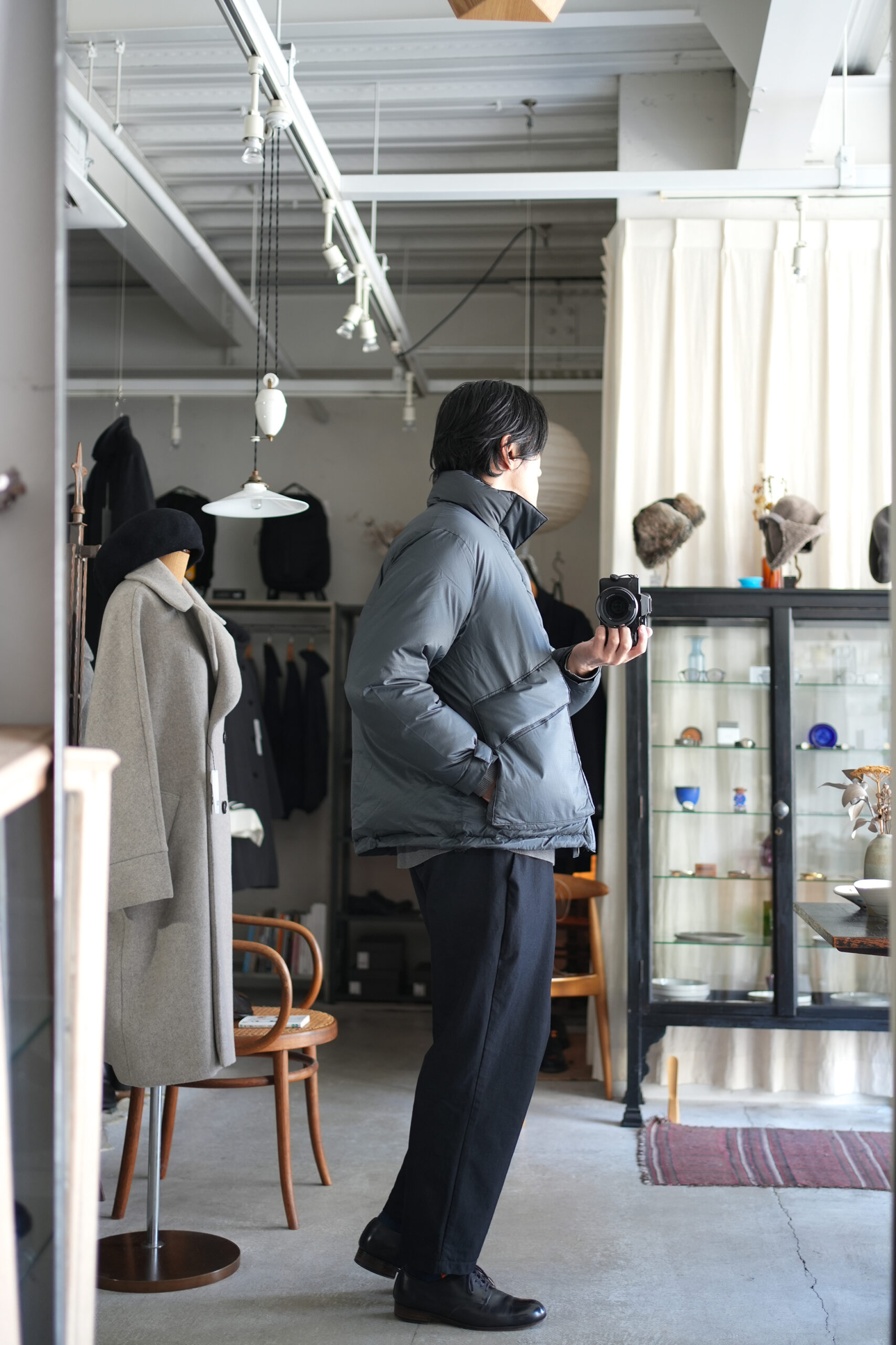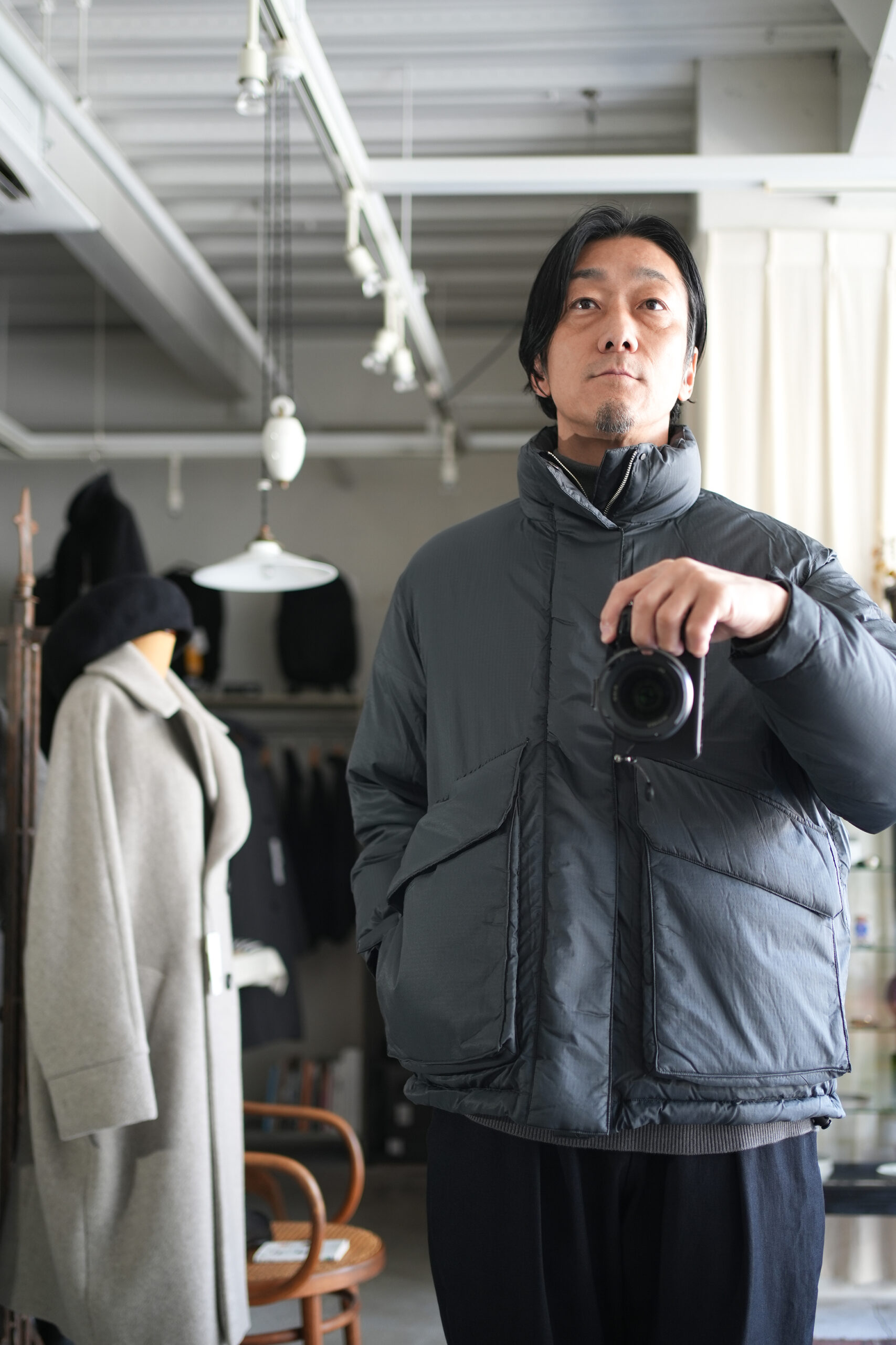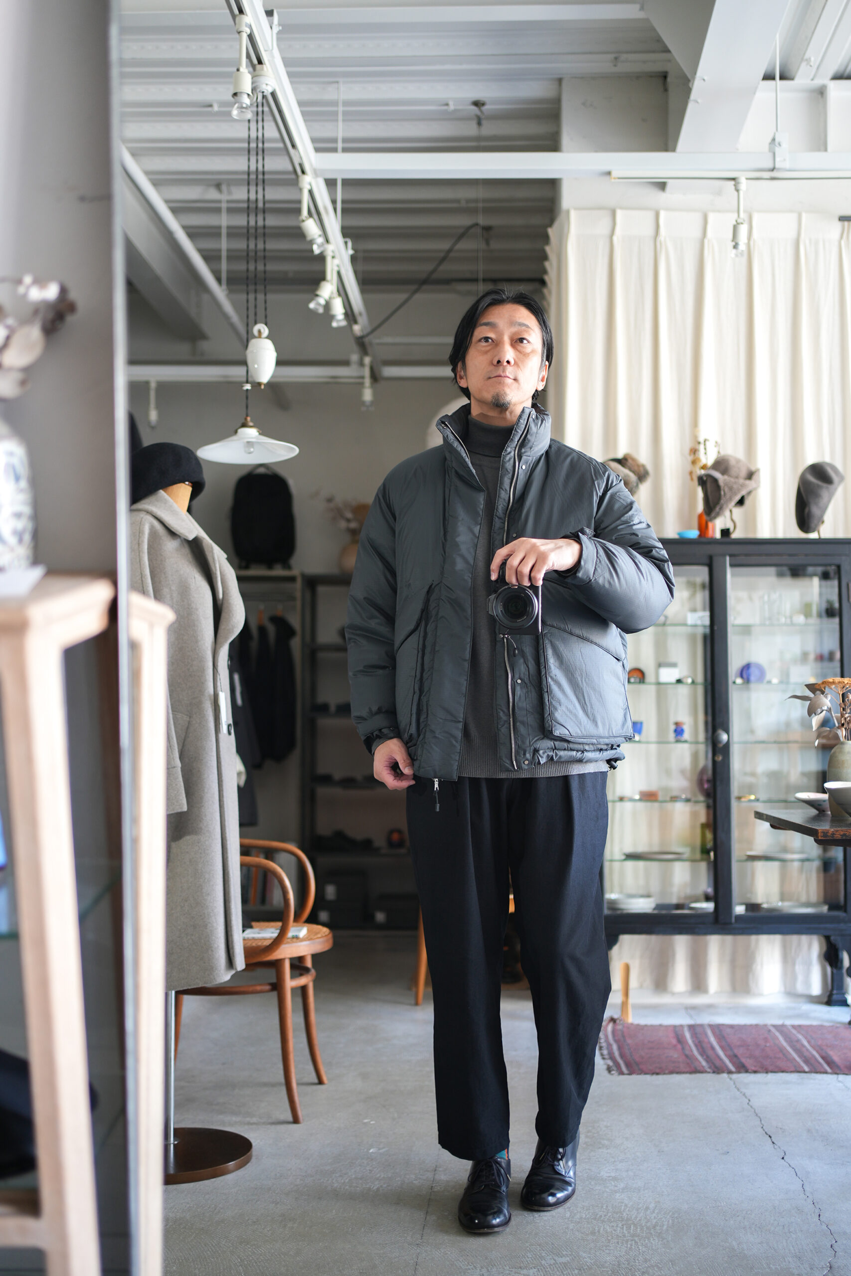 毎シーズン素材やデザインを変えながらリリースされているダウンジャケット。確かな保温性と軽量でストレスなく着用することができる快適さを考慮。今期モデルはシンプルなデザインながら随所に細かな拘りを感じさせる丁寧な作りが魅力。メインファブリックにはやや繊細なタッチのナイロン素材を使用し、着心地はもちろん見た目の印象も軽快に調整。ダウンの多くに見られる横に走るダウン止ステッチは姿を消し、スッキリと洗練された雰囲気に仕上げたのもこのジャケットの特徴の一つ。こうした少しのアレンジでグッと都会のシーンでも自然と馴染むよう見え方を意識しています。また、本来ダウンジャケットではあまり見ることのない後ろアームホールに入れたダーツにより、背中に丸みを作るパターン操作はURUならではのディテール。やや大きめに設定したフラップ付きのフロントポケットは、収納力とデザインのアクセントに。さらに保温性に優れた特殊素材を内側に貼ったハンドウォーマーポケットも完備しているので手元も暖かく迎え入れてくれます。そして今回は世界的に有名な老舗ダウンメーカーとしてブランドを展開しているファクトリーに生産を依頼。絶妙に計算されたダウンの分量やステッチワークの技術など、やはり本家にしか出せないクオリティの高さも是非注目していただきたいポイントです。