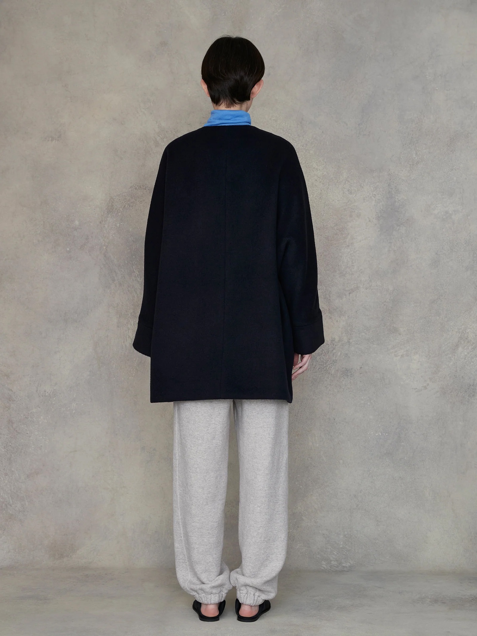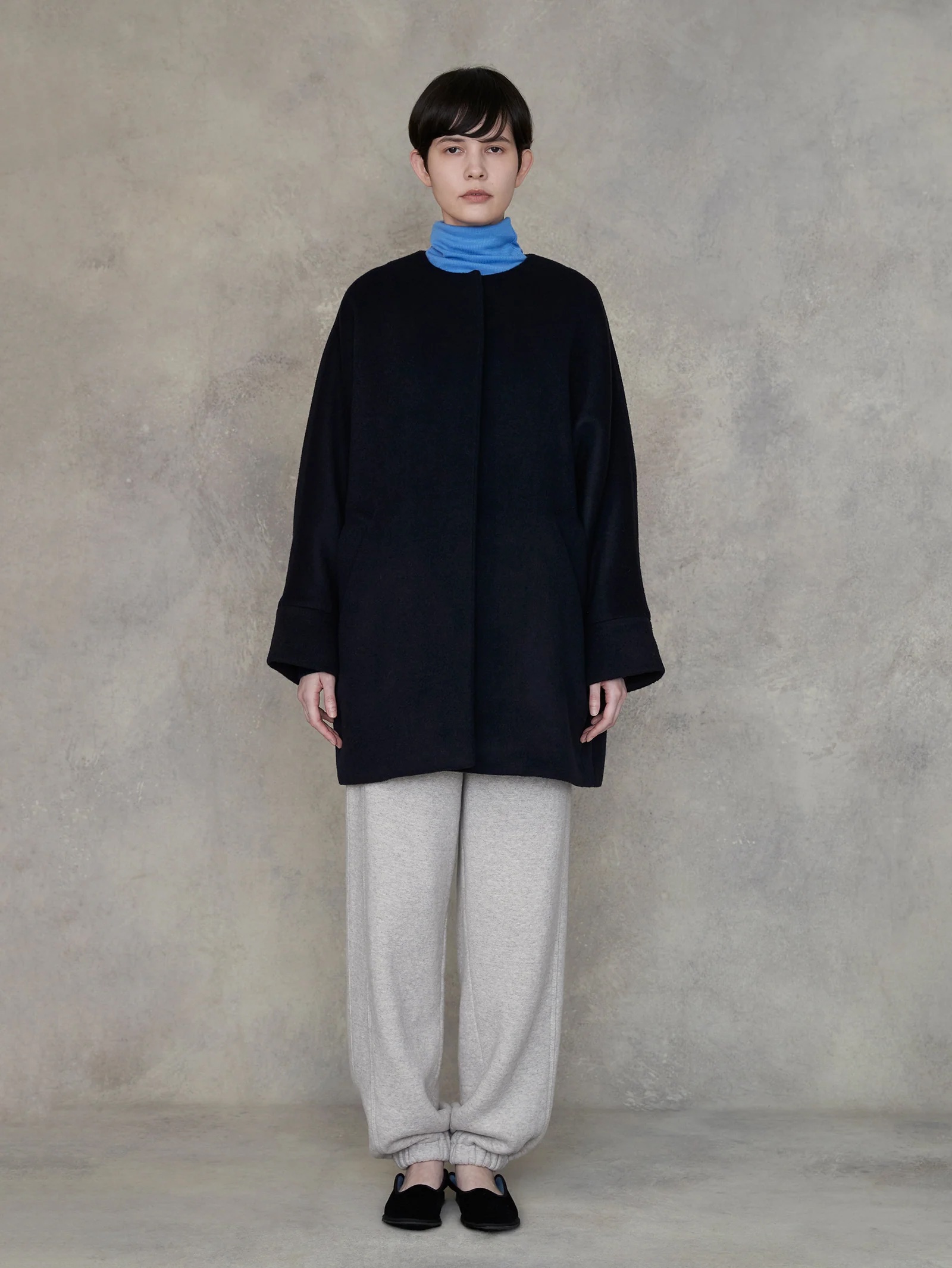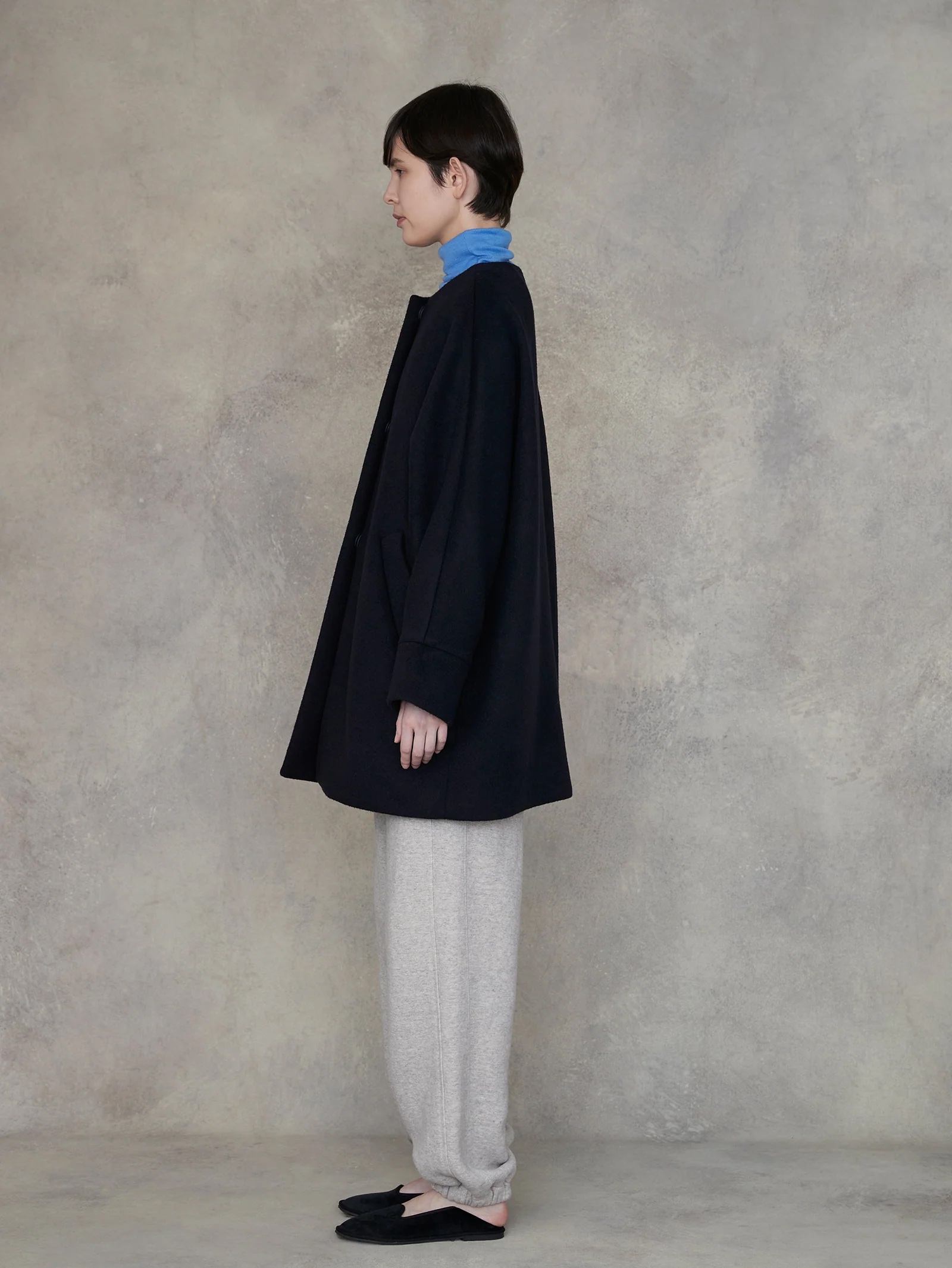 テントコートのディテールをいかしたノーカラーコート。すっきりとした首回りは巻物とも好相性、前立てはスナップボタンでスッキリ、アームホールに縫い目のない贅沢な一枚仕立て。肩幅・体型を問わず、美しくフィットする絶妙なシルエット、無数の色糸が織りなす、奥行きのあるグラデーション、カフス部分を折り返して袖丈を調整できる。こだわりぬいて作られた素材は、選び抜かれた高品質なラムウール原料を国内産地特有の美しい水を使用して一流の職人達が仕上げることで、非常に美しく上質な毛並みの表情、その見た目に反する驚くほどの軽さ、保温効果に優れた機能性を持った宝物のような素材です。各色がもつ美しさを最大限いかせるように色ごとに緻密に配列を計算し細部の作り方まで変えて作成しています。グラデーションの色糸を組み合わせて無数の色で奥行きを出した圧巻の色合い。ゆったりとしたサイズ感ですが、小柄な方にもきれいに着こなせる長さで、羽織るだけでこなれ感のあるスタイルにまとめてくれます。首元はシンプルなノーカラーデザインなので、スカーフやストールなども合わせやすいデザイン。