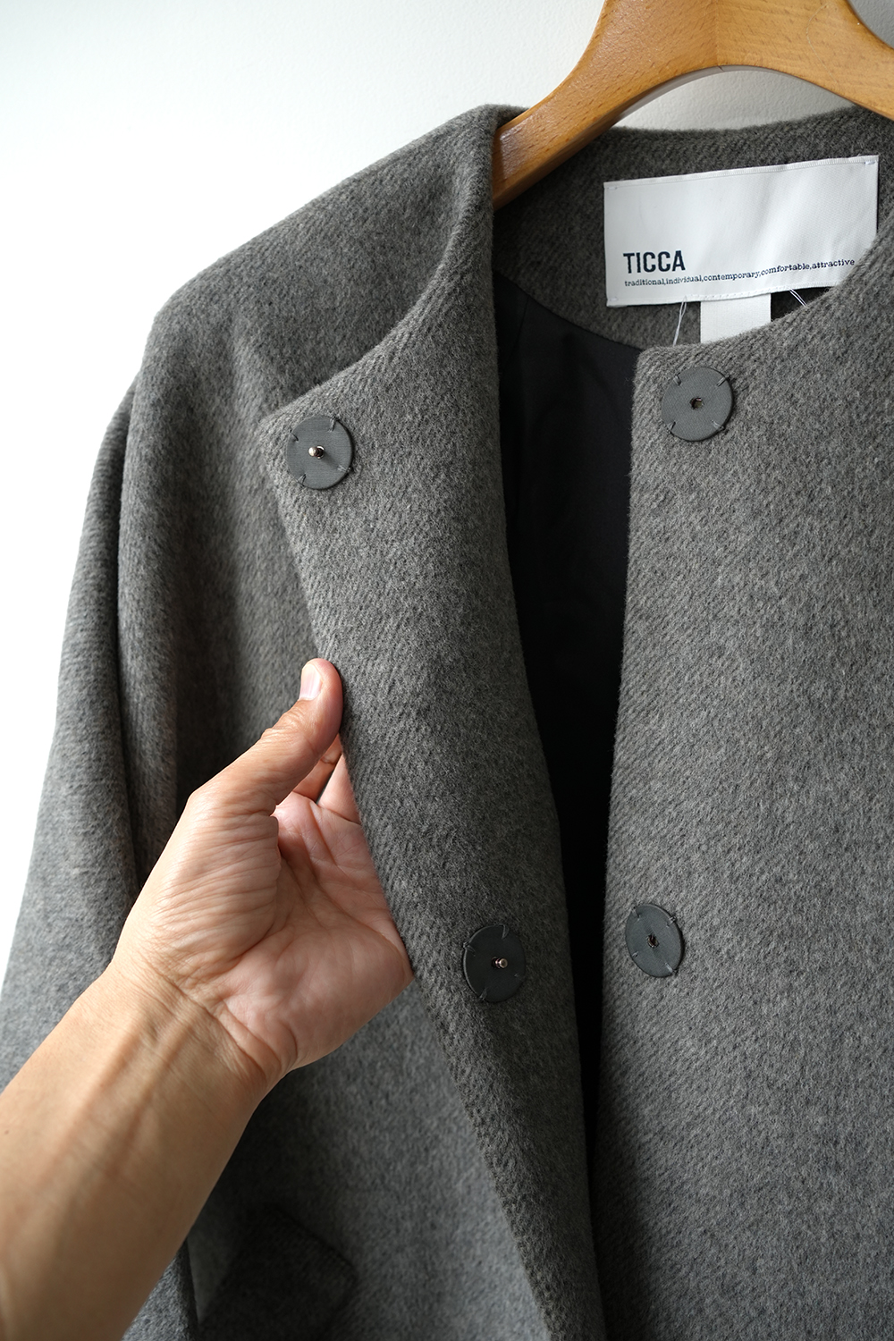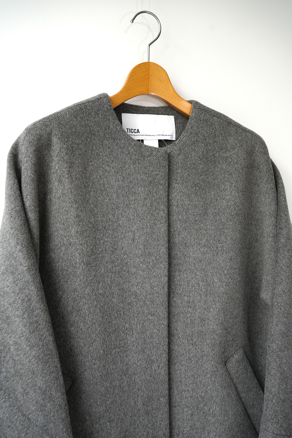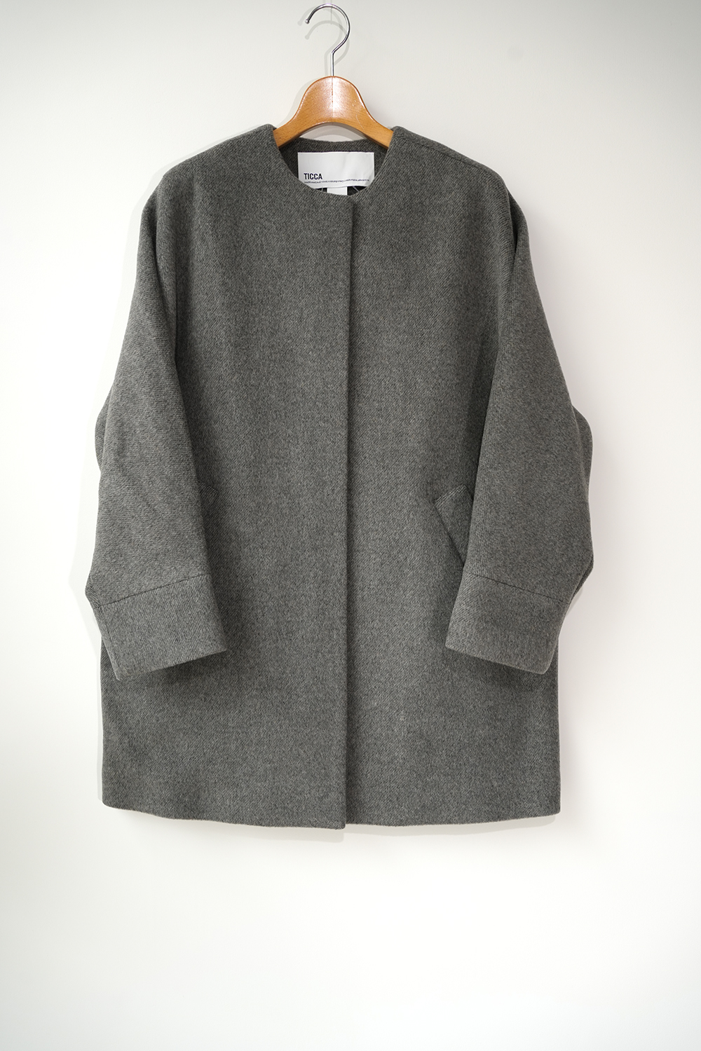 テントコートのディテールをいかしたノーカラーコート。すっきりとした首回りは巻物とも好相性、前立てはスナップボタンでスッキリ、アームホールに縫い目のない贅沢な一枚仕立て。肩幅・体型を問わず、美しくフィットする絶妙なシルエット、無数の色糸が織りなす、奥行きのあるグラデーション、カフス部分を折り返して袖丈を調整できる。こだわりぬいて作られた素材は、選び抜かれた高品質なラムウール原料を国内産地特有の美しい水を使用して一流の職人達が仕上げることで、非常に美しく上質な毛並みの表情、その見た目に反する驚くほどの軽さ、保温効果に優れた機能性を持った宝物のような素材です。各色がもつ美しさを最大限いかせるように色ごとに緻密に配列を計算し細部の作り方まで変えて作成しています。グラデーションの色糸を組み合わせて無数の色で奥行きを出した圧巻の色合い。ゆったりとしたサイズ感ですが、小柄な方にもきれいに着こなせる長さで、羽織るだけでこなれ感のあるスタイルにまとめてくれます。首元はシンプルなノーカラーデザインなので、スカーフやストールなども合わせやすいデザイン。
