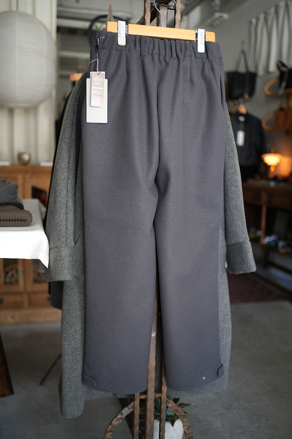 メルトンライクな中肉ジャージーを用いたストレートシルエットのパンツ。吸湿発熱機能のあるリサイクルポリエステルをベースに、レーヨンとアクリルをブレンドする事でソフトな仕上がりになっています。一般よりも少し太めのベルト幅のフロントには2つの隠しドットボタン。後ろは裁ち出しベルト仕様。ポケットは前後とも切り替え利用デザインのため、後ろから見てもスッキリと仕上がっています。裾部分にはタブをあしらい、シルエット変化を楽しめます。後ろベルトのみにエラスティックバンドを使用したバックイージー仕様。