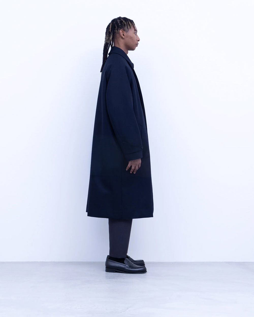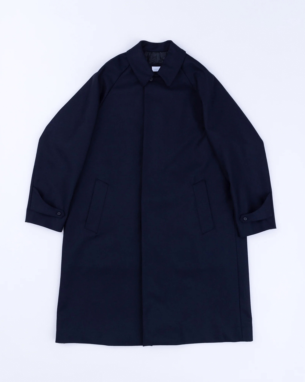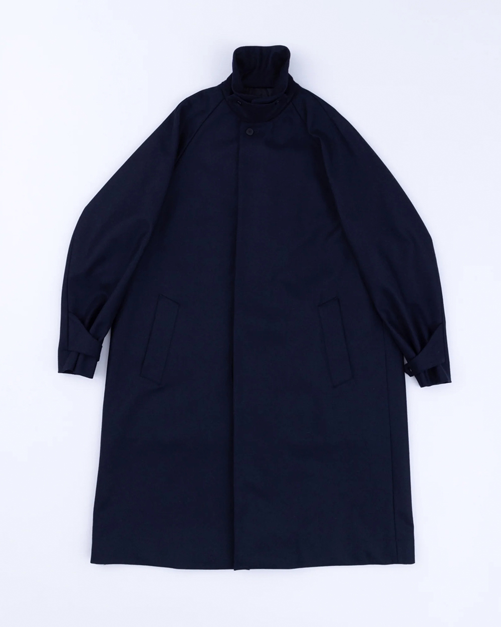 メルトンよりも軽量でアウター類には芯地をボンディングししっかりとしたハリと防風機能を高めた高密フラノ生地で仕立てたステンカラーコート。全面芯ボンディング、総裏仕立て(身頃キルティング裏地)で中綿には高機能生地KOMATHERMO(コマサーモ)を配した軽量で暖かなコートです。