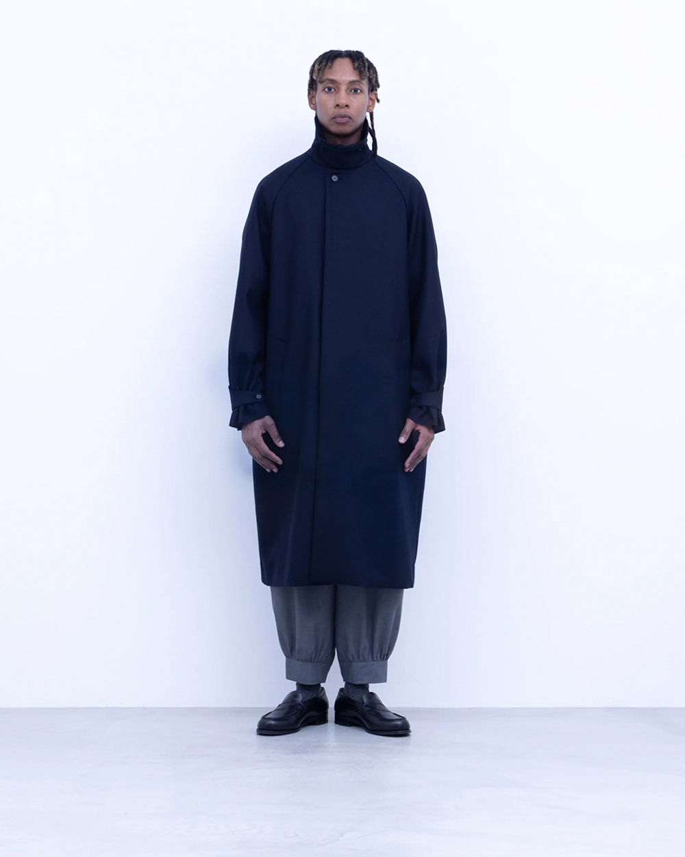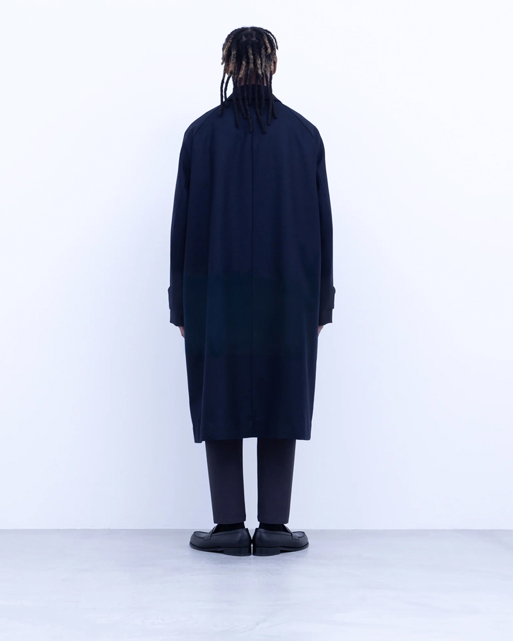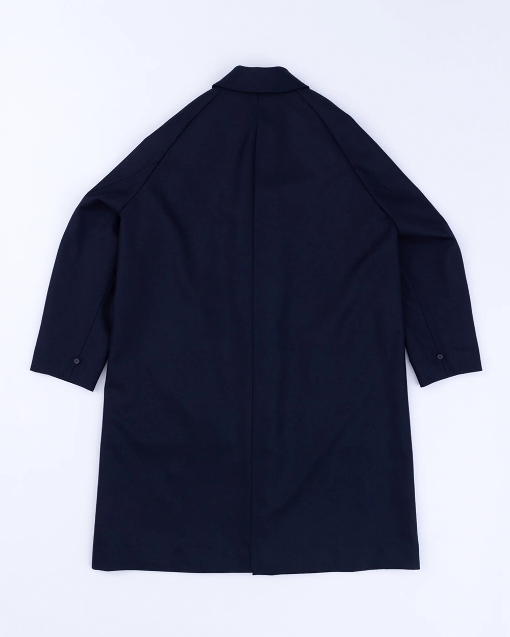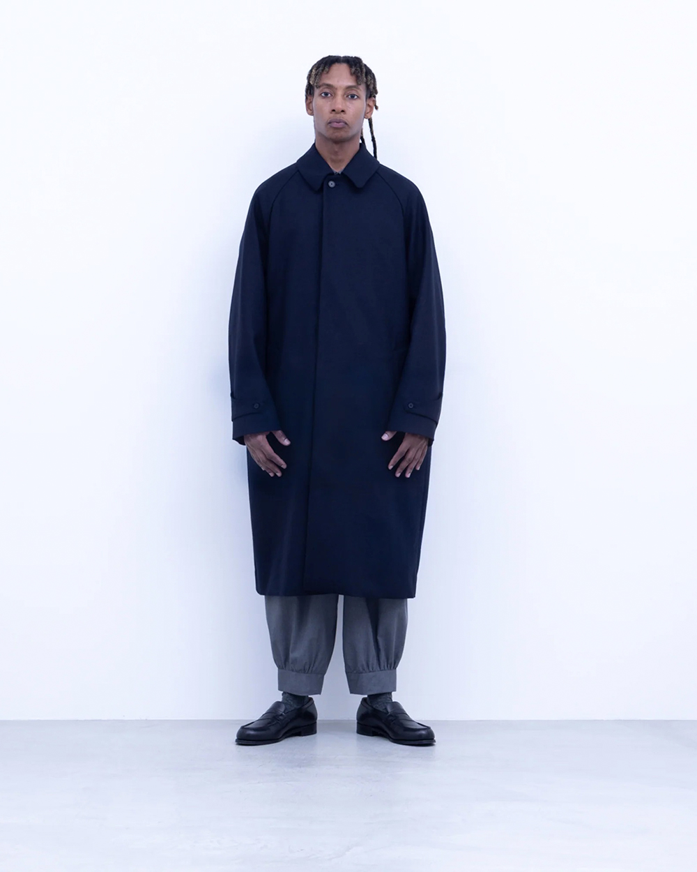 メルトンよりも軽量でアウター類には芯地をボンディングししっかりとしたハリと防風機能を高めた高密フラノ生地で仕立てたステンカラーコート。全面芯ボンディング、総裏仕立て(身頃キルティング裏地)で中綿には高機能生地KOMATHERMO(コマサーモ)を配した軽量で暖かなコートです。