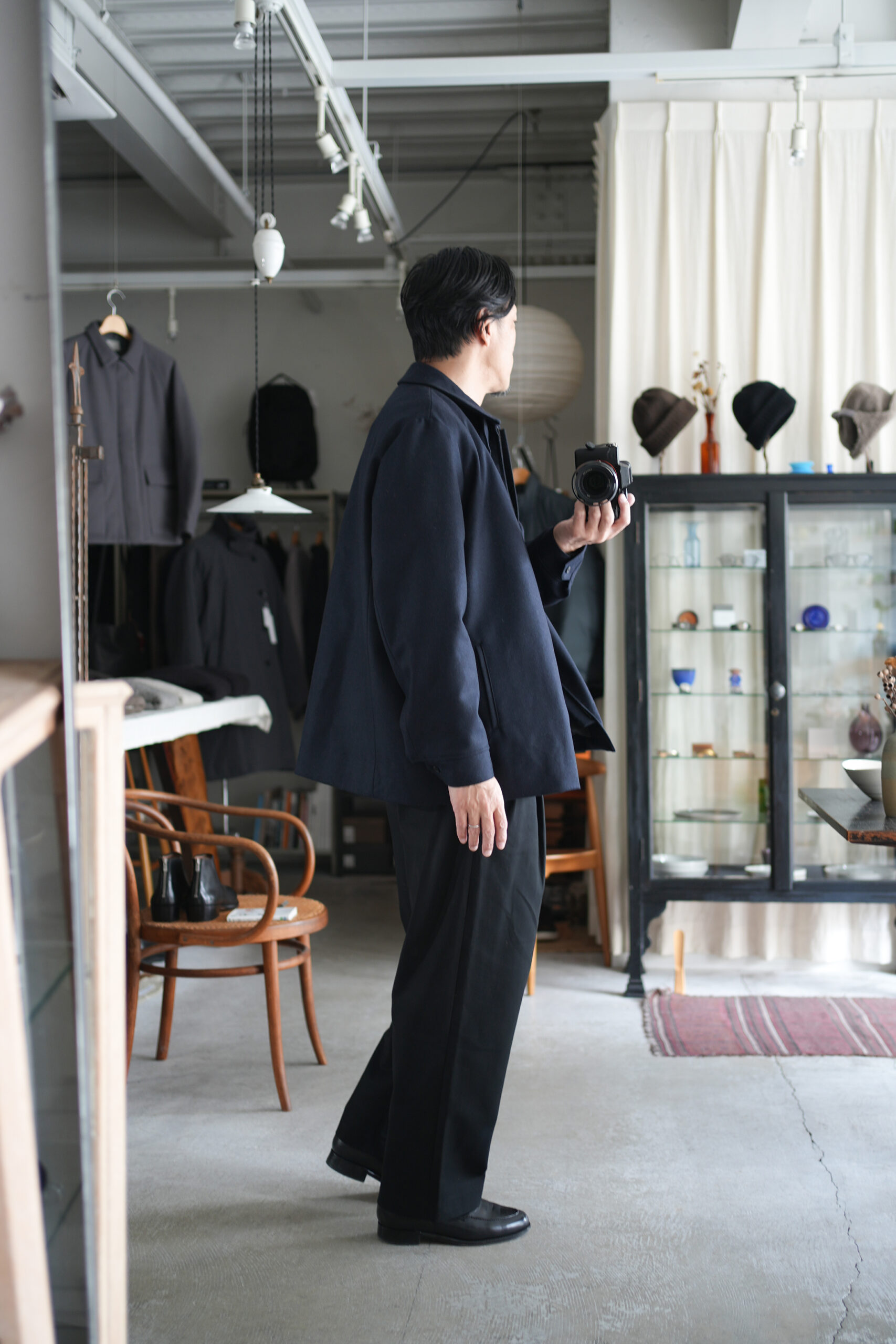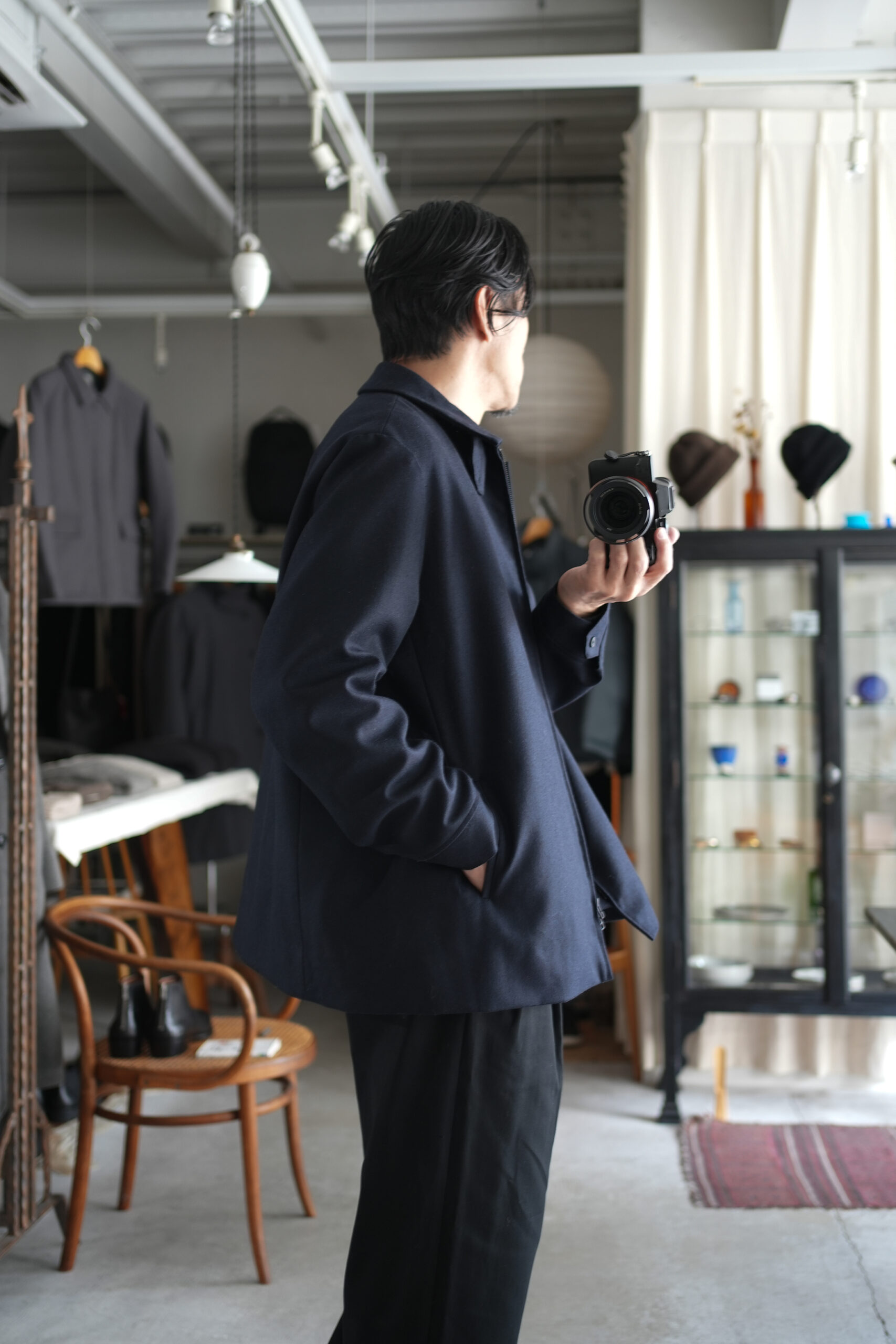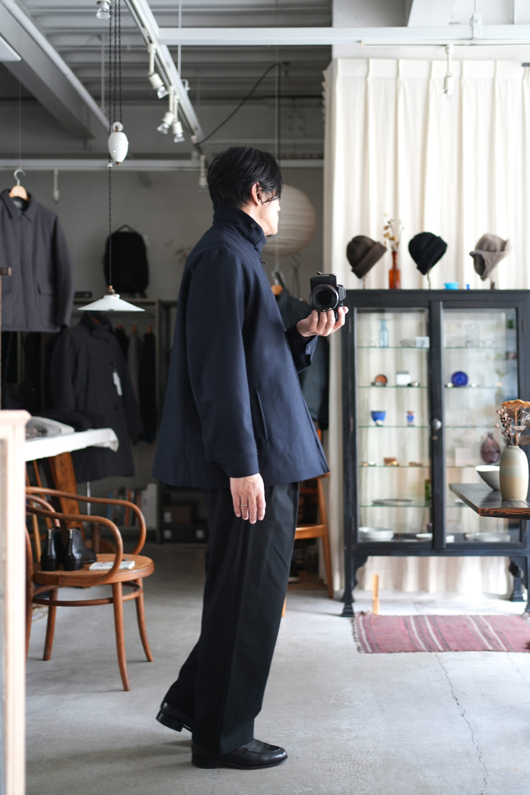 スタンダード高密フラノ生地、メルトンよりも軽量でアウター類には芯地をボンディングししっかりとしたハリと防風機能を高めています。ドリズラージャケット、ステンカラー、立ち襟仕様、総裏仕立て、中生地に高機能暖房素材コマサーモをキルティングで配す。