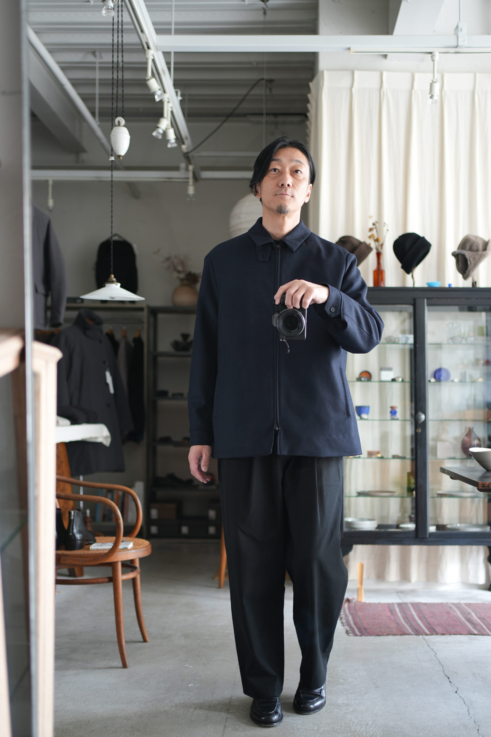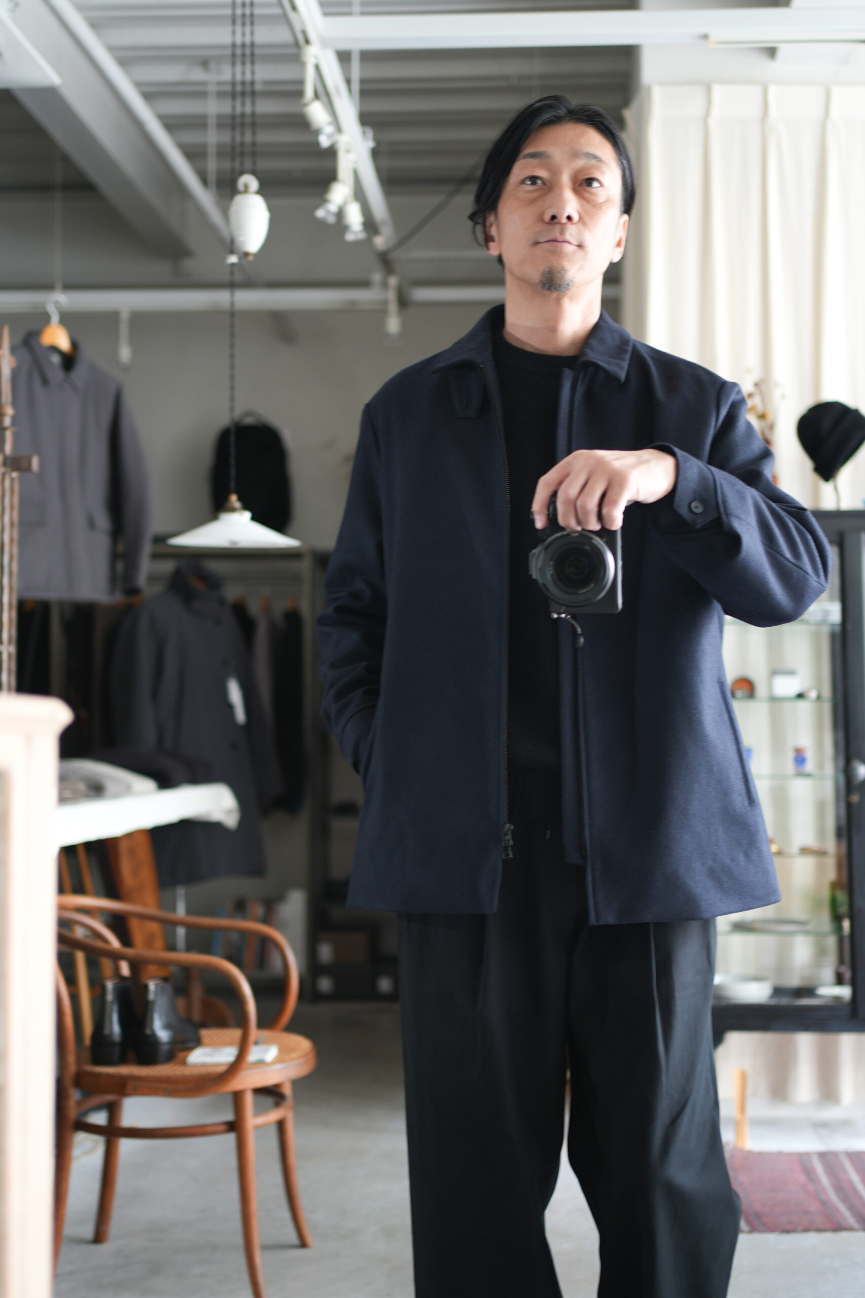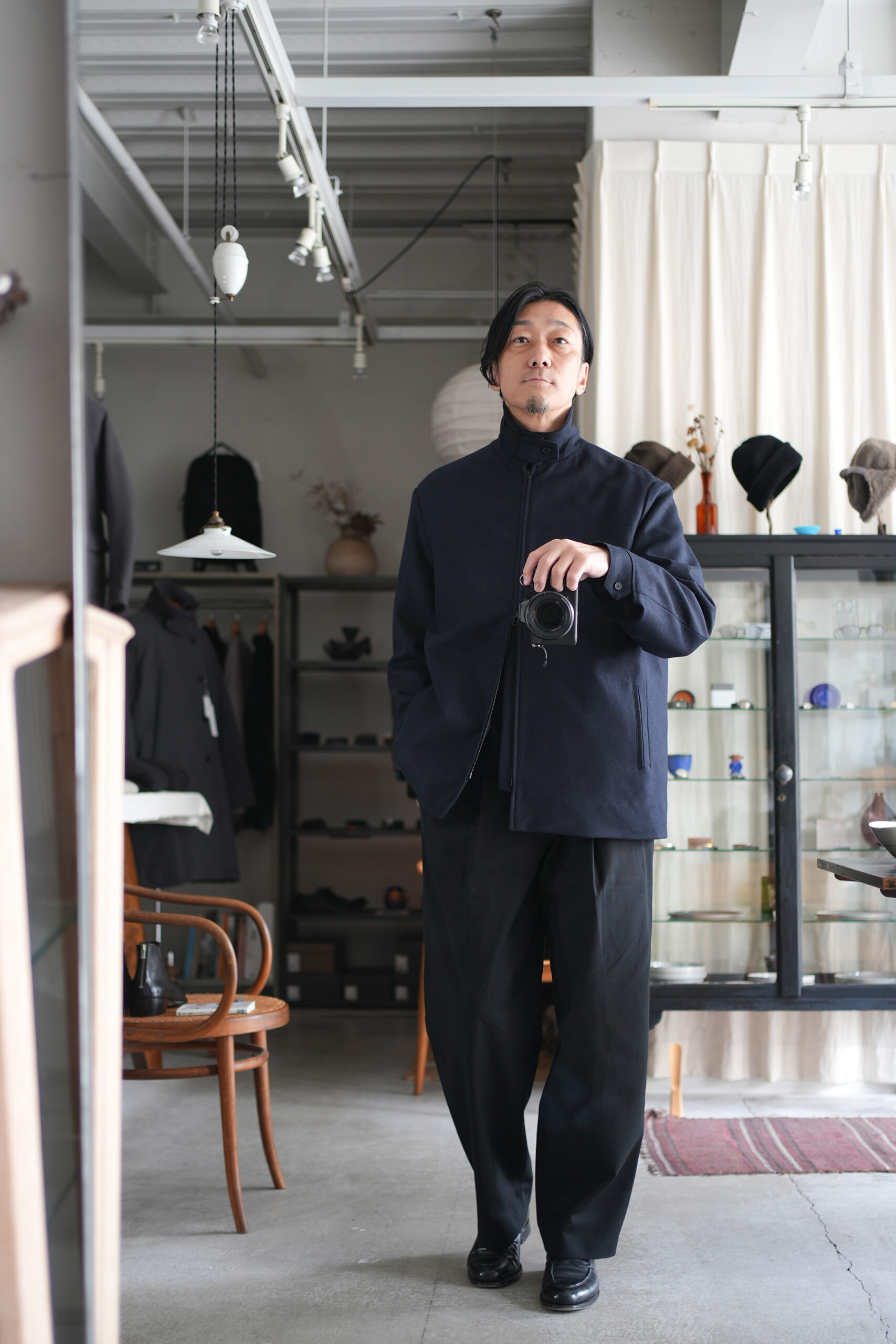 スタンダード高密フラノ生地、メルトンよりも軽量でアウター類には芯地をボンディングししっかりとしたハリと防風機能を高めています。ドリズラージャケット、ステンカラー、立ち襟仕様、総裏仕立て、中生地に高機能暖房素材コマサーモをキルティングで配す。