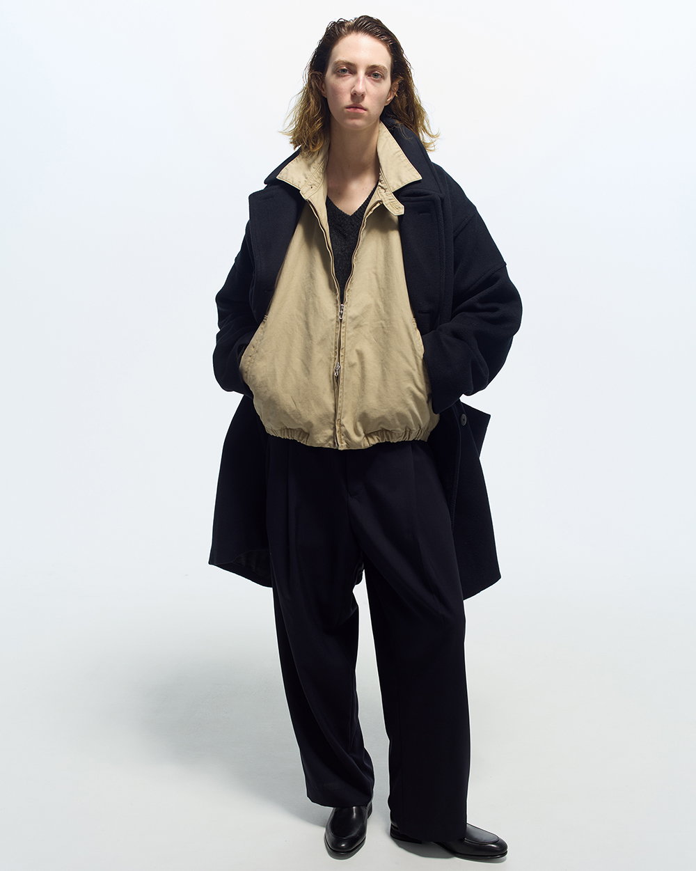ウールパイル素材を使用したトンビコート。重厚感のある目の詰まったパイルの素材感が特徴です。パイル生地を使用することにより、メルトンやツイードとはまた違う柔らかさを意識。トンビコートの様なマントライクにがばっと着られるシルエットのミドル丈ダブルコート。サイドに大きなポケットが配されたデザインも特徴的。