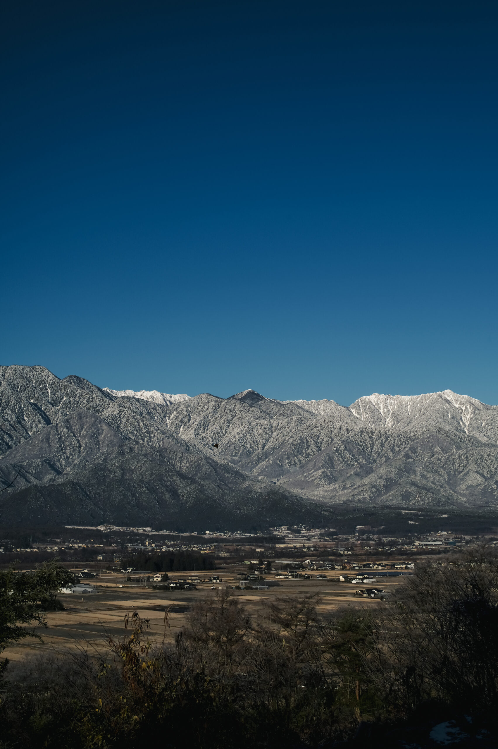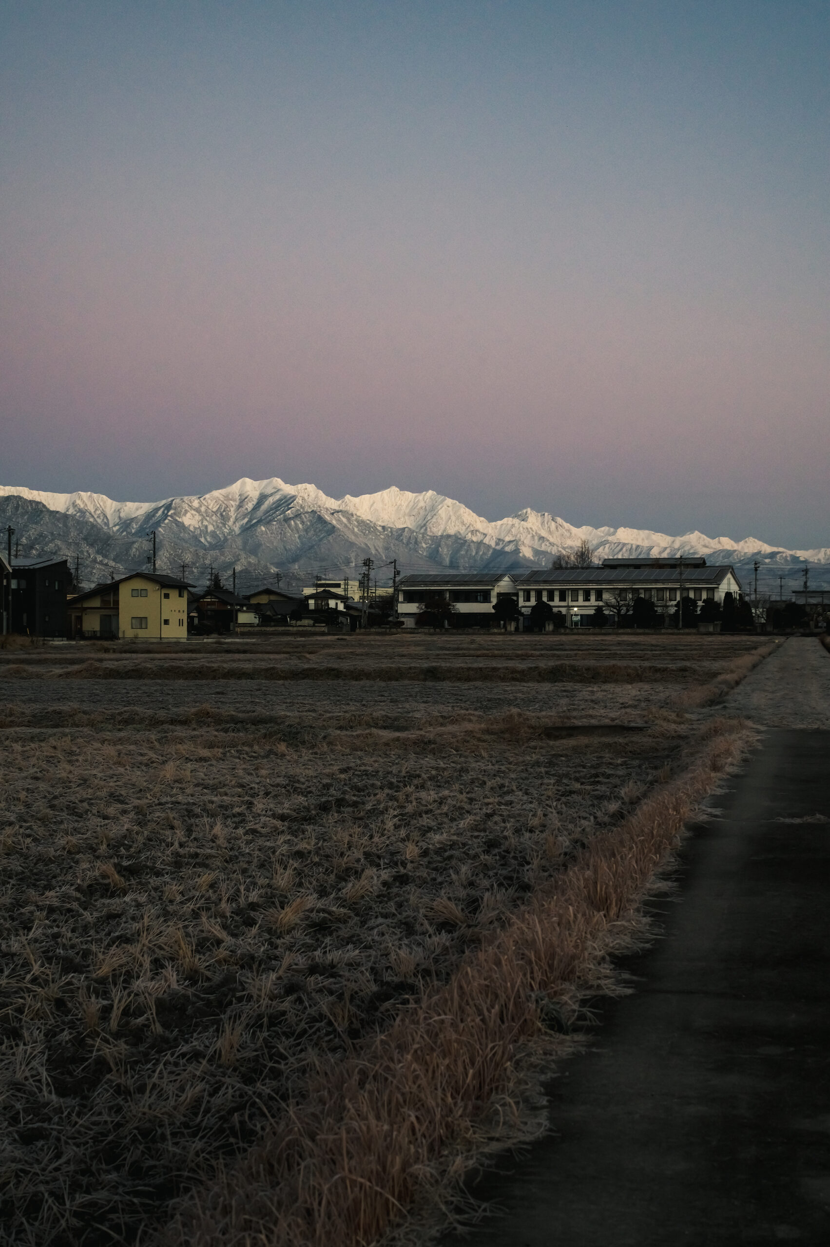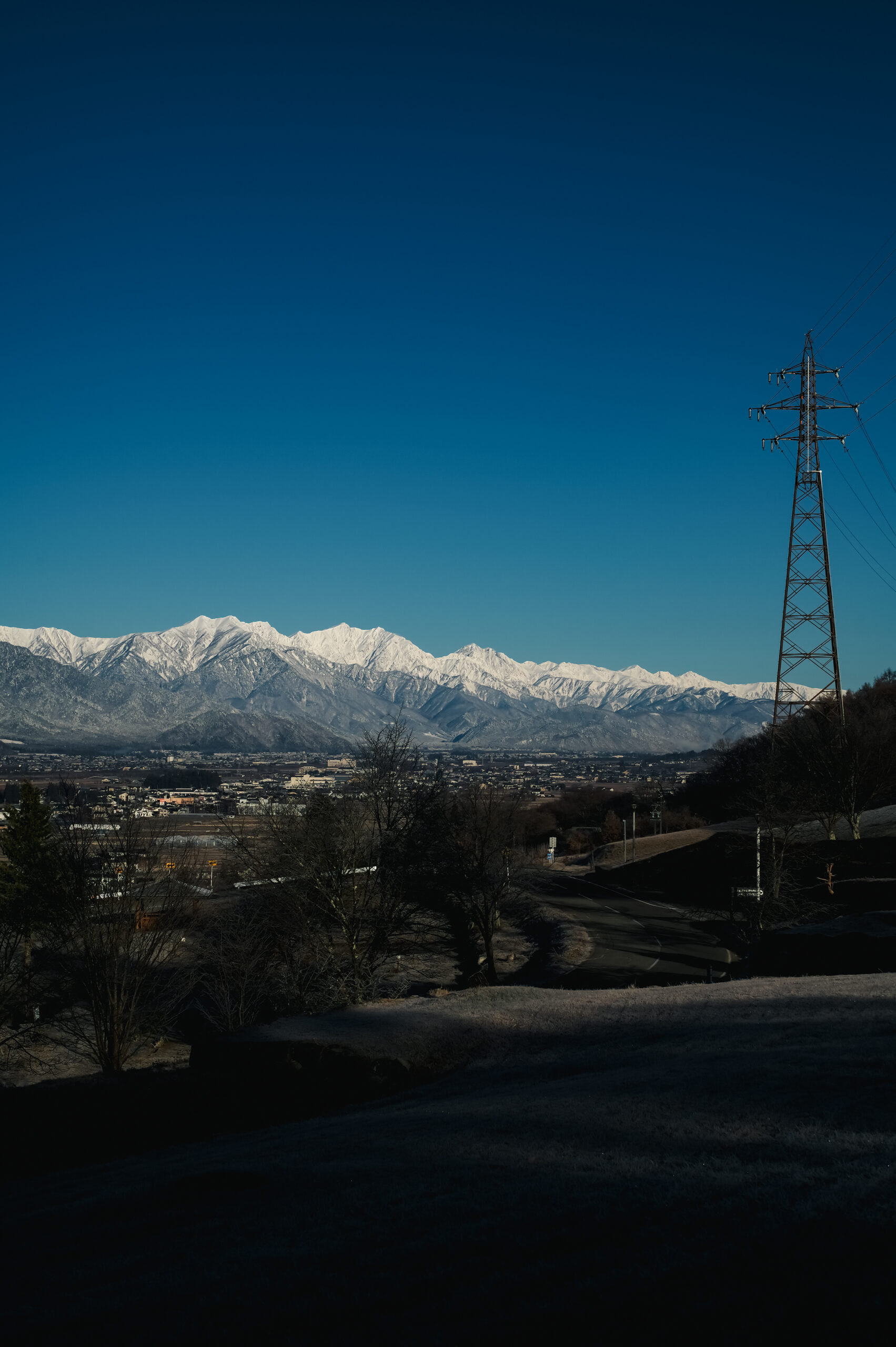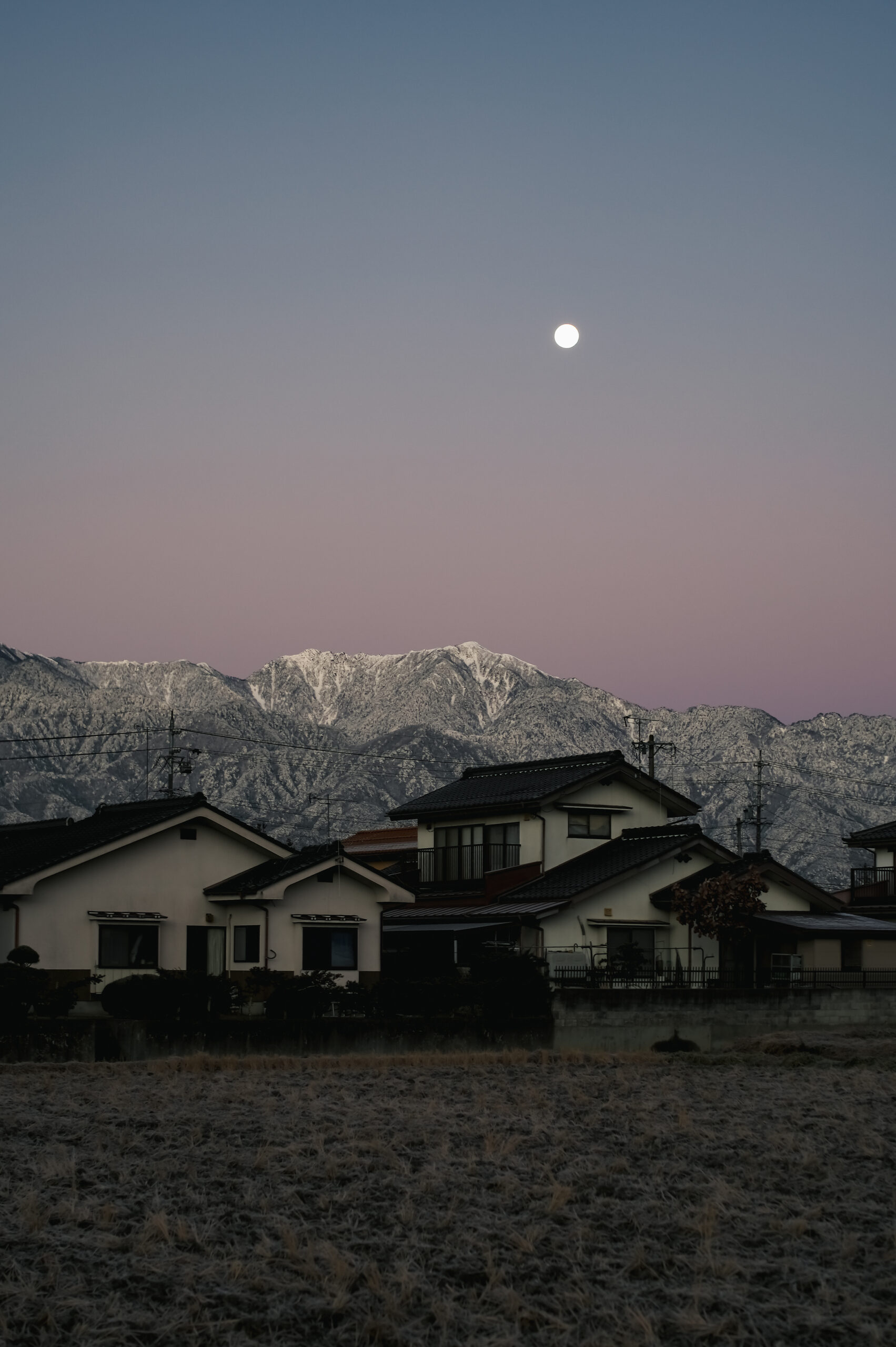快晴満月の夜からの黎明の刻、キリリと冷えた空気の白みと共に白き稜線が浮き立つ様。