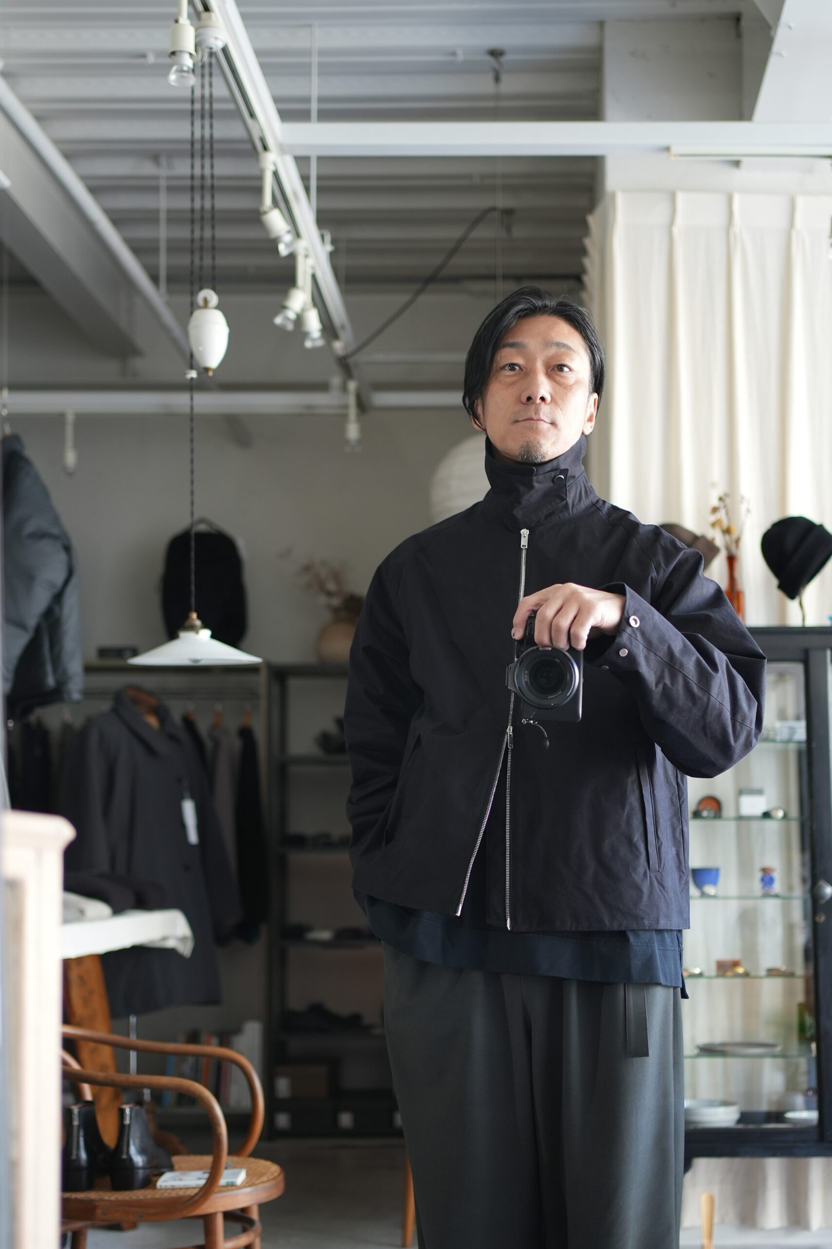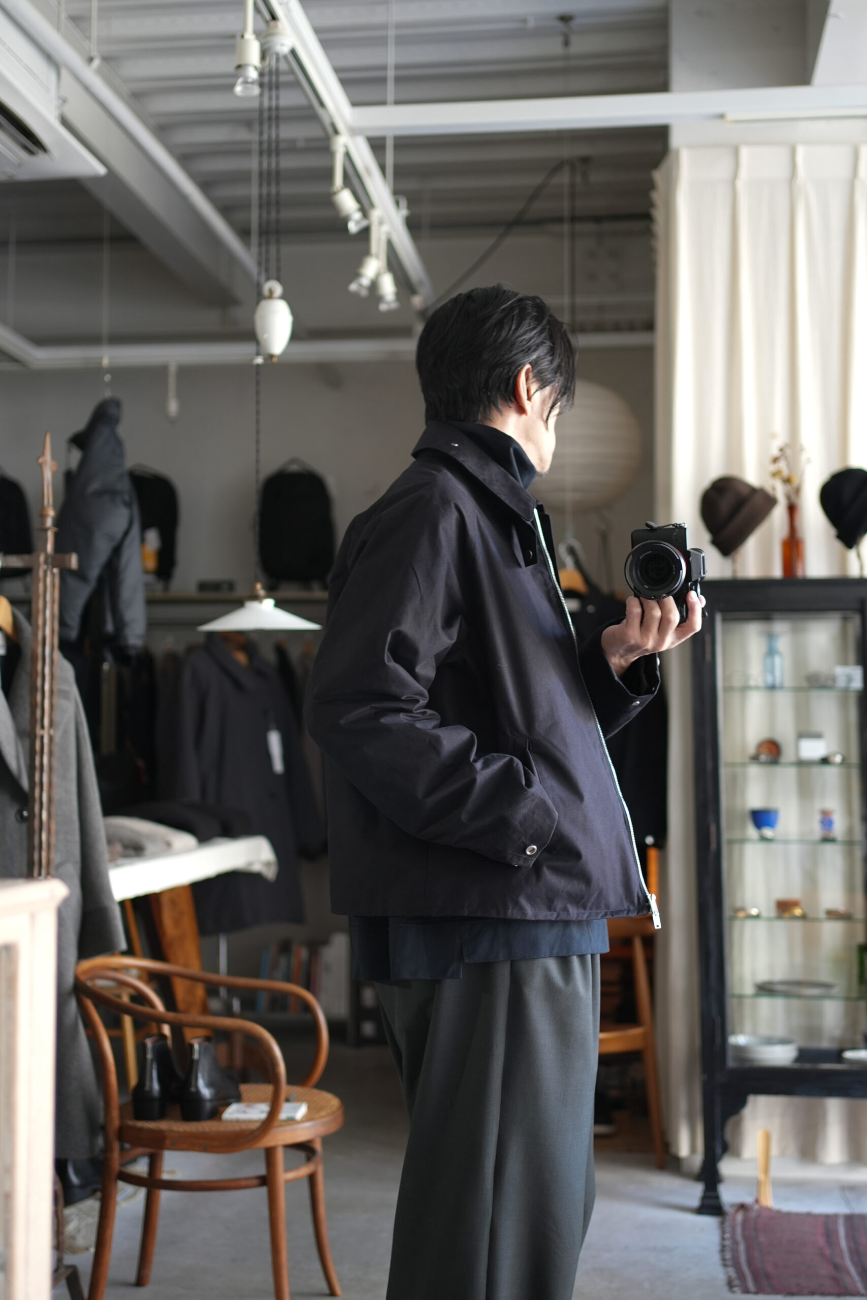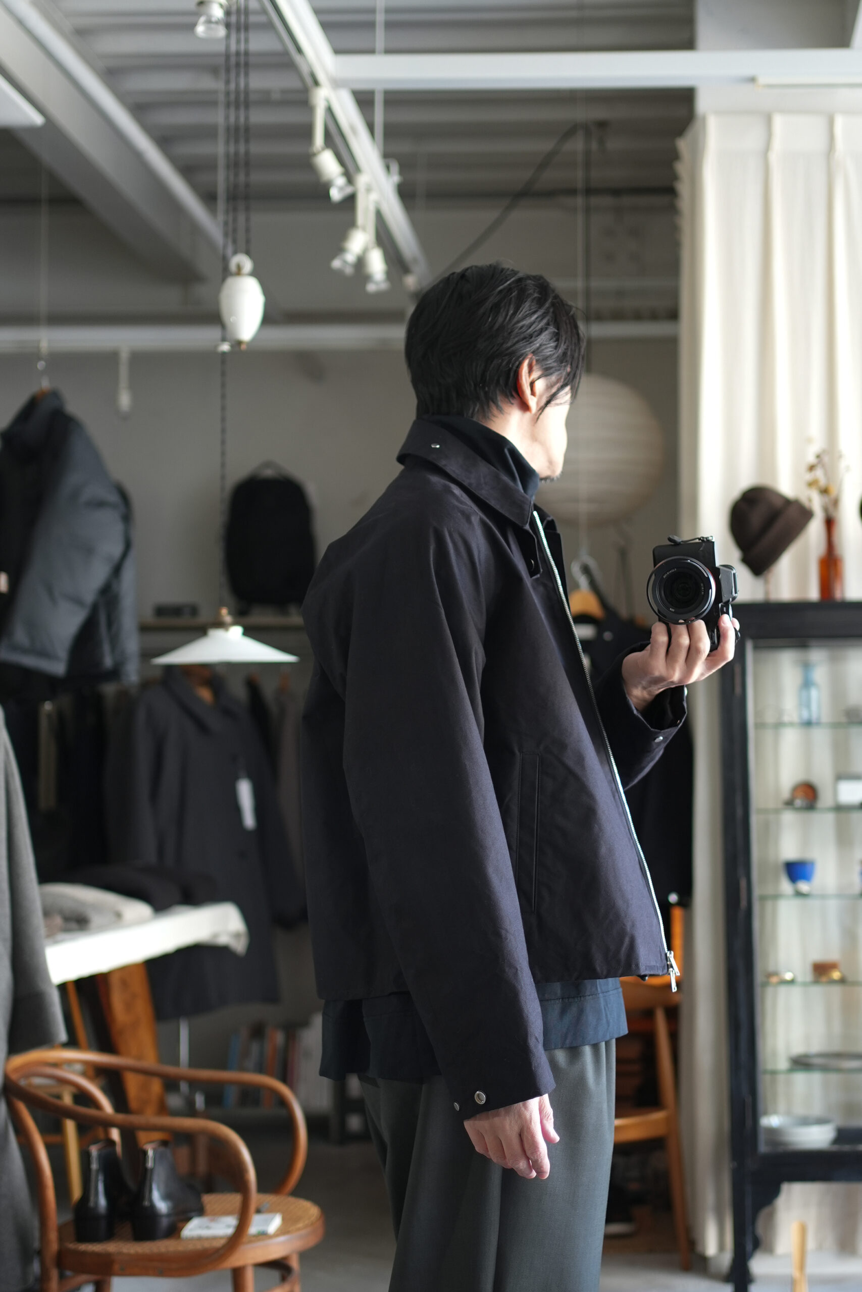 インド産のオーガニック超長綿を使用、80番手の繊細な糸を3本撚り合せた「三子(みっこ)撚り」の糸を生地を織る織機の限界を超えるほど超高密度に織り上げた極めてしっかりとしたコットン生地。光にかざしても明かりが透けないほど超高密で、天然繊維にも関わらず撥水性、耐水性が高いためちょっとした雨であれば浸み込む心配はありません。風を通しにくく、天然素材なのでゴム引きのように劣化もしなければ、オイルドの生地のようにニオイの心配もいりません。蒸れにくく、風も通しにくい生地です。はじめは板のような硬さがありますが、着用を重ねるごとに柔らかく体に馴染んで参ります。秋や春はこれ1枚で、冬はインナーダウンなどと組み合わせることで3シーズン着用が可能。四季折々の移動シーンに配慮したミニマルデザインのジップアップジャケット。
