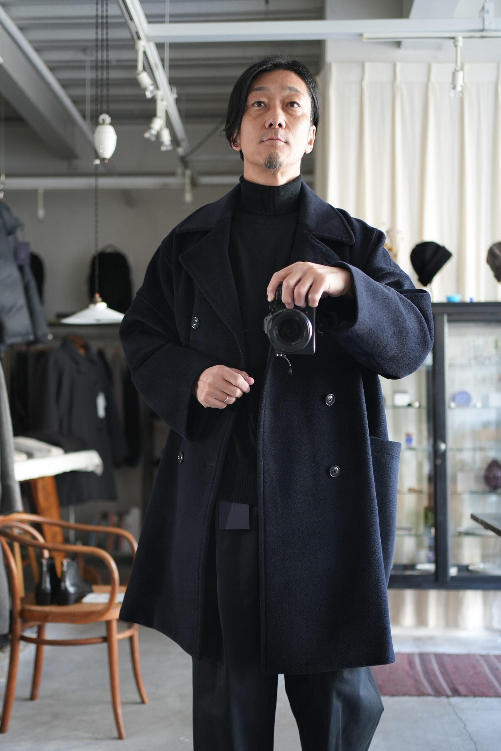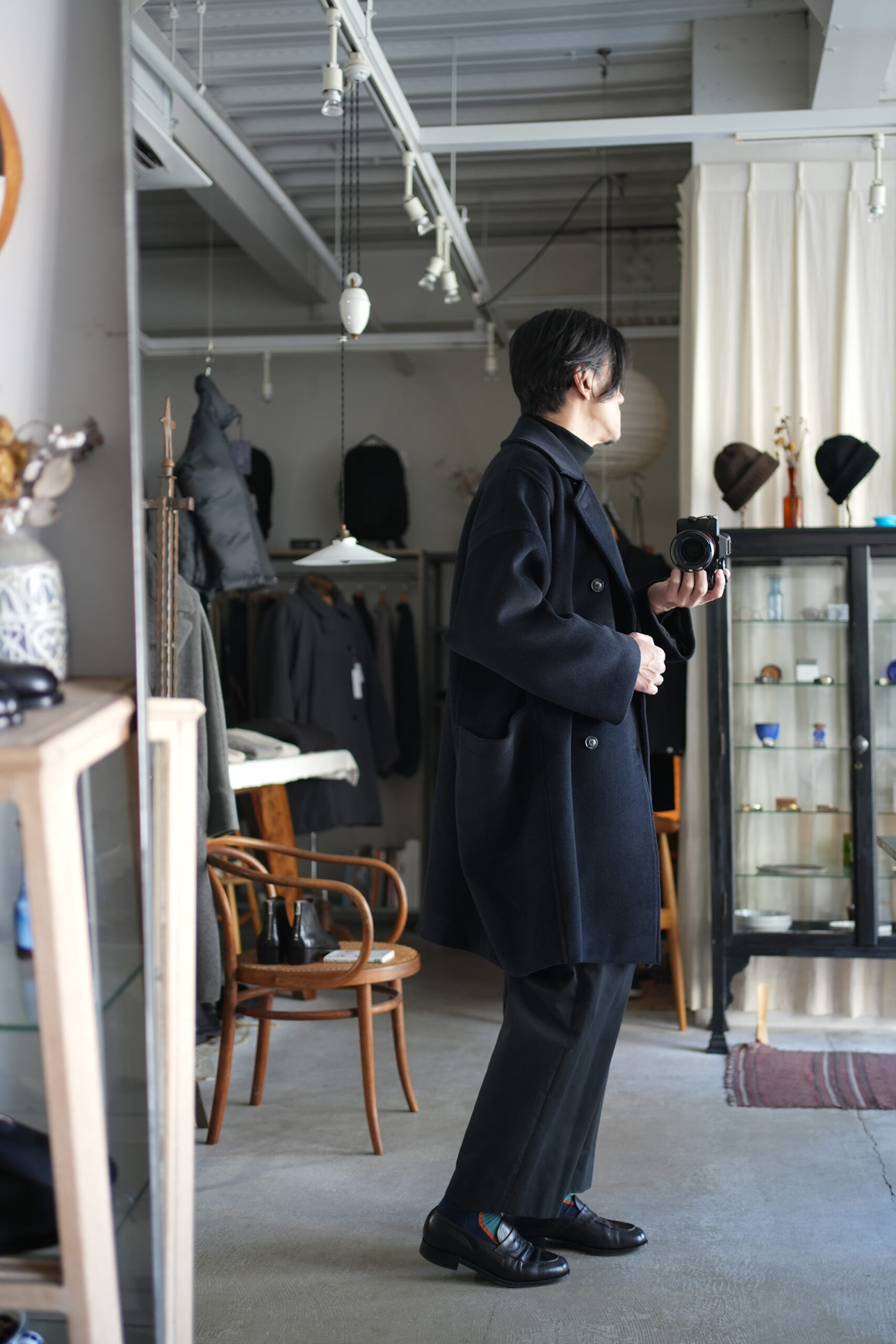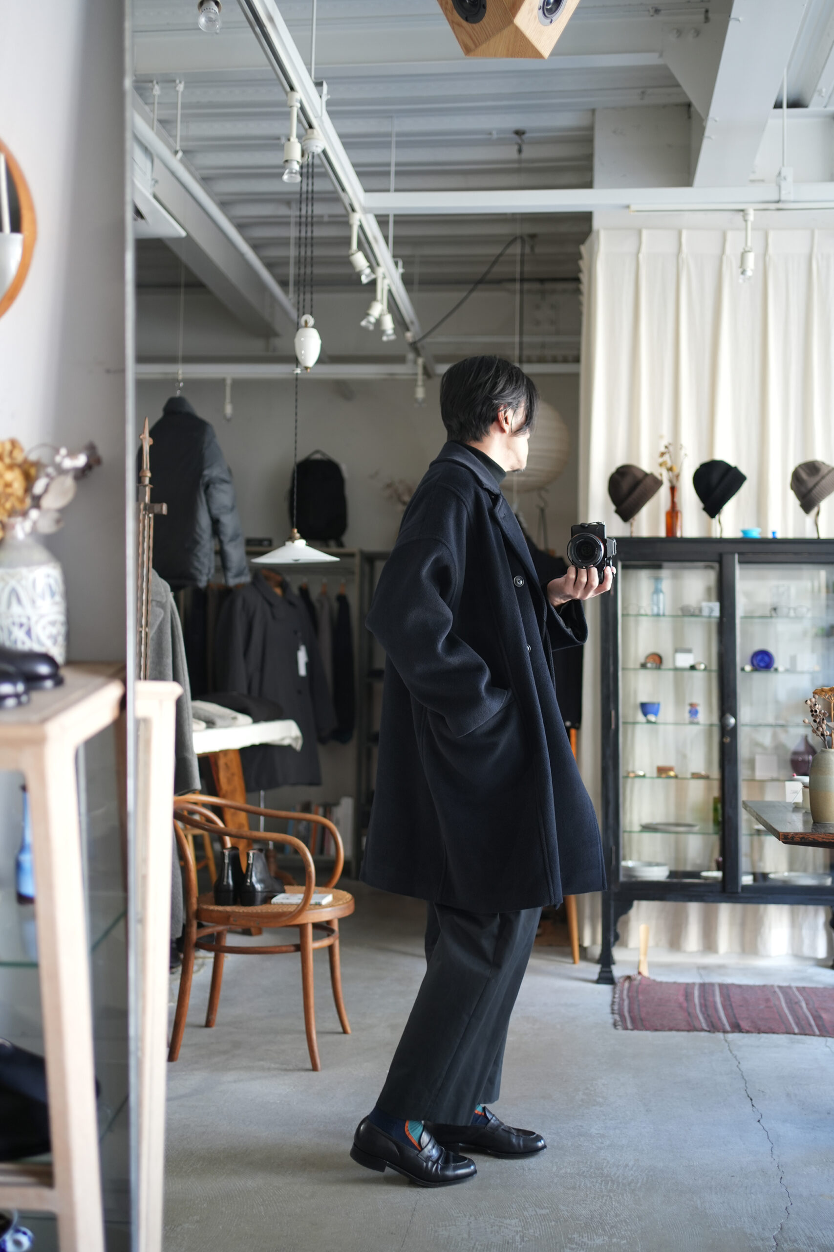 ウールパイル素材を使用したトンビコート。重厚感のある目の詰まったパイルの素材感が特徴です。パイル生地を使用することにより、メルトンやツイードとはまた違う柔らかさを意識。トンビコートの様なマントライクにがばっと着られるシルエットのミドル丈ダブルコート。サイドに大きなポケットが配されたデザインも特徴的。