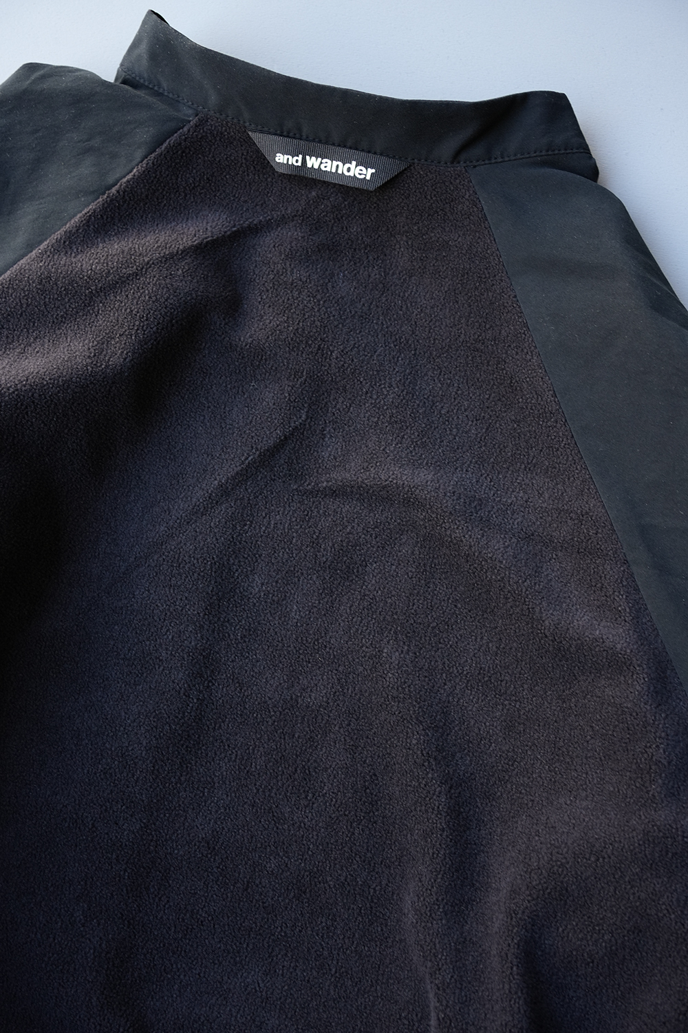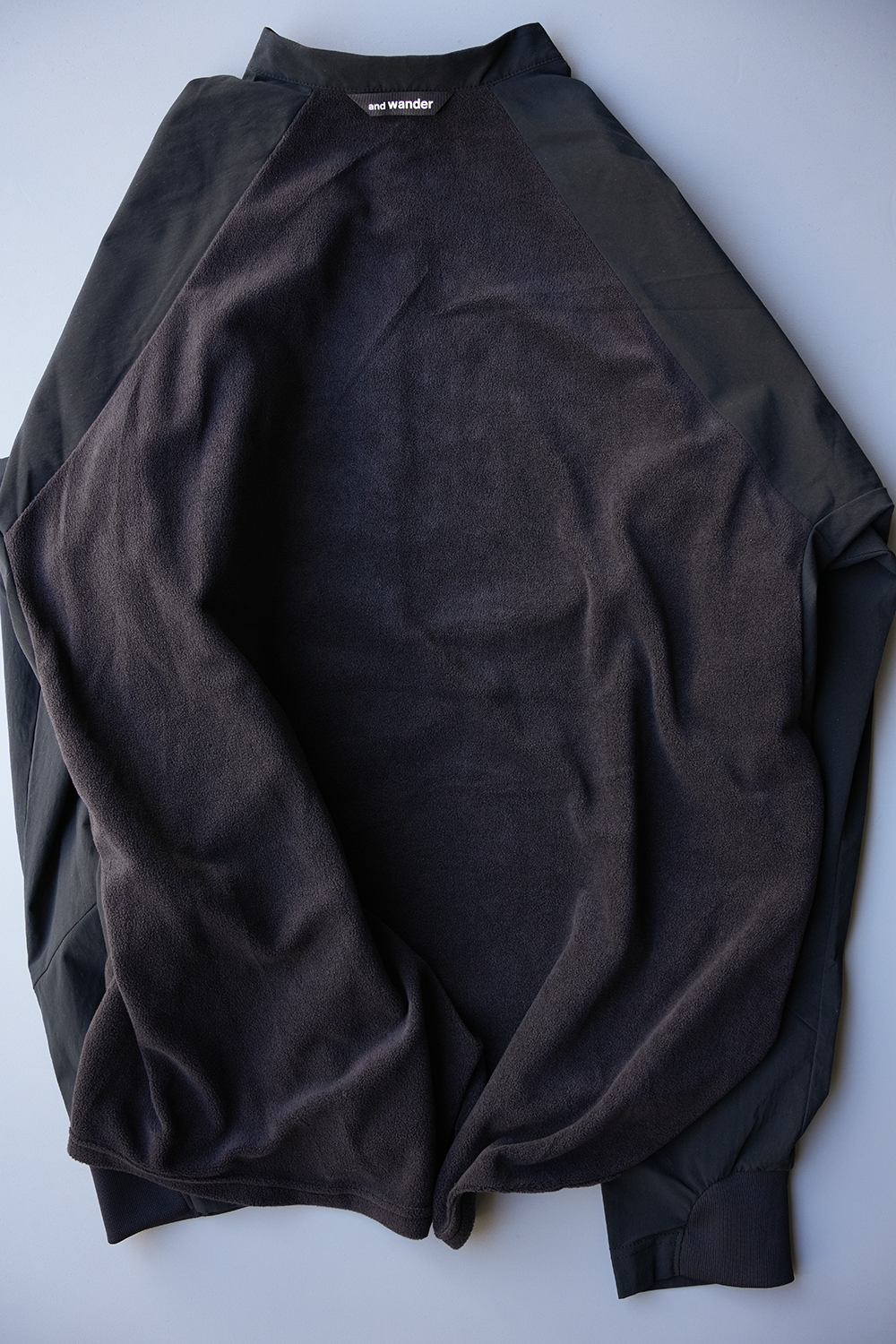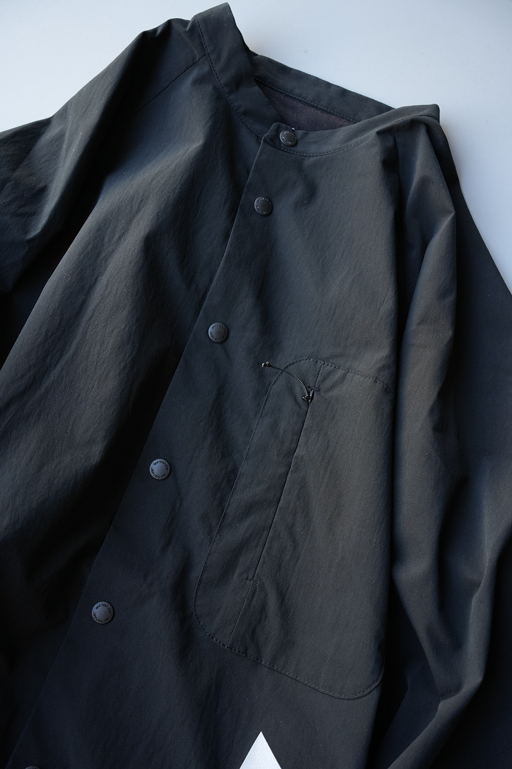 ストレッチ素材のメイン生地と、背中面に暖か蒸れないインビスタ社のサーモライトファブリックを使用した柔らかな風合いの薄手フリースを配したバンドカラーシャツ。