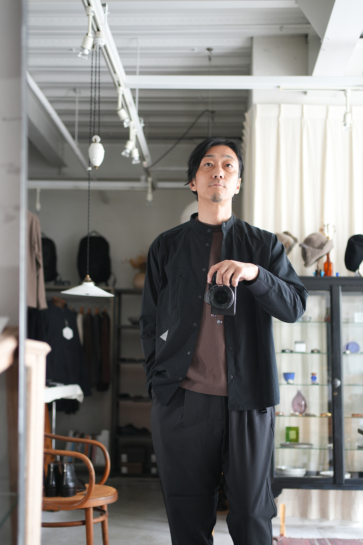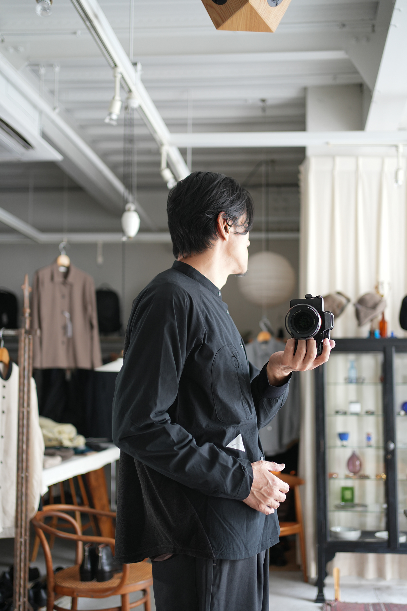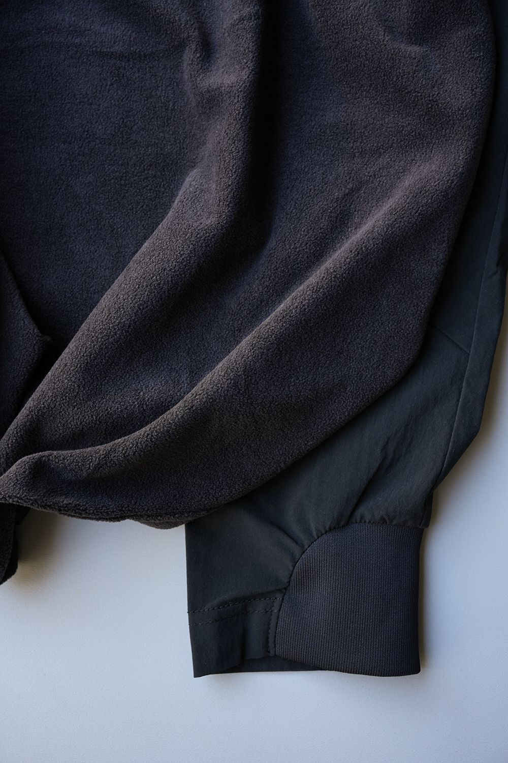ストレッチ素材のメイン生地と、背中面に暖か蒸れないインビスタ社のサーモライトファブリックを使用した柔らかな風合いの薄手フリースを配したバンドカラーシャツ。