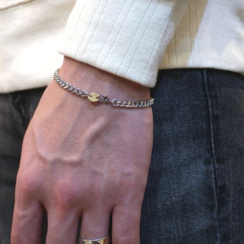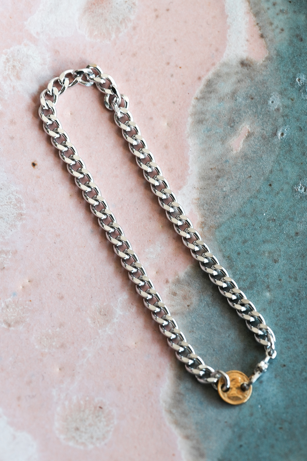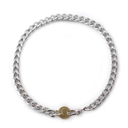 コインチャームのシンプルチェーンブレス。チェーンは喜平チェーンを使用。ブレスのエンド部分に幸せのコイン6ペンスをイメージした留め具付属(コイン留め具は真鍮ゴールドコーティング)。ベースチェーンはシルバー925。キレイ目のプラチナなどに処理されるロジウムコーテイングタイプ。