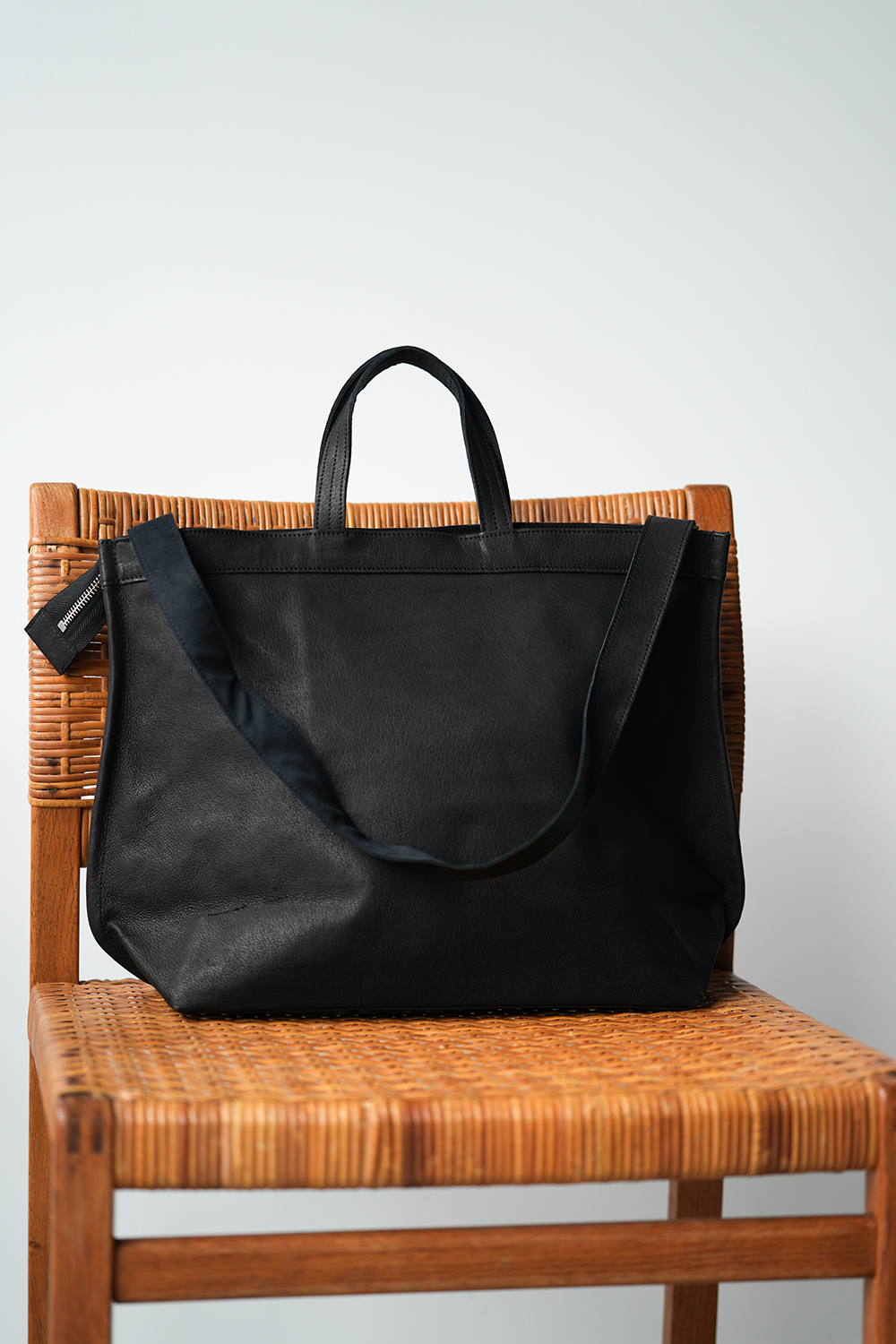 日常やビジネスシーンに必要なものを、たっぷりと持ち運べる「ベーシックジップトートM 2way」。サイズは、A4の書類やノートPC、ペットボトル、弁当箱、化粧ポーチ、本やヘッドホンなどをたっぷり持ち運べて、1泊2日の旅行もまかなえるほど。くったりとやわらかいため、くるっと丸めてキャリーケースに入れておくこともできます。底マチがあり自立しますが、ノートPCなどの重いものを入れるときは、底板を入れるとさらに安定します。また、内ポケットが両側についているので、財布やスマホ、鍵など、大きなバッグのなかで散らかりがちなものも整理できます。口元にはファスナーが付いており、バッグに深さもあるので、電車や自転車に乗るときも安心。ファスナーの端は少し長めに。閉める際に引き手の役割を担います。必要ない場合は、バッグに仕舞うとすっきりします。ファスナーはあえて開けっぱなしにして持っても素敵。金具の存在感が、デザインとしても機能するのです。ショルダーストラップは、幅と厚みのある平手タイプ。肩にかけたときの安定感もひとしおですが、なによりこだわったのは、トートバッグとして手に提げたときの見え方を意識した、絶妙な長さ。手に提げて使っていて、とっさに両手を空けたいときも、サッと肩に掛けられます。ハンドルとショルダーストラップに、伸びを防止するための裏張りをしてあります。チラッと覗くその配色もいいのだと、RENのスタッフは口を揃えます。