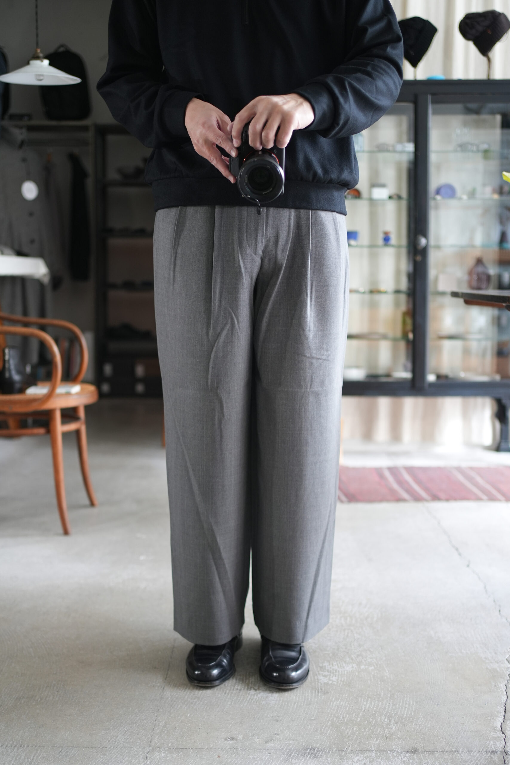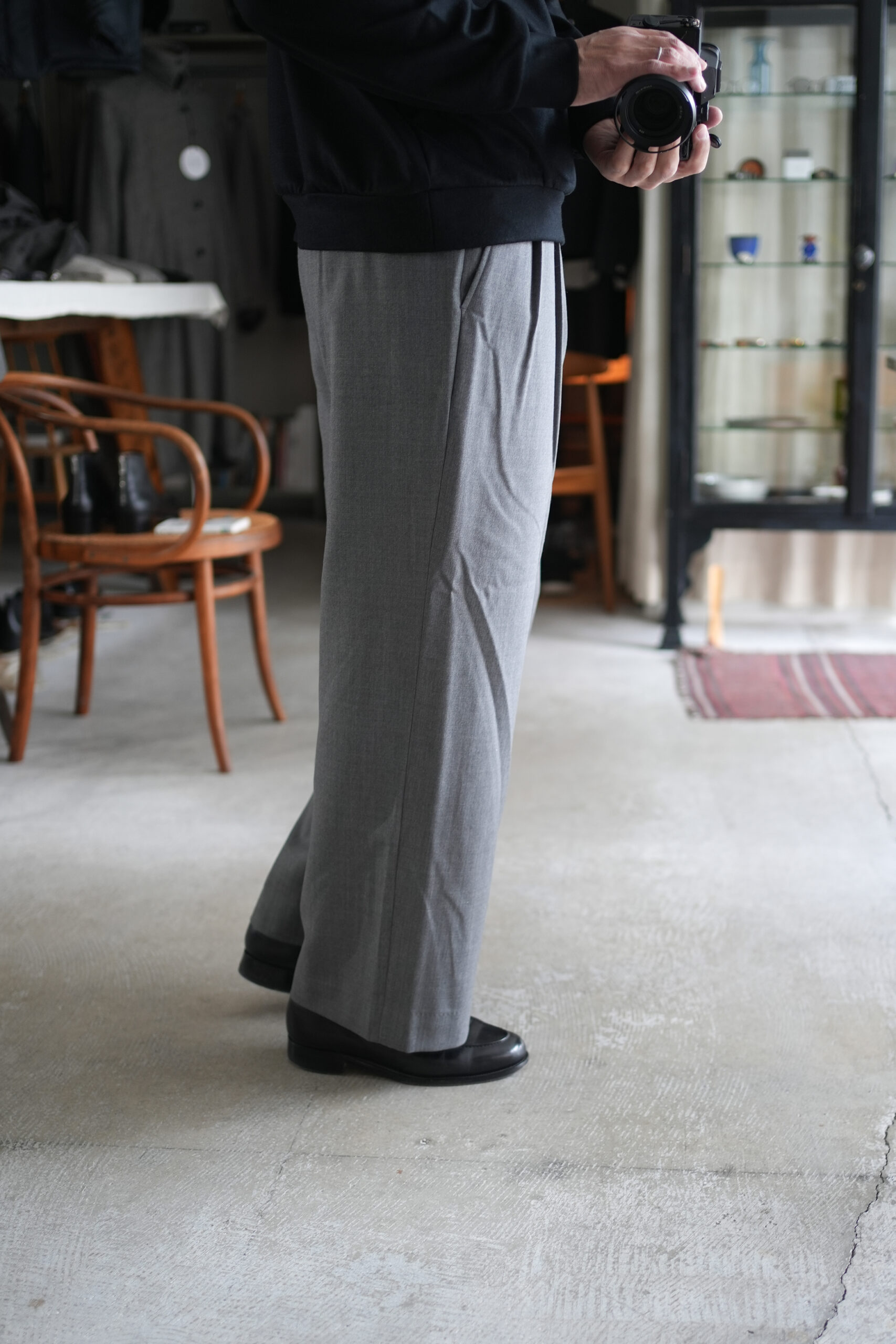 ウールの風合いとポリエステルの軽さ、シワになりにくい扱い易さのあるギャバジン素材のワイドストレートトラウザー。トップ糸を使用することで奥行きある表情の生地感です。ベルトループを省いたサイドアジャスター仕様、ご自宅での洗濯も可能なイージーケアも嬉しい点。