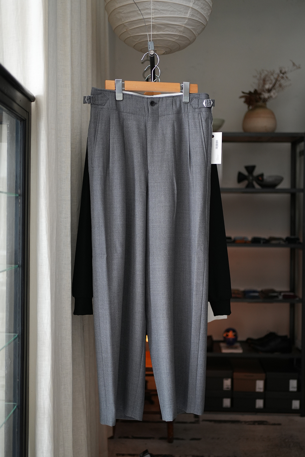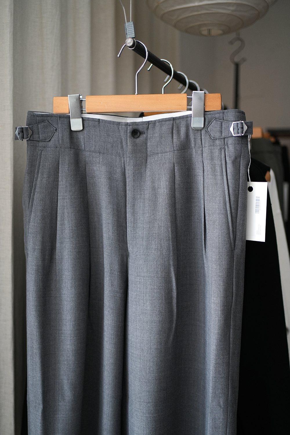 ウールの風合いとポリエステルの軽さ、シワになりにくい扱い易さのあるギャバジン素材のワイドストレートトラウザー。トップ糸を使用することで奥行きある表情の生地感です。ベルトループを省いたサイドアジャスター仕様、ご自宅での洗濯も可能なイージーケアも嬉しい点。