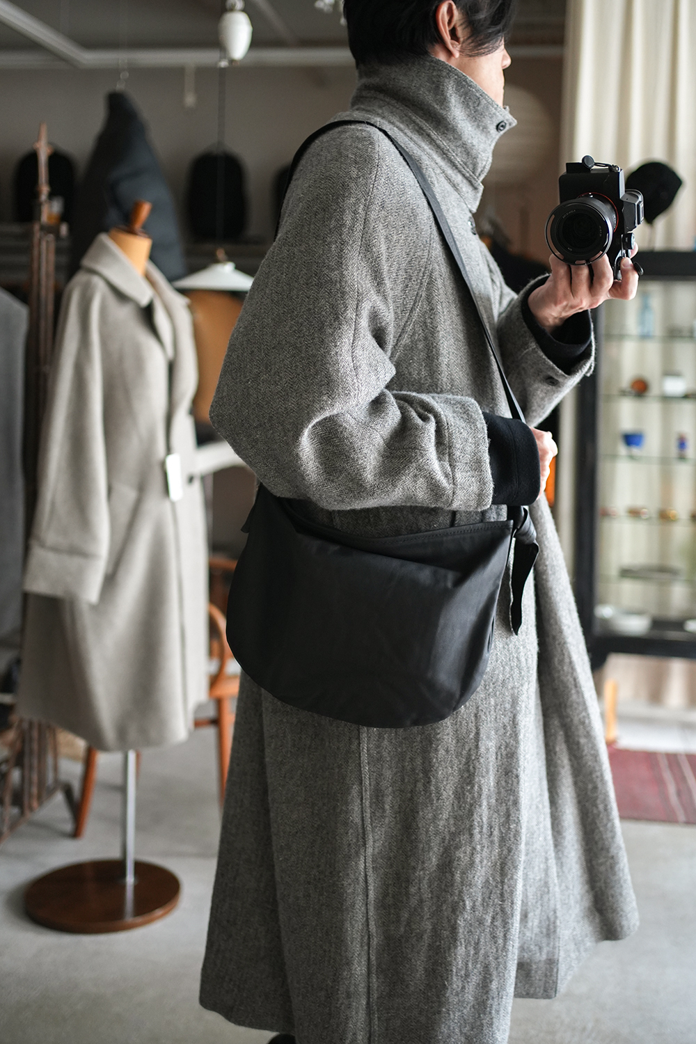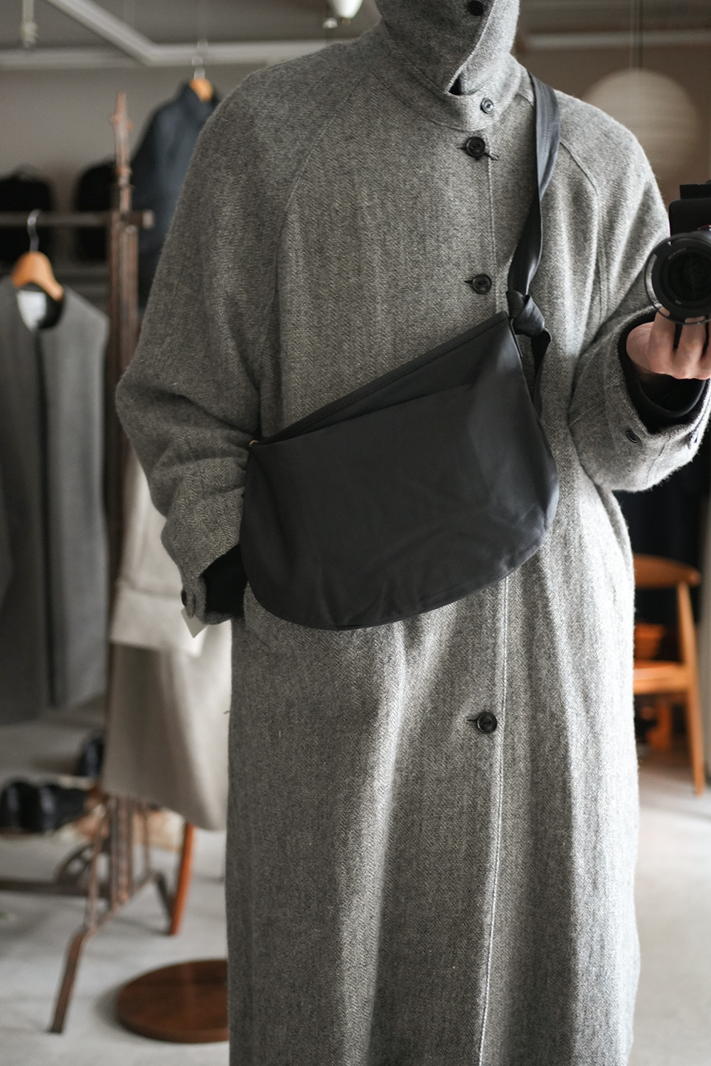 必要最小限の持ち物に、季節折々の“もうひとつ”を足す。やぎ革・ベアーのよさが引き立つようからだにくったりと沿うサイズはキープしながら日常使いに適した小ぶりのサイズに。荷物を入れるとぷくっと膨らむラウンドシルエット。マチはありませんし、角張ったものを入れるのには適しませんが、生地がくったりとやわらかいので、嵩張るものは意外と得意。財布とスマホなど、普段の持ち物は少なめ。でもそこに、夏なら着替えのシャツやサングラス、冬ならマフラーなど、季節折々が楽しくなるプラスαを入れられるくらい、ほんのり余裕があります。ショルダーストラップは、自分で結んで自由に調整するタイプで、体型を選ばず使えます。ぐっと締めて反対側の根元で結び、ハンドバッグのように持つのも素敵です。くったりとした質感、自然な風合いにこだわった、オリジナルゴートスキンです。きめこまかなシボが特徴のやぎ革は、強靭で型崩れしにくく、摩擦にも強い。いっぽうで、やわらかく手馴染みのよい革としても親しまれます。天然シボを活かすために、最小限の染料とオイルで鞣してあります。個体差やシボのムラも加工しすぎず、自然のゆらぎもあえてそのまま届けたいという想いからです。温度の低い場所で保管していると、表面にオイルが白く浮き出てくることがありますが、やわらかい布で軽く拭き取るか、ドライヤーなどで温めればオイルが溶けて自然と馴染んでいきます。製品に角ばったものや重たいものを入れると、その形が表面に浮き出てしまうこともあります。裏を返せば、なにを入れるかによって、自分の暮らしの“あと”が足されるということ。愛着にも、きっとつながります。