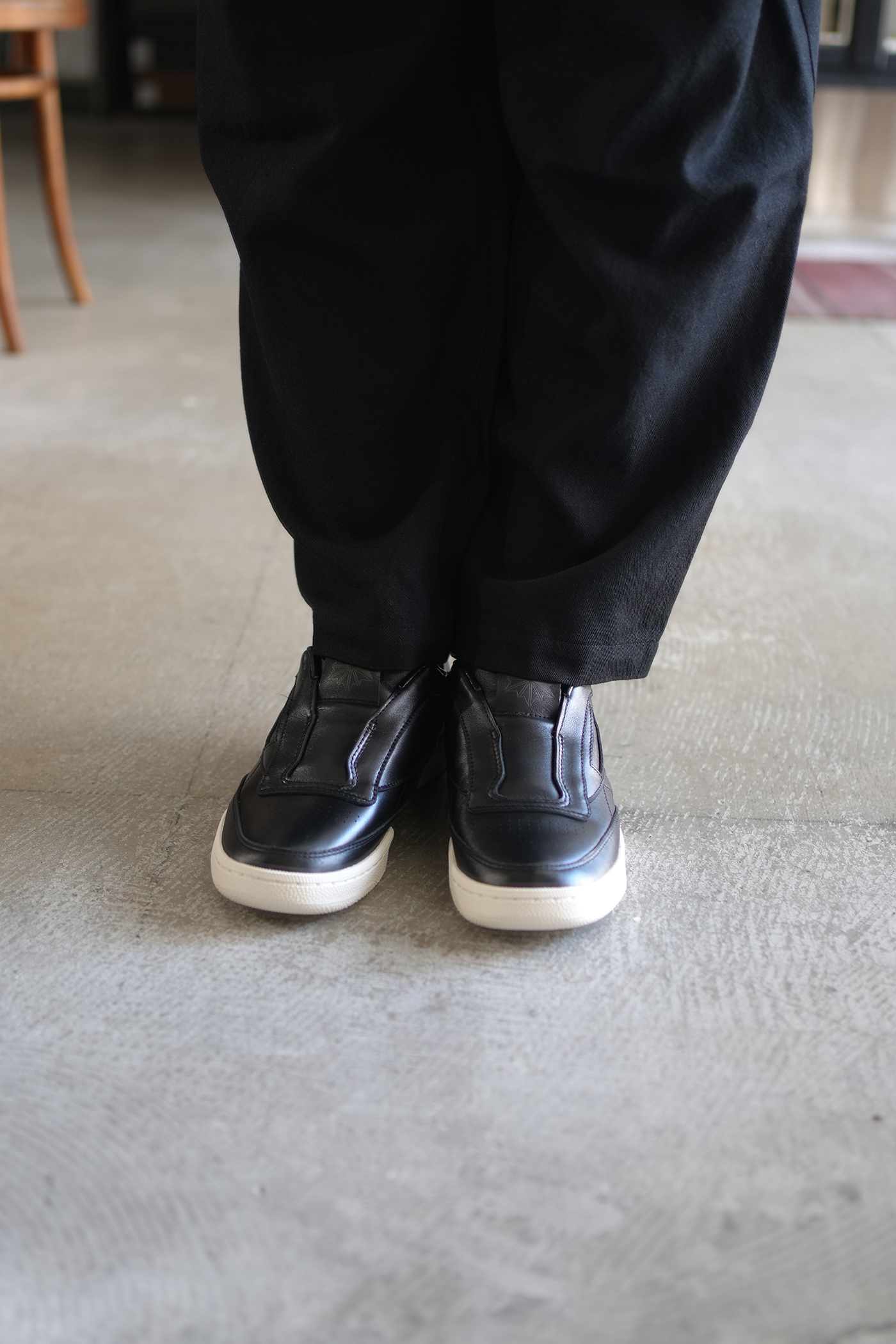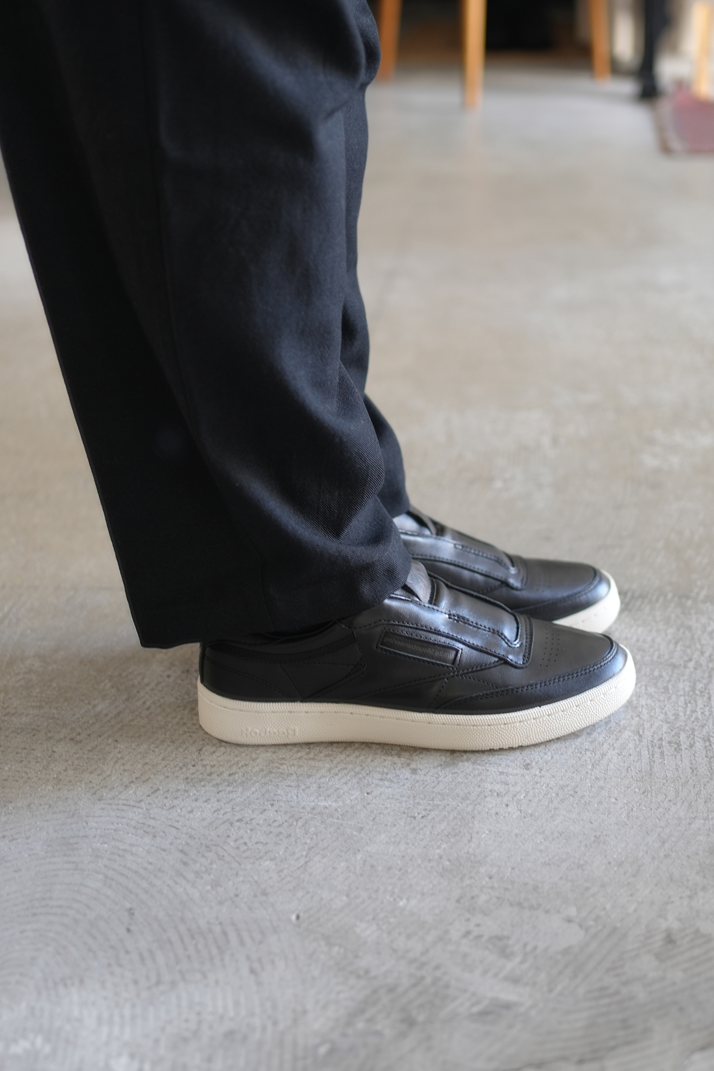 高級感のある上質なカウレザーを採用.。「服を着るフィールドはすべてアウトドア」というコンセプトを掲げ、デザイン、実用性、技術を融合させた独自のスタイルを追求する、”相澤陽介”氏のブランド”WHITE MOUNTAINEERING(ホワイトマウンテニアリング)”。”REEBOK(リーボック)”との第3弾となるコラボレーションでは、生誕40周年を迎える不朽の名作をベースに採用。1985年、テニスシューズ”CLUB CHAMPION(クラブ チャンピオン)”として誕生した、”CLUB C(クラブ C)”。そのシンプルで汎用性の高いデザインは、コートの枠を超え、カジュアルシューズとして絶大な人気を博してきた。今回のコラボレーションでは、そのクラシックなシルエットを、ミニマルなスリッポン仕様へと大胆にアレンジ。アッパーには、艶やかで上質なブラックのカウレザーを贅沢に使用し、ラグジュアリーな雰囲気を創出している。サイドのウィンドウ部分には、”REEBOK”のロゴに代わり”WHITE MOUNTAINEERING”の文字を配置。ソールユニットはクリーンなホワイトで切り替えることで、全体のデザインをシャープに引き締めている。両者の哲学が見事に融合した、洗練された大人のための一足が完成した。着脱の容易さ、フィッティング性、グリップ性能に優れています。アッパーとヒールにそれぞれWMロゴをレイアウトしました。シンプルながらもWMらしさのある、日常使いのしやすい一足です。